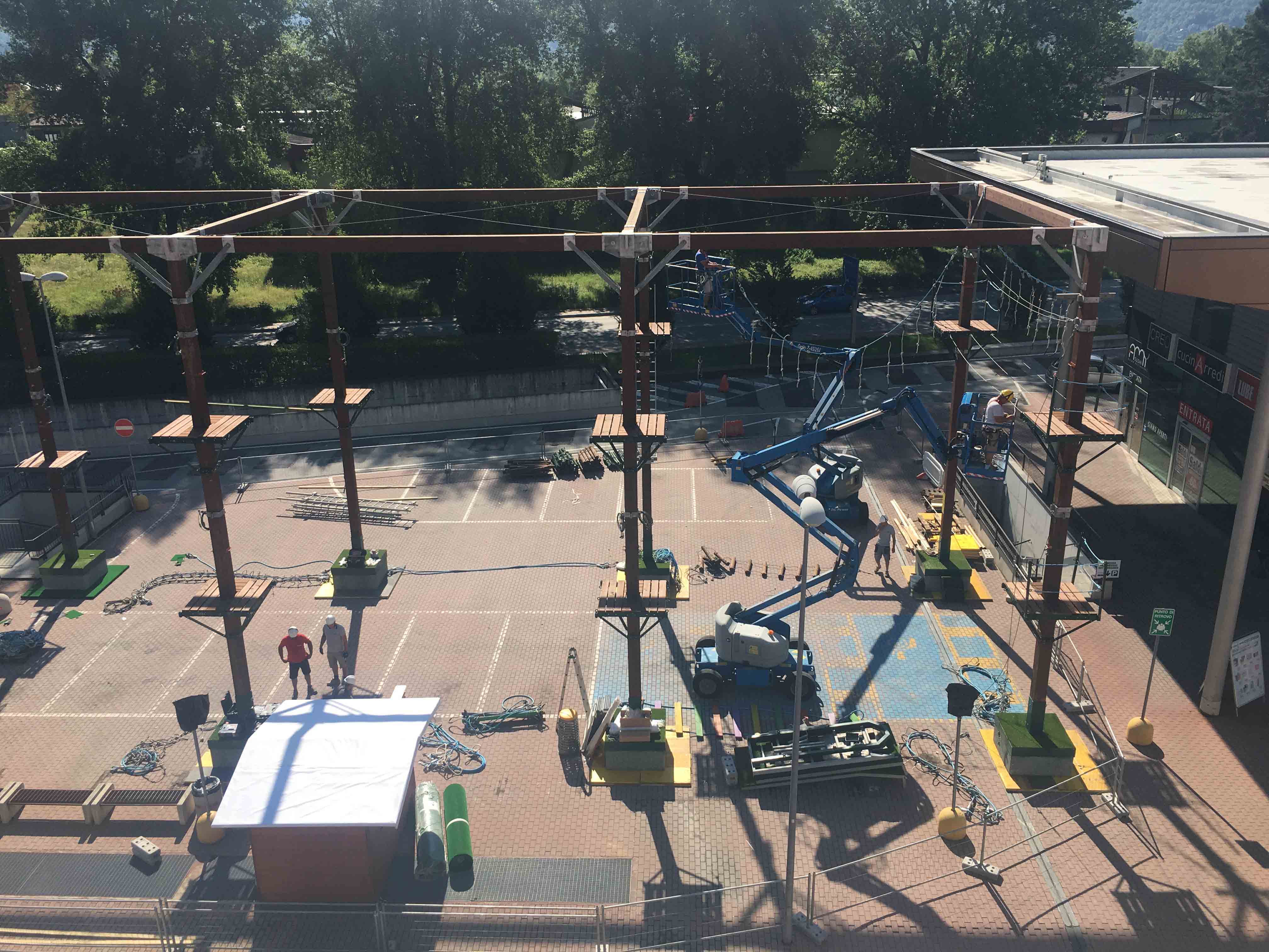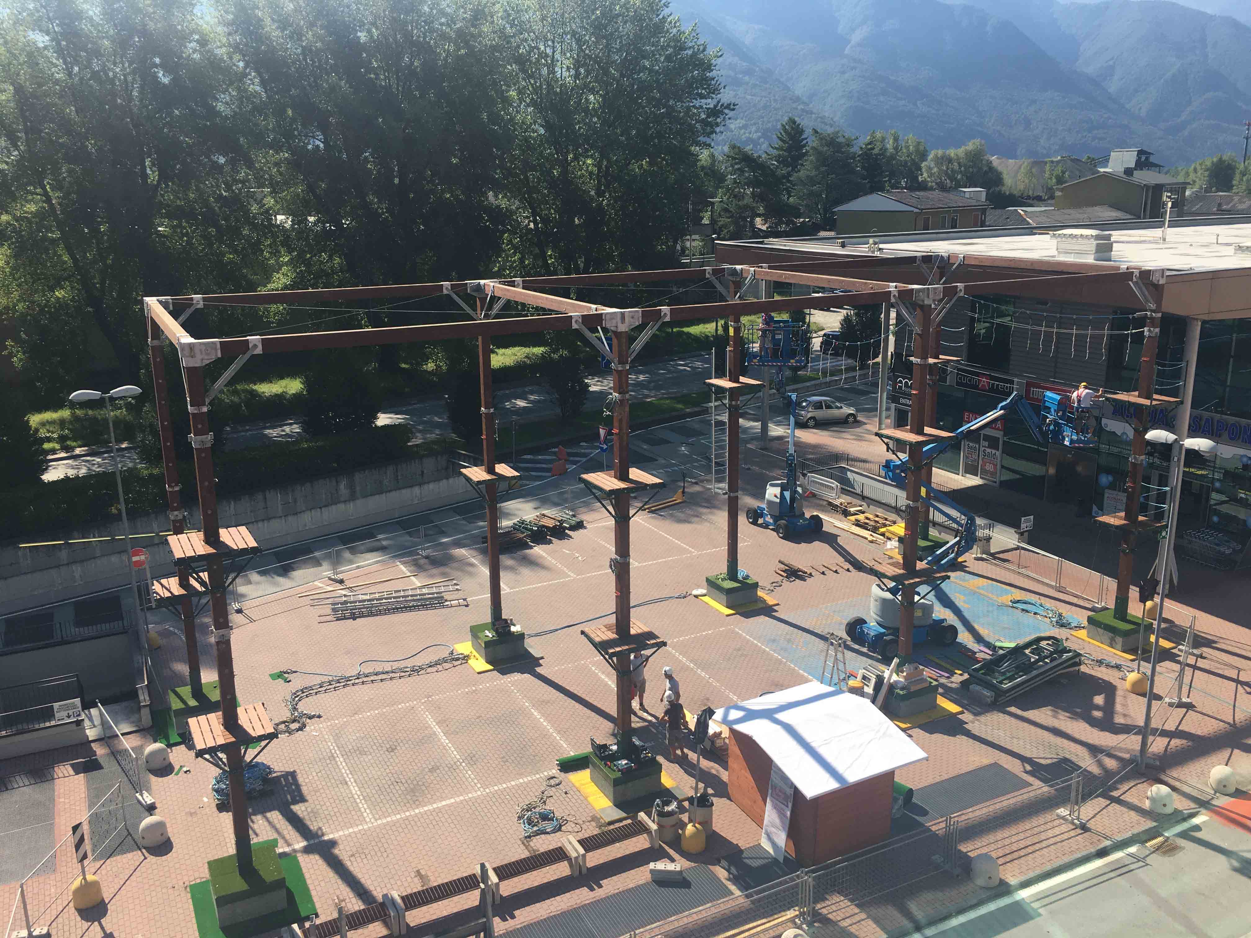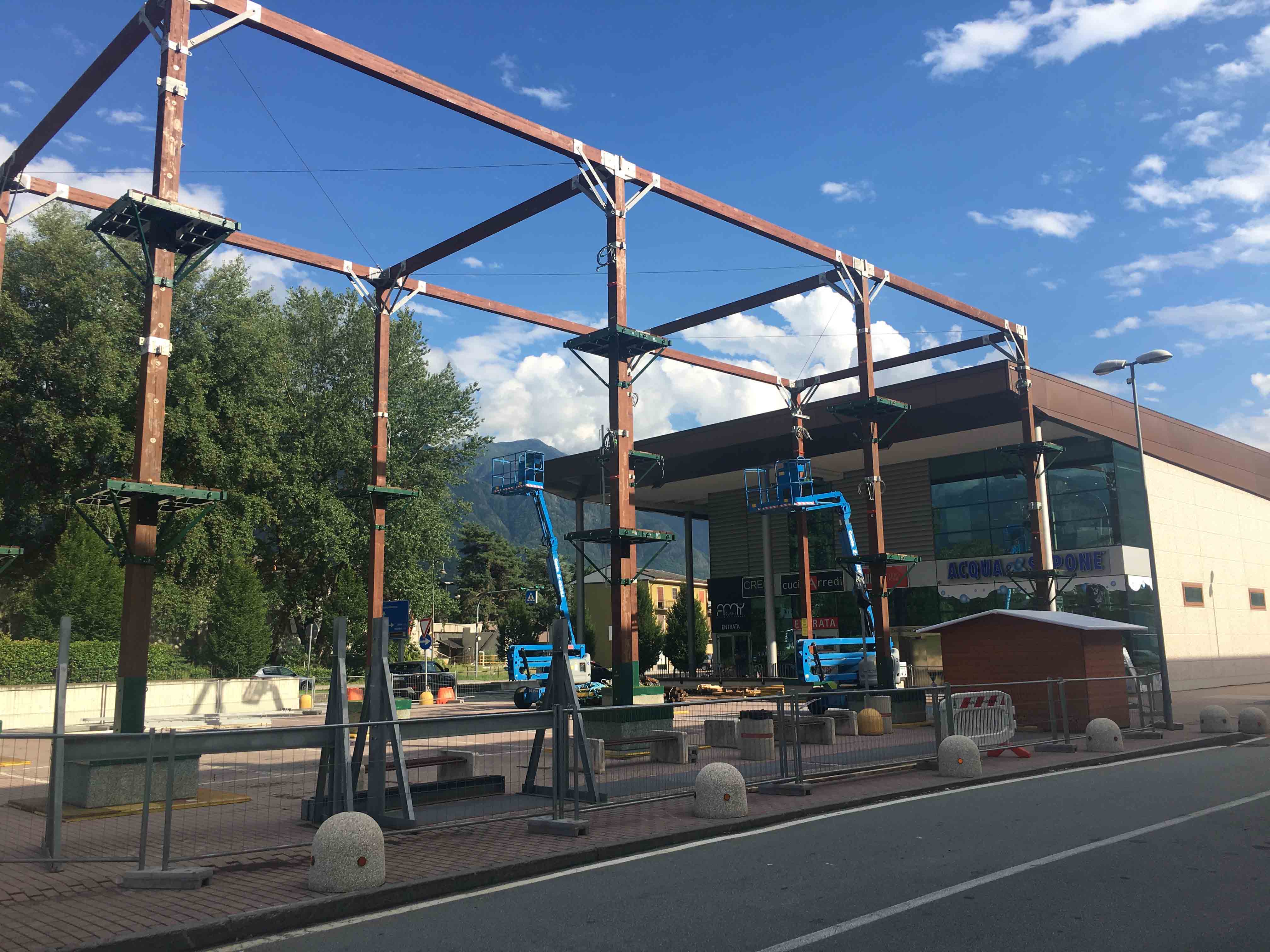 CREVOLADOSSOLA12-07-2017-Si sta lavorando alacremente all'Ossola Shopping Center di Crevoladossola per l'allestimento di un Parco Avventura per ragazzi ed adulti nella parte esterna del centro commerciale. Il parco sarà aperto fino al 3 settembre dal lunedì al venerdì dalle 16 alle 19, e sabato e domenica dalle 15 alle 19. Per l'accesso gratuito ai residenti di Crevoladossola è richiesta la carta d'identità, mentre per i non residenti basta presentare la Premium Card Ossola Shopping Center con una prova d'acquisto del giorno ed il documento d'identità per la consegna dell'attrezzatura. È obbligatorio usare l'attrezzatura messa disposizione (imbragatura, moschettone, casco); gli istruttori del percorso saranno sempre a disposizione per consigliare o aiutare in caso di necessità. Per i centri estivi o per i gruppi superiori alle 10 persone è necessario prenotarsi presso la casetta di accredito del parco avventura fino ad esaurimento posti. Inoltre all'interno del centro commerciale è stata allestita una parete di arrampicata per i più piccoli, disponibile con le stesse modalità tutti i sabato e domenica dalle 17:00 alle 20:00, il tutto comprensivo di un briefing prima di iniziare l'attività durante il percorso sotto la sorveglianza di un istruttore in totale sicurezza.