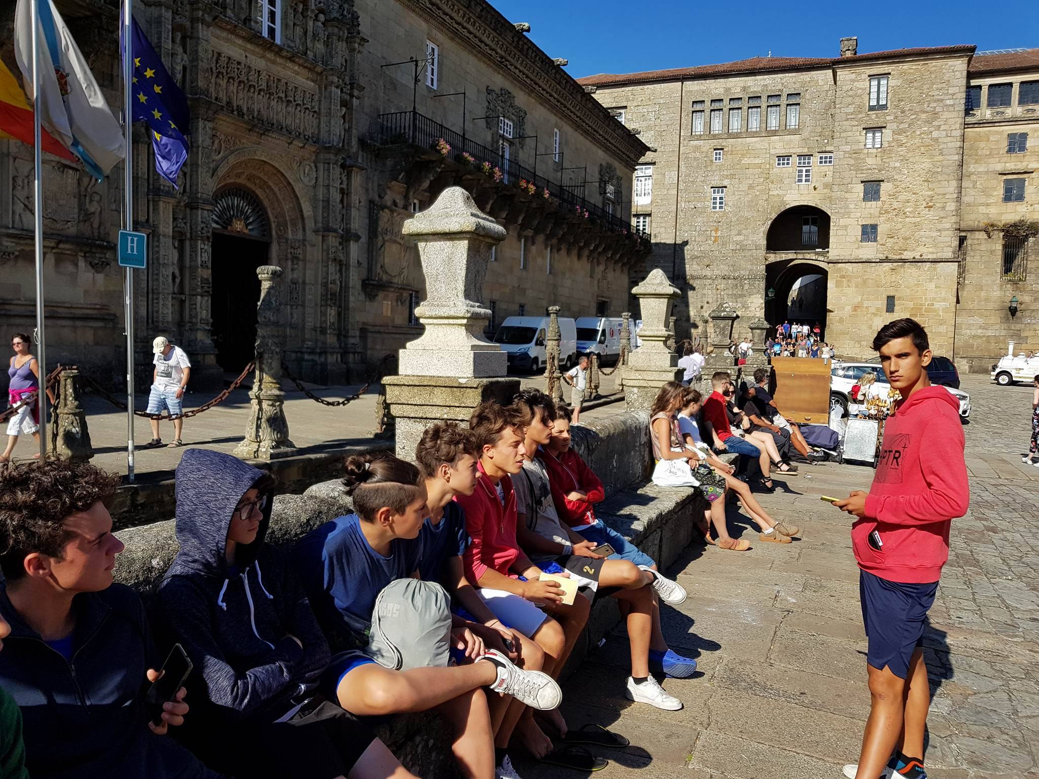 SANTIAGO-14-07-2017- Sono arrivati finalmente a Santiago di Compostela i 27 pellegrini domesi. Gli ultimi 347 km da Reliegos alla meta a piedi. Tappa faticosissima... in notturna! Partiti alle 23 di mercoledì 12 da Arzua per non dover affrontare di giorno il caldo spagnolo sono arrivati giovedì 13 luglio mattina alle 8. Ieri quindi i primi riti del pellegrino: l'abbraccio al santo e la richiesta di preghiere, e la richiesta della Compostela. Il primo emozionante e suggestivo: si salgono i gradini all'altare maggiore in cattedrale e si abbraccia fisicamente la statua di San Giacomo. A lui si bisbigliano le proprie intime richieste. Il secondo presso l'ufficio di accoglienza dei pellegrini per l'apposizione dell'ultimo timbro e la consegna dell'attestato ufficiale. Dice Lorenzo Trapani di 13 anni "Mi é piaciuto molto camminare in solitudine e pensare. La fatica diventa quasi un'emozione quando ci si avvicina alla meta!" e Gabriele Carbone, 13 anni: "la fatica maggiore è stata la tappa da Villar ad Astorga per il caldo e perché le gambe iniziavano a cedere".
