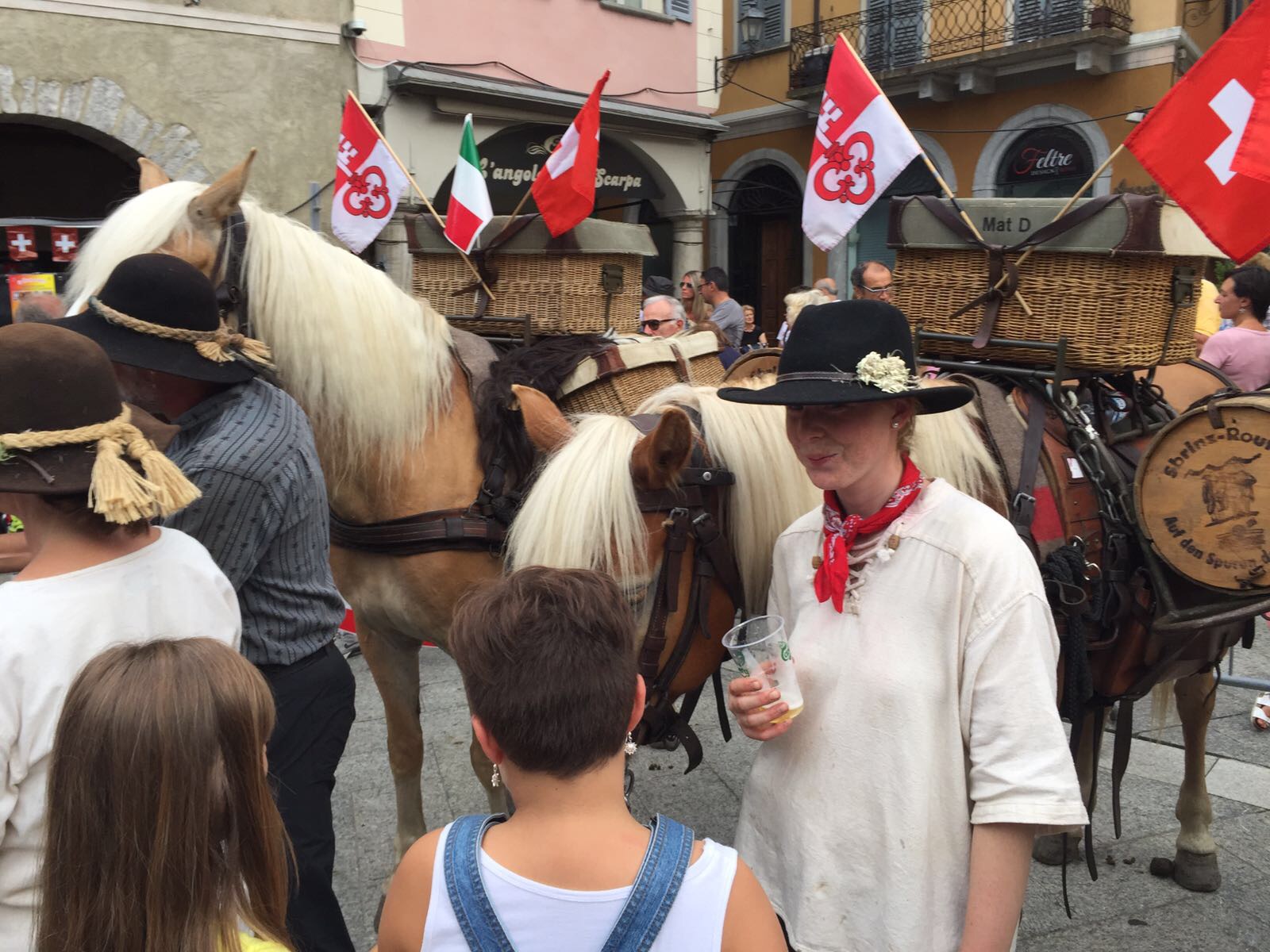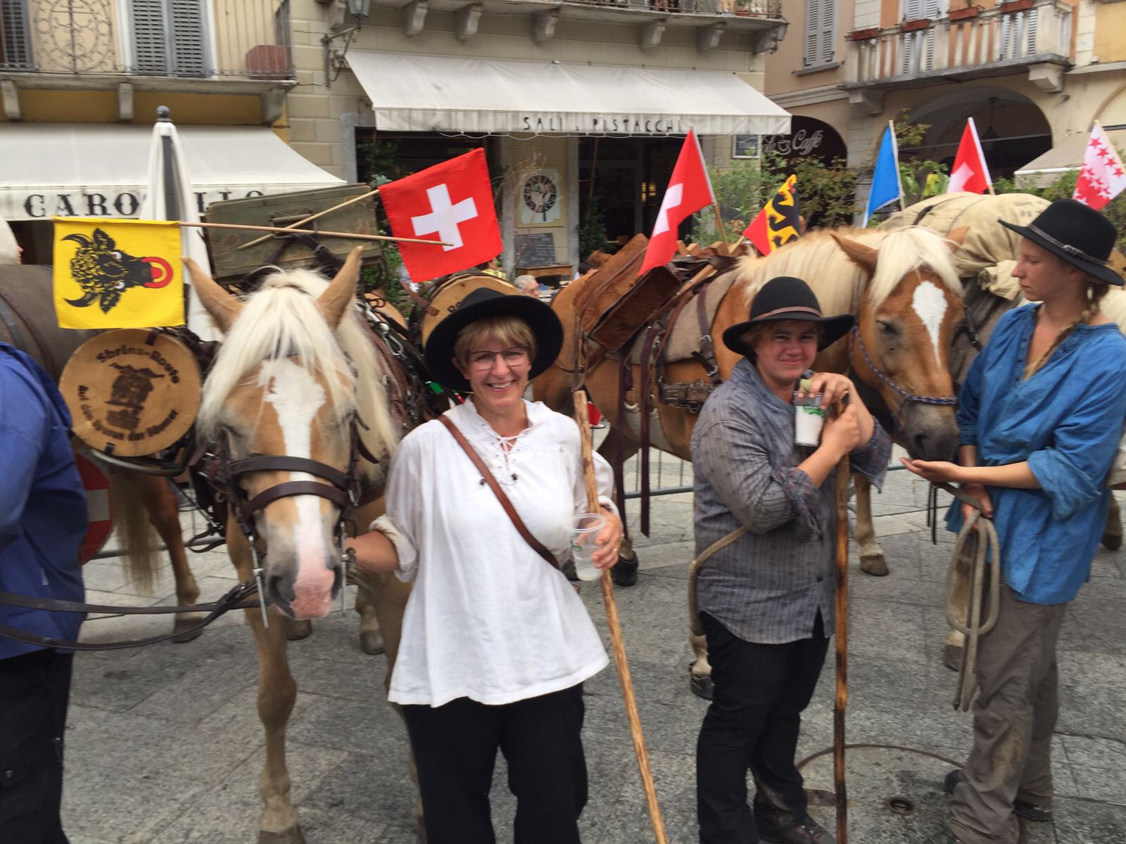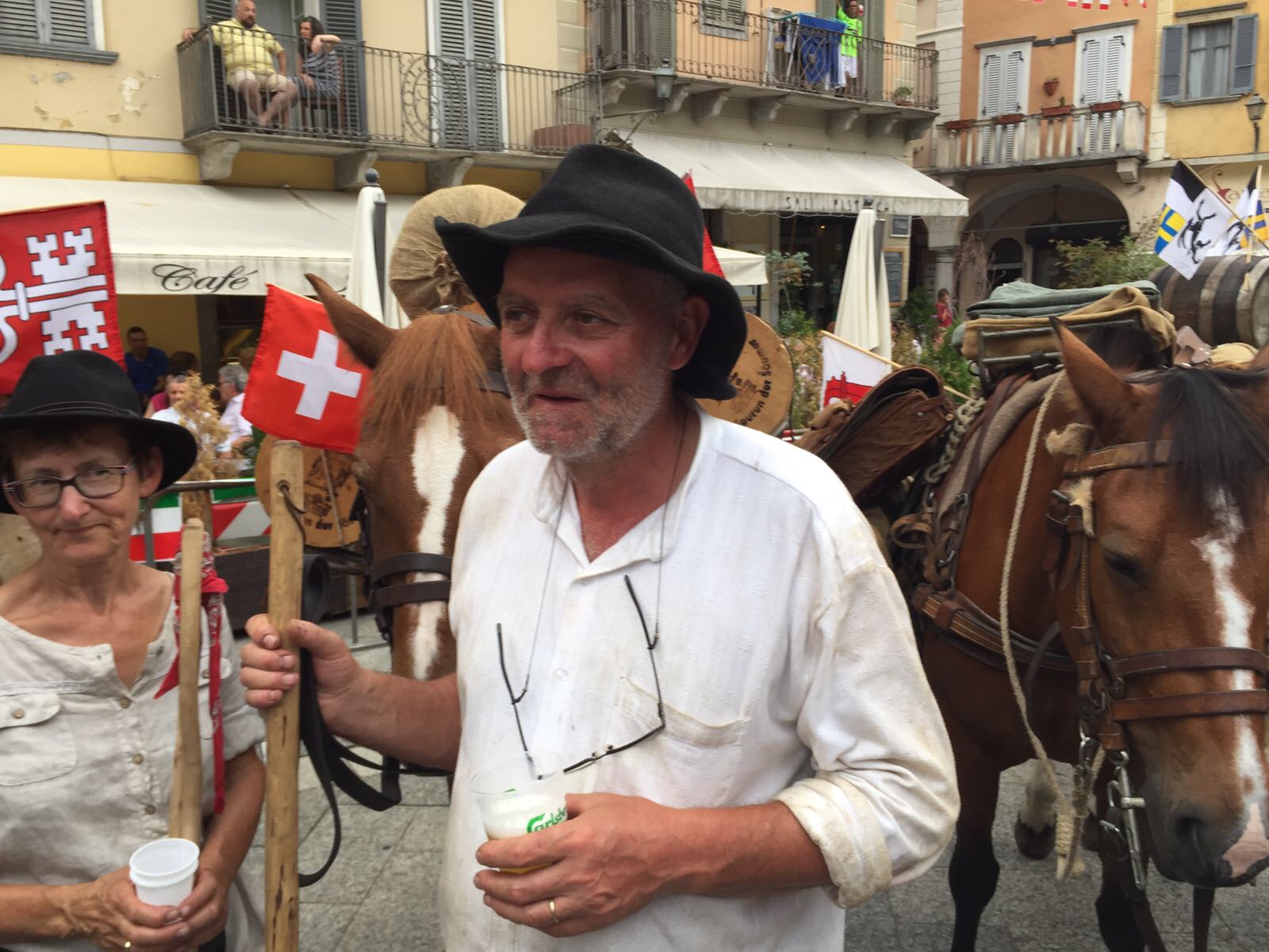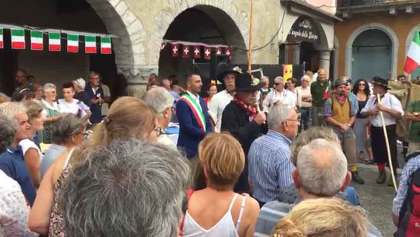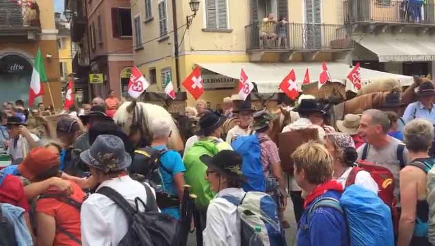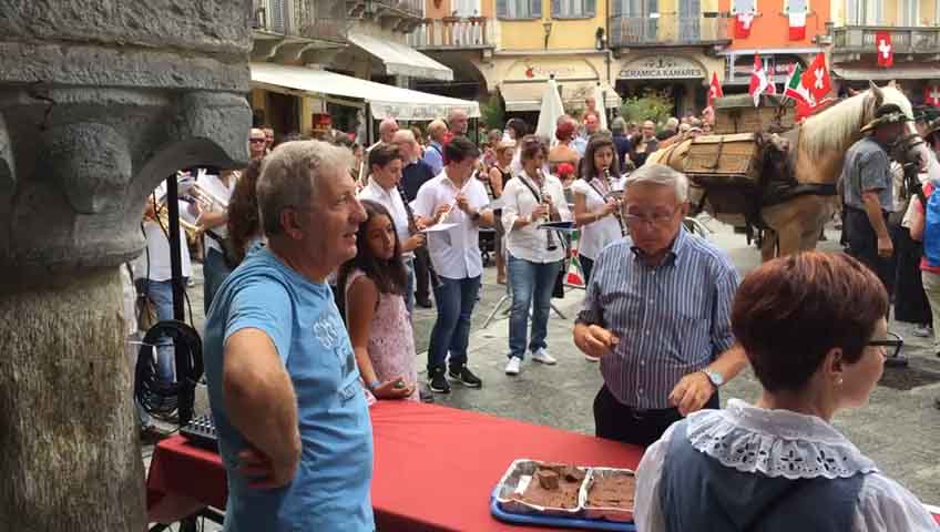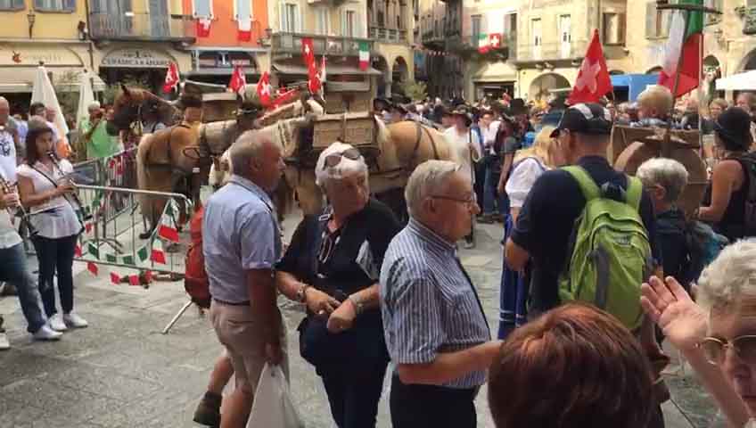 DOMODOSSOLA- 26-08-20176- Una grande festa ha accolto pomeriggio, sabato 26 agosto, in piazza Mercato a Domodossola la carovana della " Sbrinz Route" l'escursione che ripercorre da quattordici anni l'antica via commerciale tra Svizzera e Italia. i novanta partecipanti in costume tipico accompagnati da muli e cavalli carichi di formaggio Sbrinz sono stati festeggiati dalla città domese, le cui vie del centro sono state addobbate con bandierine colorate nei colori della Svizzera e dell'Italia. Il vice sindaco domese Angelo Tandurella ha espresso soddisfazione per la grande partecipazione di pubblico e sempre più affettuosa accoglienza riservata agli amici d'Oltralpe. Per il 2018 una grande novità: la Sbrinz Route partirà proprio da Domodossola. " Il percorso sarà al contrario, con l'obiettivo minimo di dieci partecipanti proveremo a realizzare il sogno di Werner Grossniklaus, presidente dell'associazione Sbrinz Route" . La carovana guidata da Daniel Fluehler ( presidente carovana e someggiatori) ha portato nel capoluogo ossolano circa 40 chili di Sbrinz, andati subito a ruba.