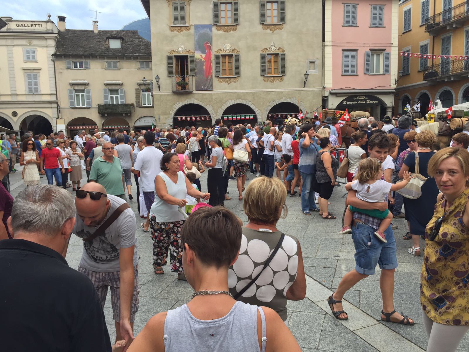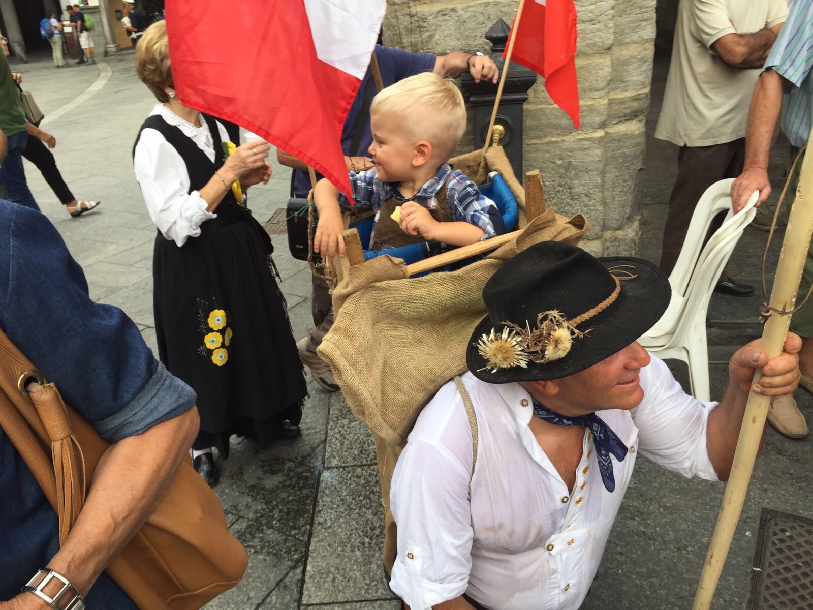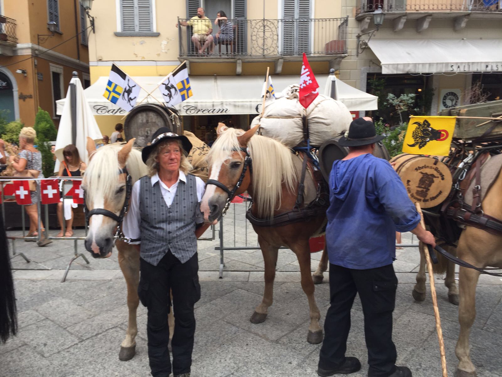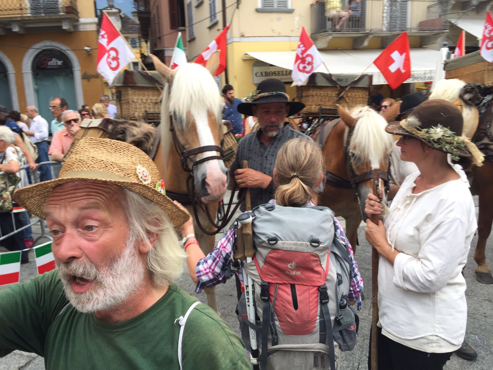 DOMODOSSOLA- 26-08-20176- Una grande festa ha accolto pomeriggio, sabato 26 agosto, in piazza Mercato a Domodossola la carovana della " Sbrinz Route" l'escursione che ripercorre da quattordici anni l'antica via commerciale tra Svizzera e Italia. i novanta partecipanti in costume tipico accompagnati da muli e cavalli carichi di formaggio Sbrinz sono stati festeggiati dalla città domese, le cui vie del centro sono state addobbate con bandierine colorate nei colori della Svizzera e dell'Italia. Il vice sindaco domese Angelo Tandurella ha espresso soddisfazione per la grande partecipazione di pubblico e sempre più affettuosa accoglienza riservata agli amici d'Oltralpe. Per il 2018 una grande novità: la Sbrinz Route partirà proprio da Domodossola. " Il percorso sarà al contrario, con l'obiettivo minimo di dieci partecipanti proveremo a realizzare il sogno di Werner Grossniklaus, presidente dell'associazione Sbrinz Route" . La carovana guidata da Daniel Fluehler ( presidente carovana e someggiatori) ha portato nel capoluogo ossolano circa 40 chili di Sbrinz, andati subito a ruba.