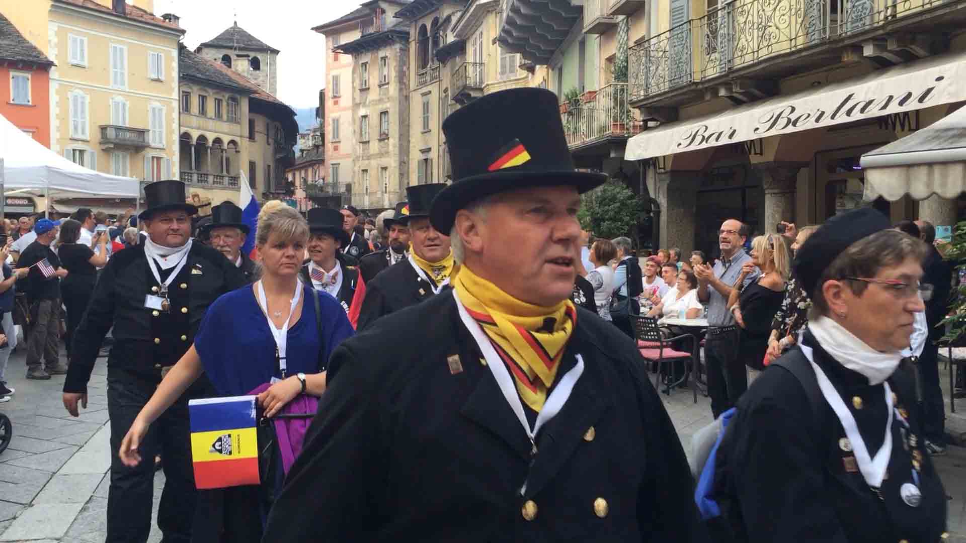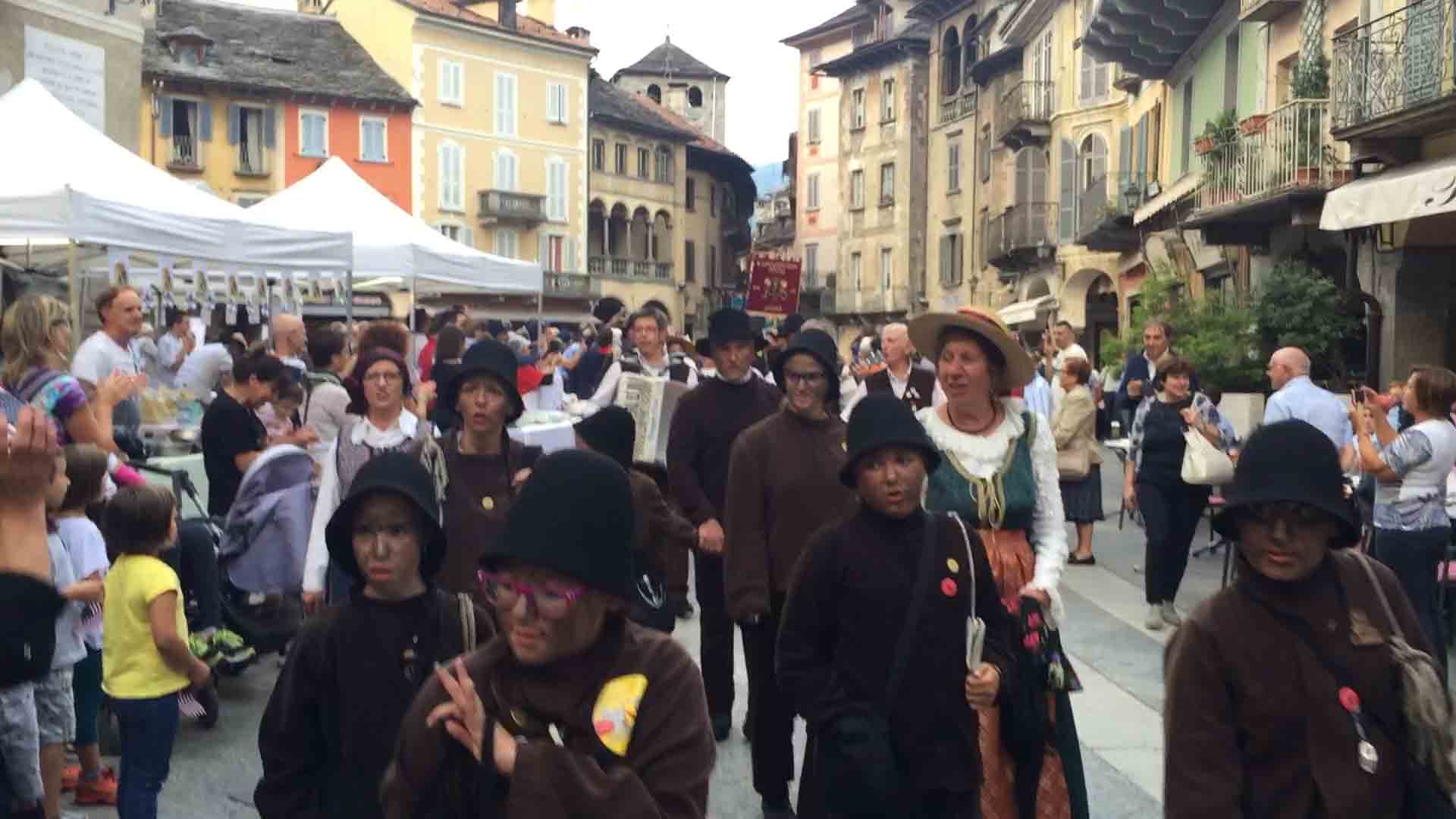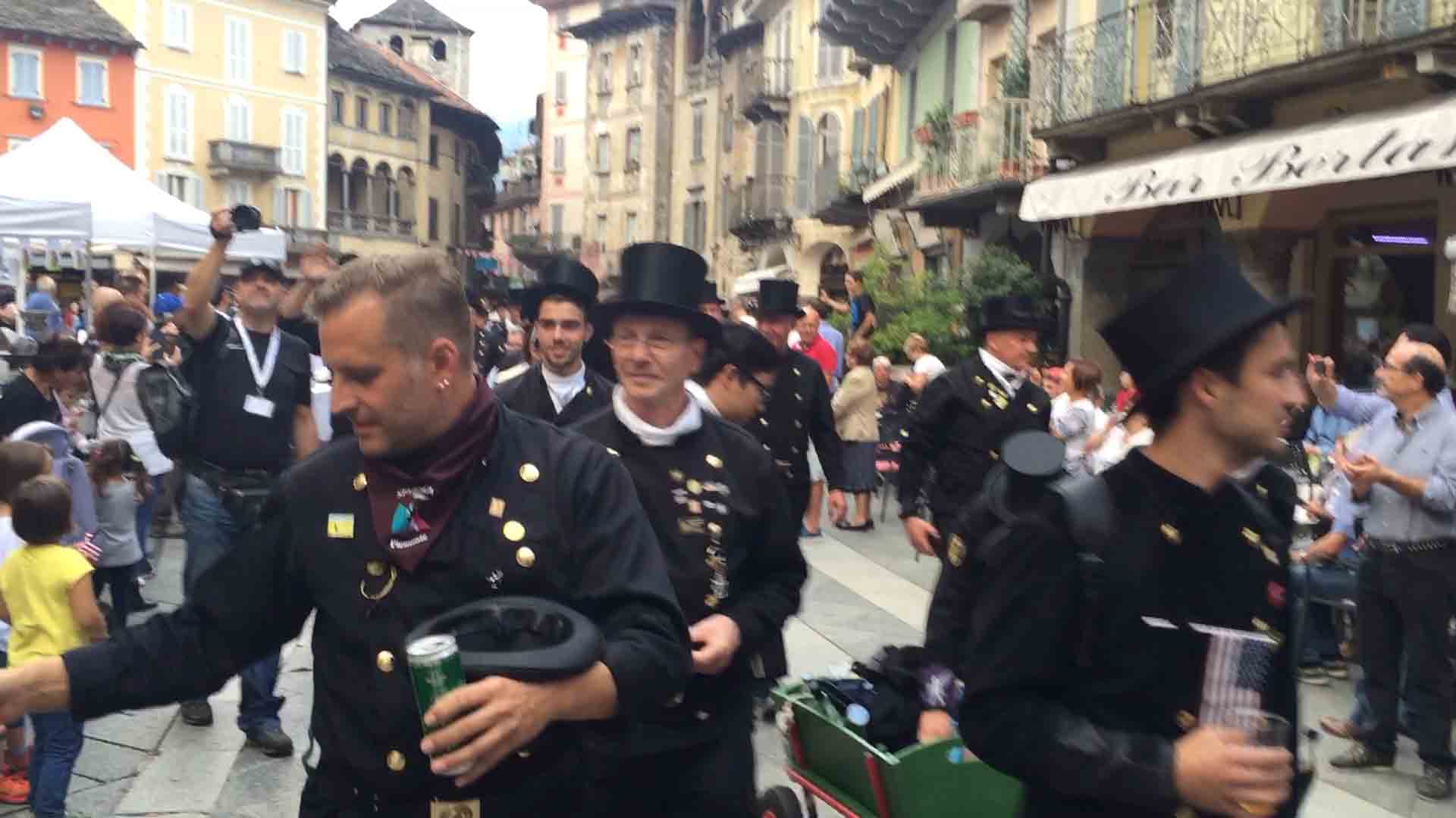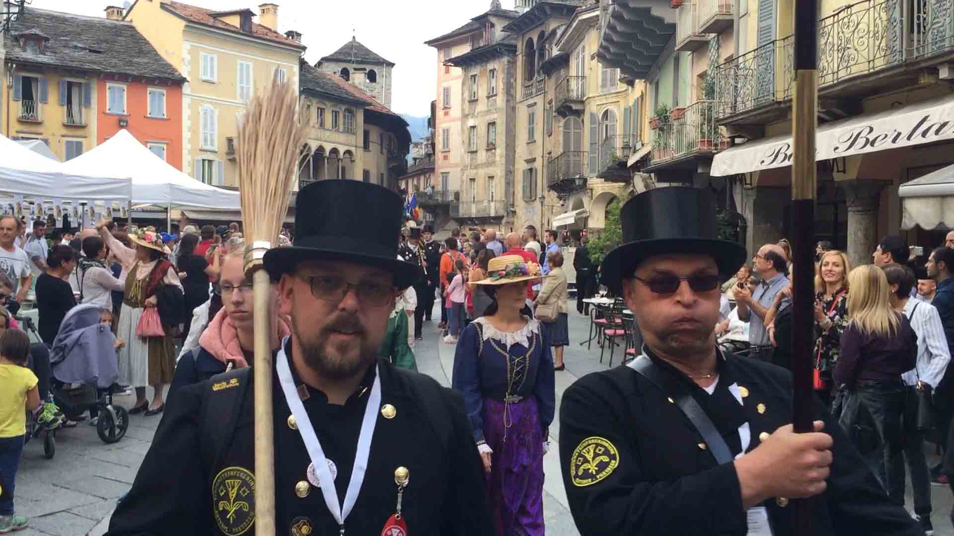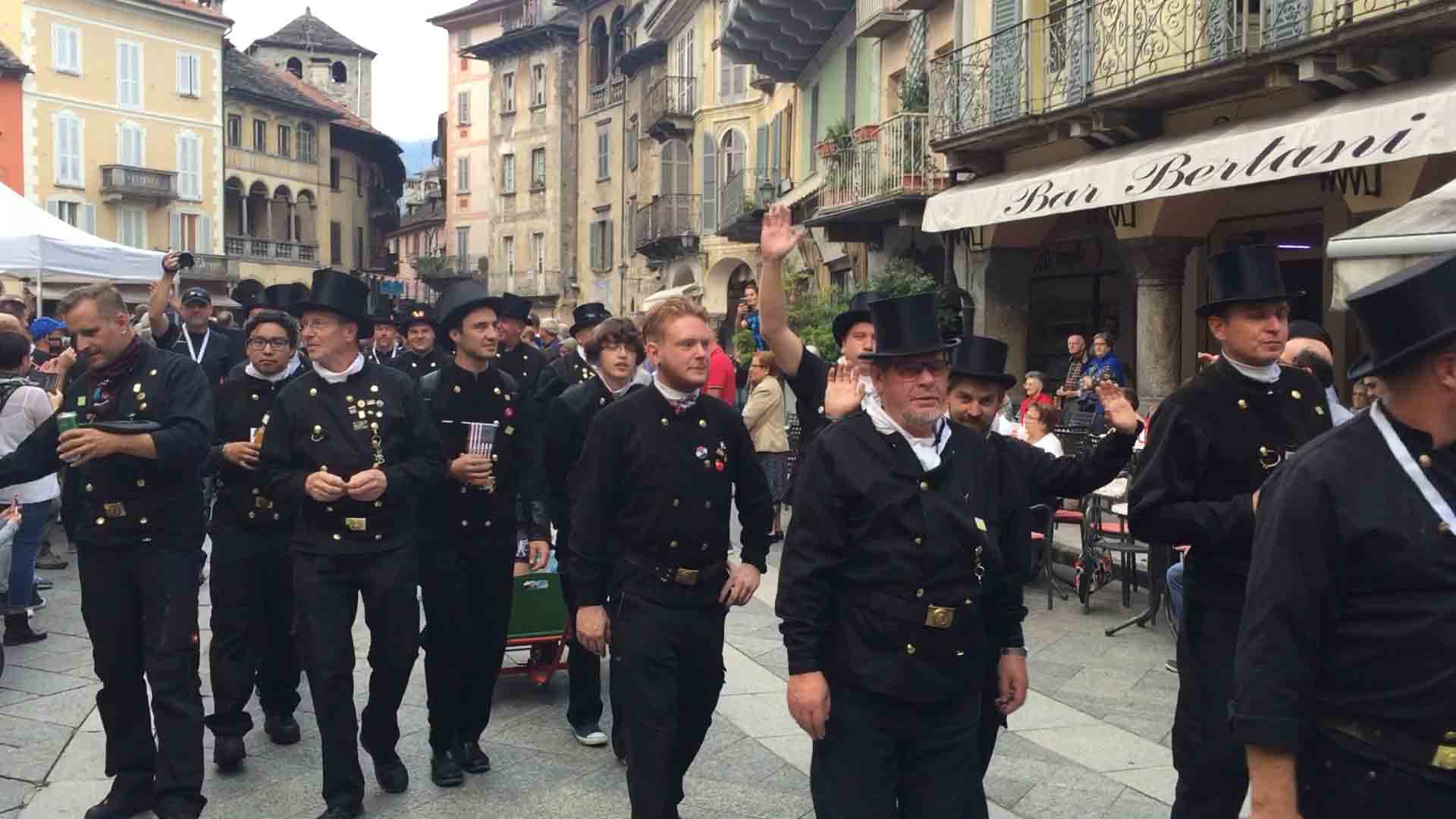 di festa, ma ancora carichi della consueta allegria, gli spazzacamini provenienti da tutto il mondo che hanno partecipato al raduno vigezzino di domenica hanno sfilato lunedì sera per le vie domesi, accolti da una Domodossola incuriosita e scesa in piazza per il contemporaneo evento di Tastem Insema. Gli spazzacamini, giunti con il trenino della Vigezzina, si sono radunati in piazza stazione ed hanno sfilato per la città salutando la folla e regalando caramelle ai bambini, marciando insieme al Civico Corpo Musicale ed alla Corte di Mattarella del Comitato Polenta e Sciurii. Dopo avere attraversato tra due ali di folla Piazza Mercato è stata l'ora della cena, con le cinque lunghe tavolate approntate dalla Pro Domo e dalle altre associazioni che collaboravano all'evento in piazza Rovereto. Gli uomini in nero, al consueto grido "Spazzacaminooo!", e sempre disponibili per una foto, hanno approfittato poi della festa in piazza, unendosi alle degustazioni, specie quelle di vino e birra.