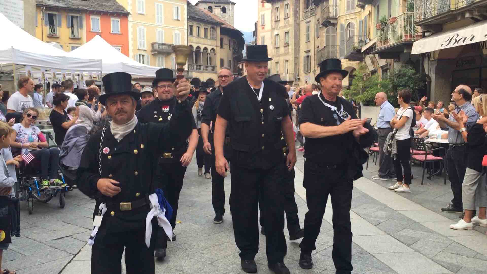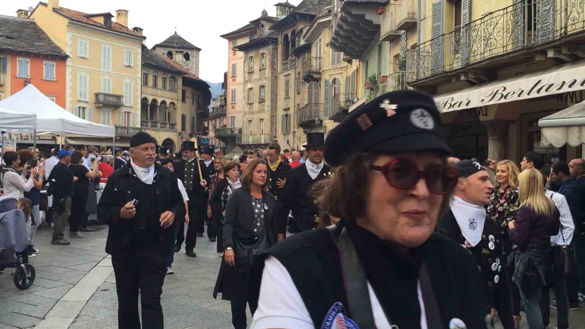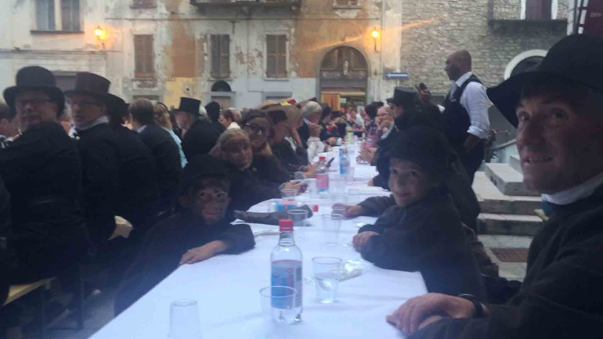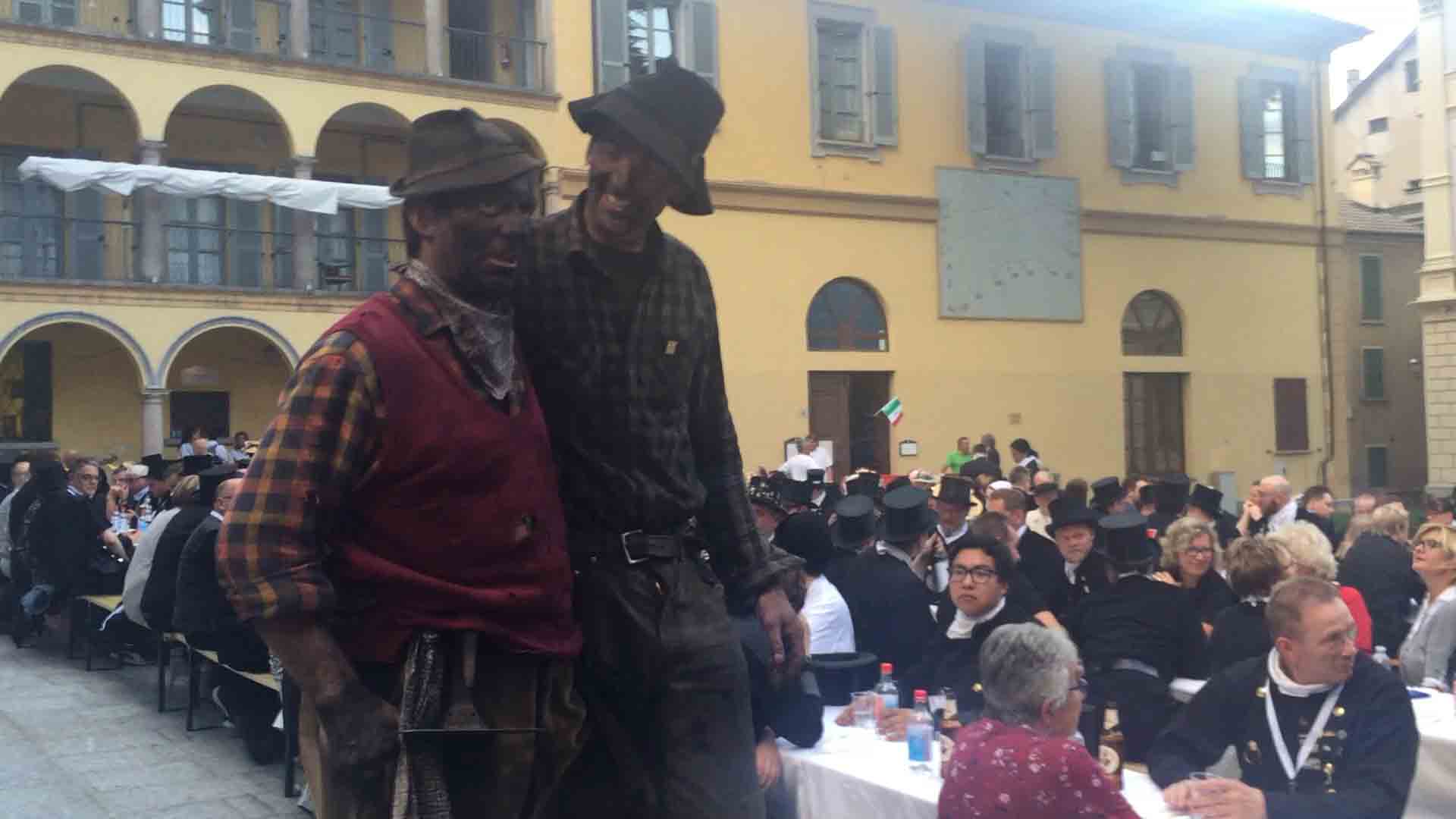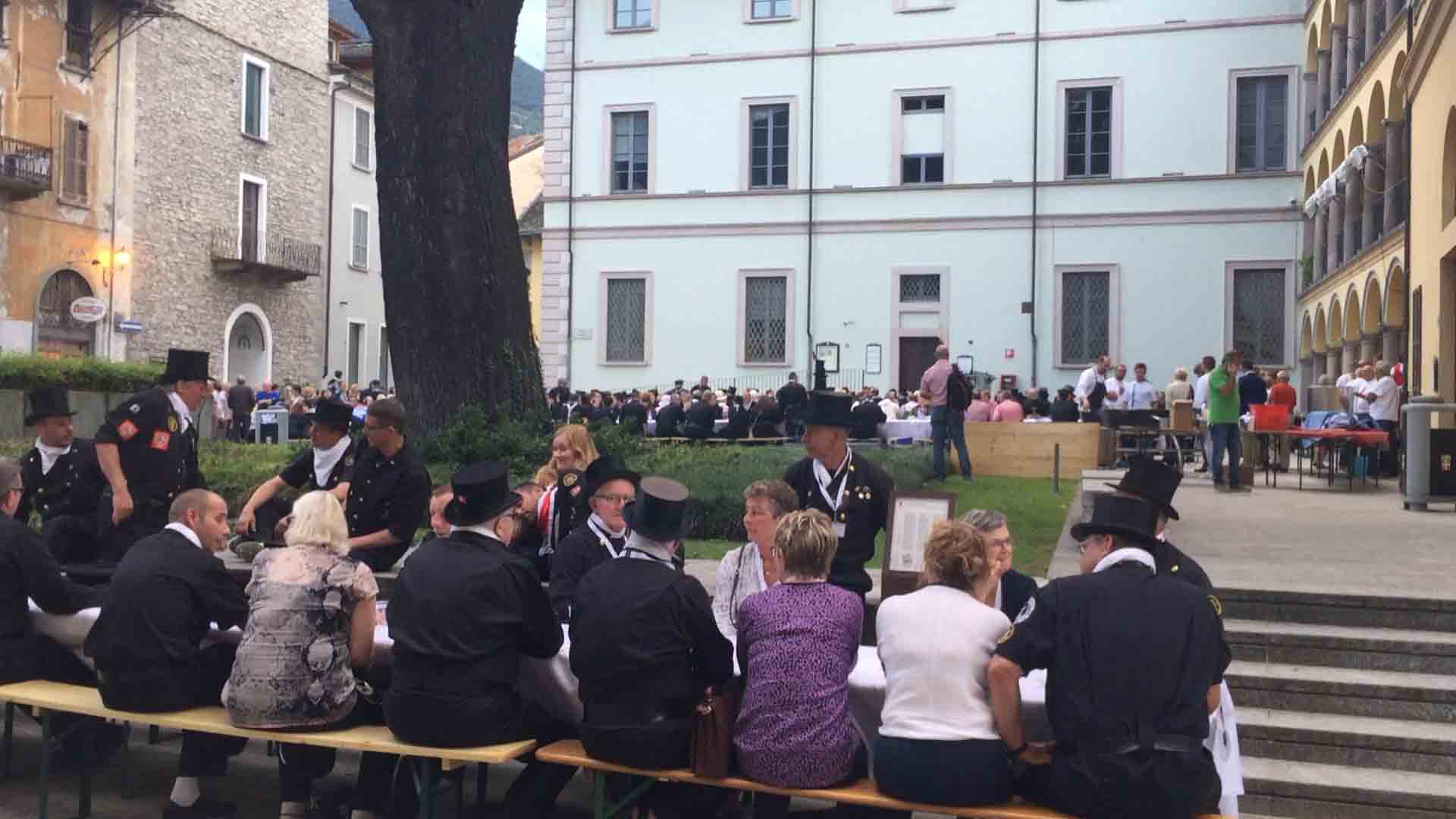 di festa, ma ancora carichi della consueta allegria, gli spazzacamini provenienti da tutto il mondo che hanno partecipato al raduno vigezzino di domenica hanno sfilato lunedì sera per le vie domesi, accolti da una Domodossola incuriosita e scesa in piazza per il contemporaneo evento di Tastem Insema. Gli spazzacamini, giunti con il trenino della Vigezzina, si sono radunati in piazza stazione ed hanno sfilato per la città salutando la folla e regalando caramelle ai bambini, marciando insieme al Civico Corpo Musicale ed alla Corte di Mattarella del Comitato Polenta e Sciurii. Dopo avere attraversato tra due ali di folla Piazza Mercato è stata l'ora della cena, con le cinque lunghe tavolate approntate dalla Pro Domo e dalle altre associazioni che collaboravano all'evento in piazza Rovereto. Gli uomini in nero, al consueto grido "Spazzacaminooo!", e sempre disponibili per una foto, hanno approfittato poi della festa in piazza, unendosi alle degustazioni, specie quelle di vino e birra.