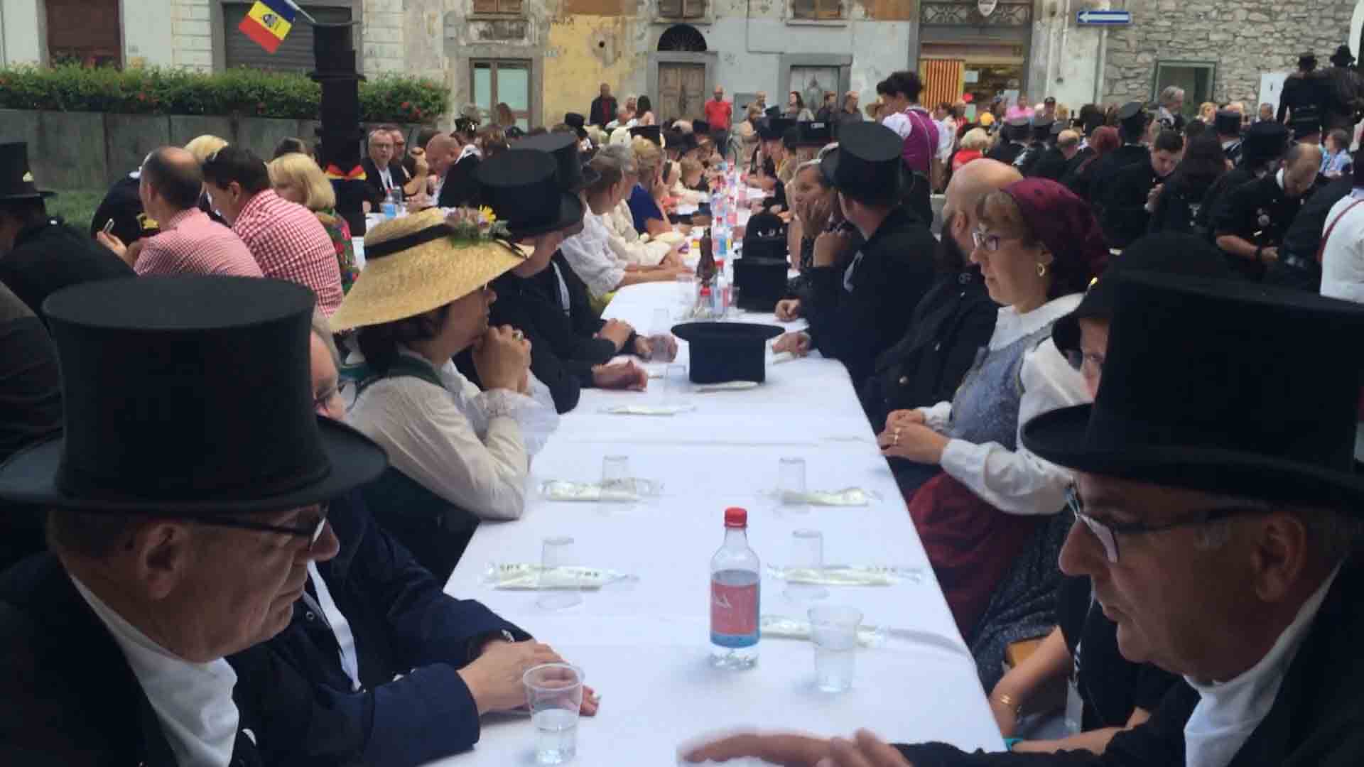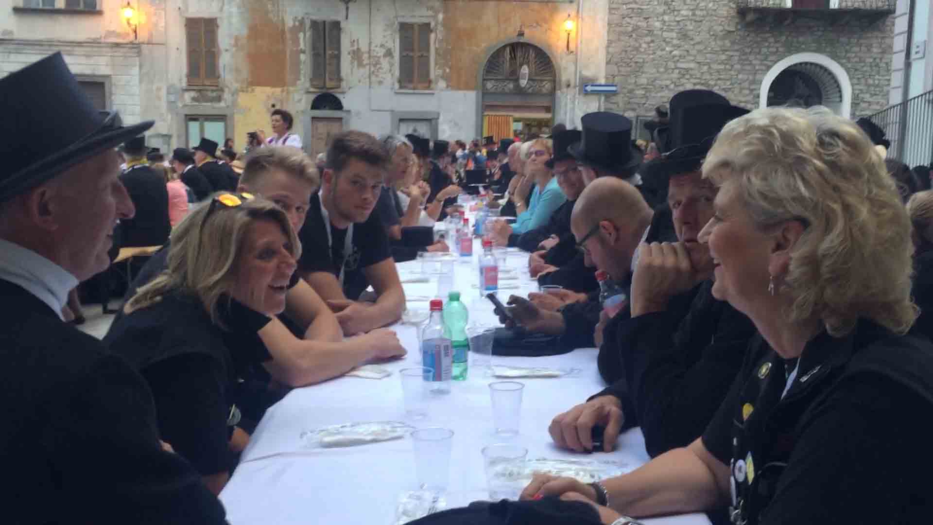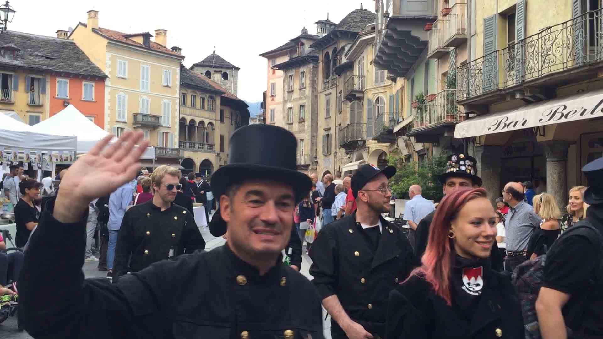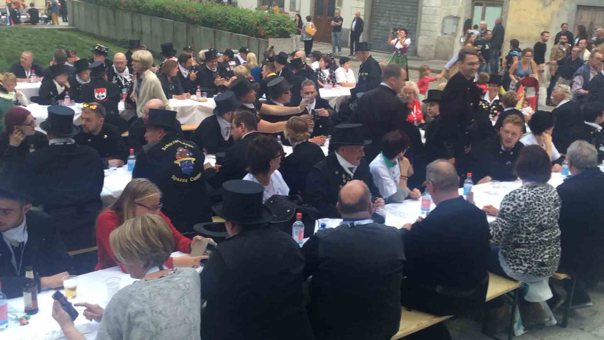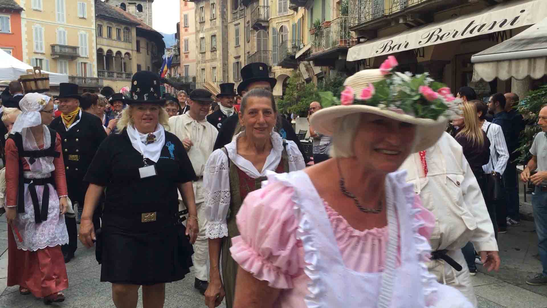 di festa, ma ancora carichi della consueta allegria, gli spazzacamini provenienti da tutto il mondo che hanno partecipato al raduno vigezzino di domenica hanno sfilato lunedì sera per le vie domesi, accolti da una Domodossola incuriosita e scesa in piazza per il contemporaneo evento di Tastem Insema. Gli spazzacamini, giunti con il trenino della Vigezzina, si sono radunati in piazza stazione ed hanno sfilato per la città salutando la folla e regalando caramelle ai bambini, marciando insieme al Civico Corpo Musicale ed alla Corte di Mattarella del Comitato Polenta e Sciurii. Dopo avere attraversato tra due ali di folla Piazza Mercato è stata l'ora della cena, con le cinque lunghe tavolate approntate dalla Pro Domo e dalle altre associazioni che collaboravano all'evento in piazza Rovereto. Gli uomini in nero, al consueto grido "Spazzacaminooo!", e sempre disponibili per una foto, hanno approfittato poi della festa in piazza, unendosi alle degustazioni, specie quelle di vino e birra.