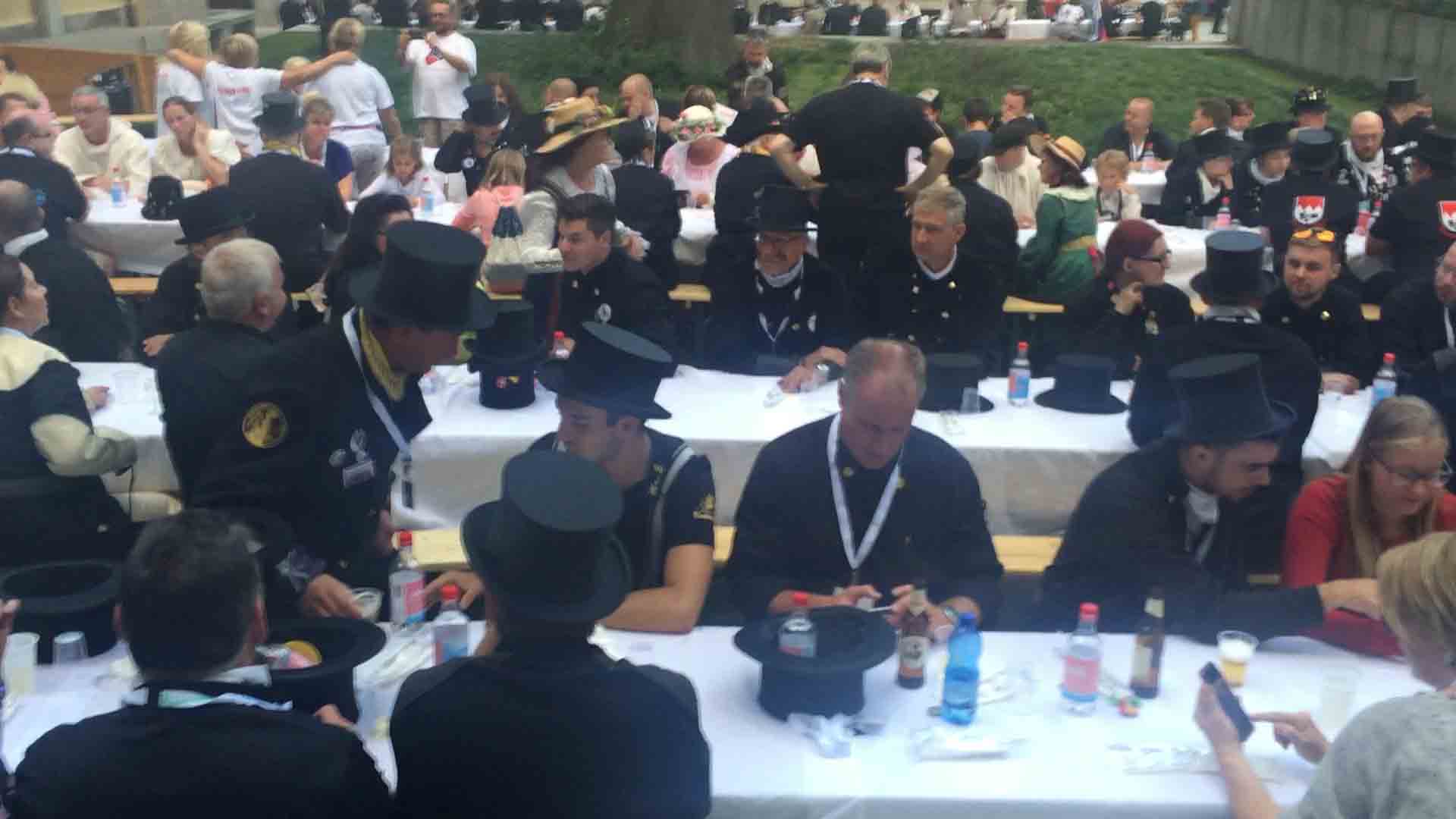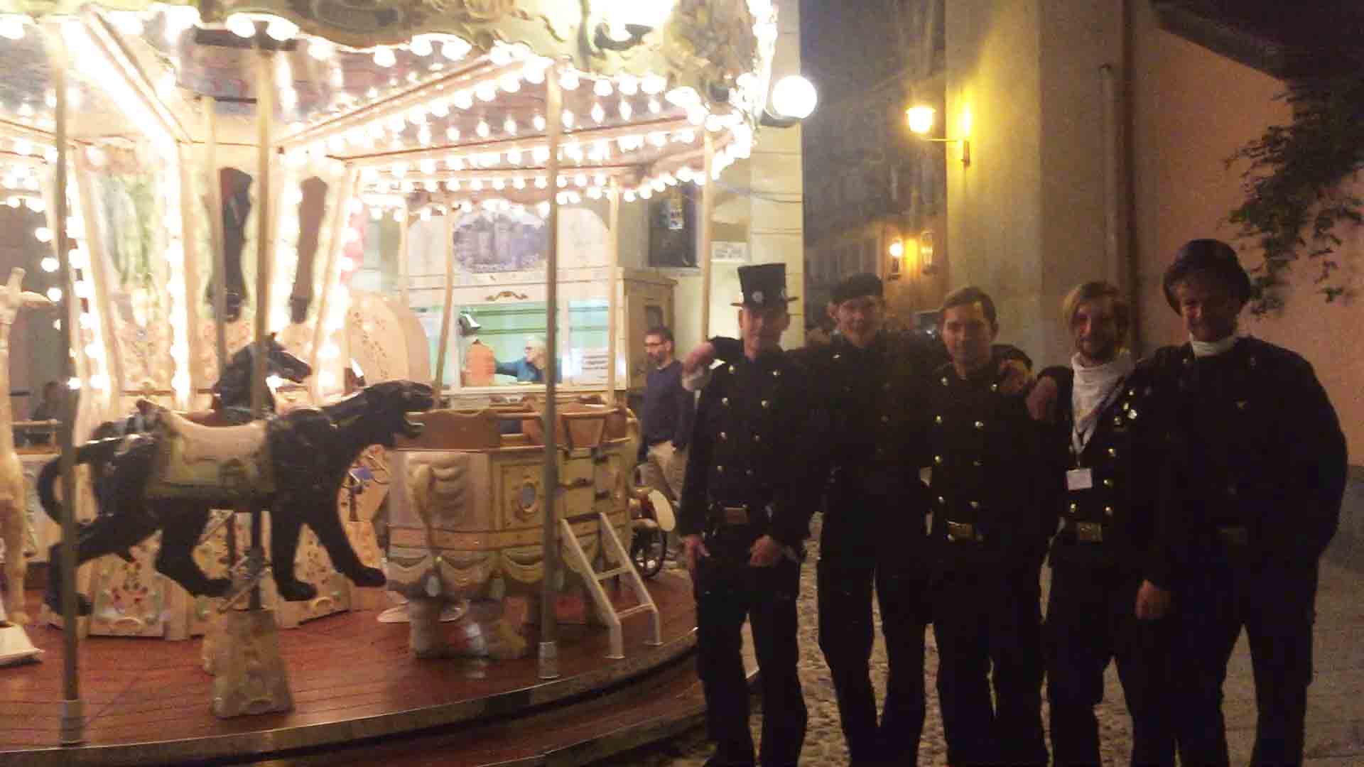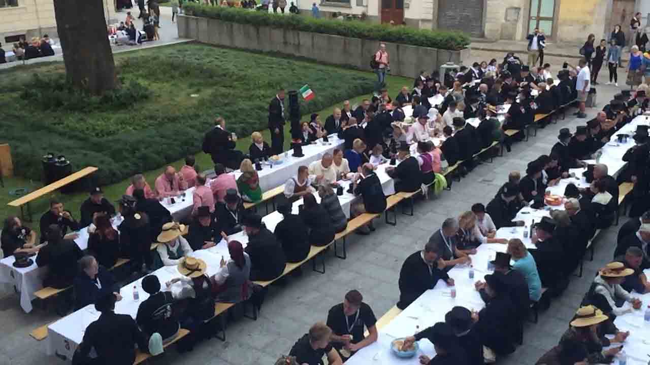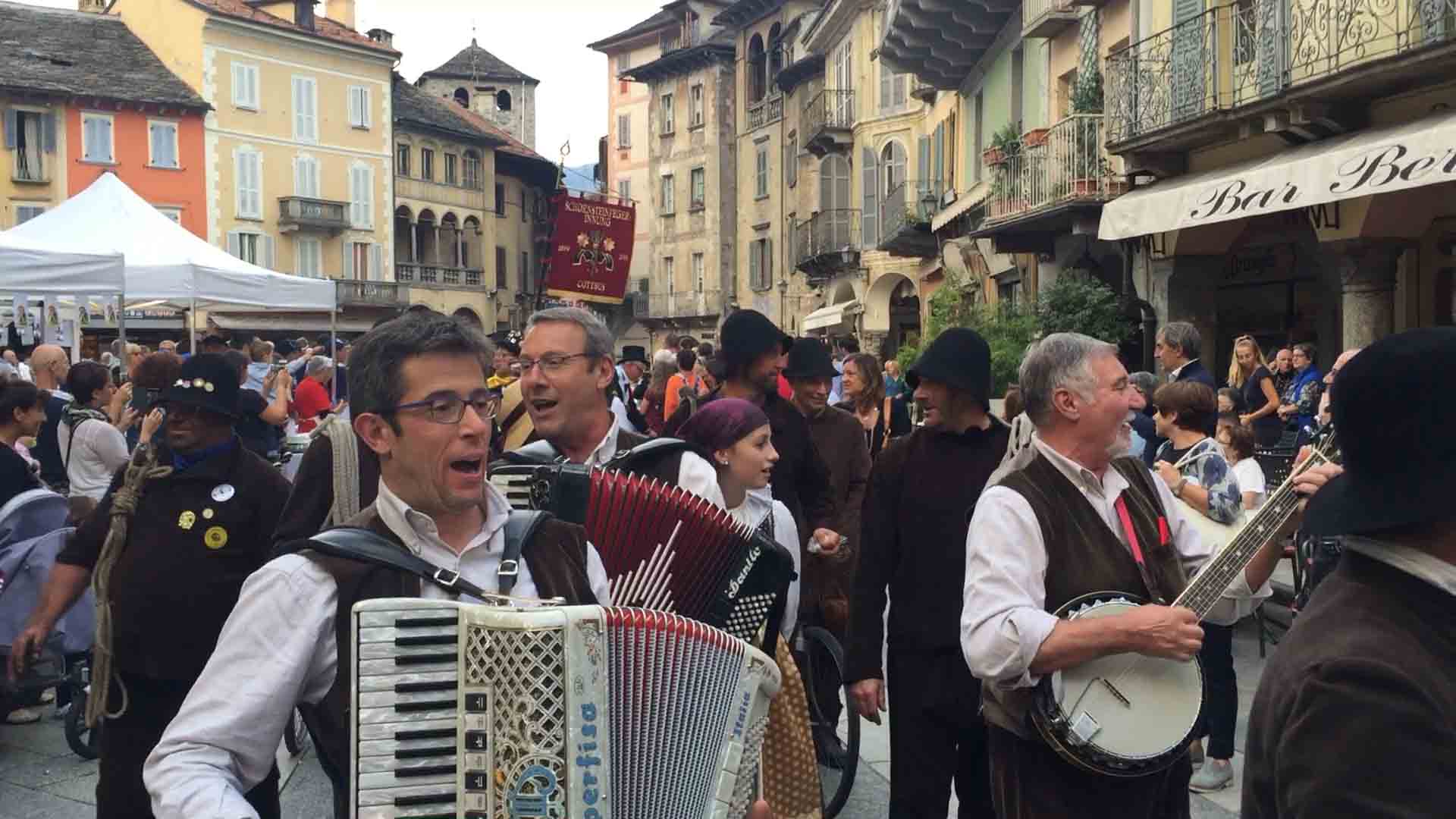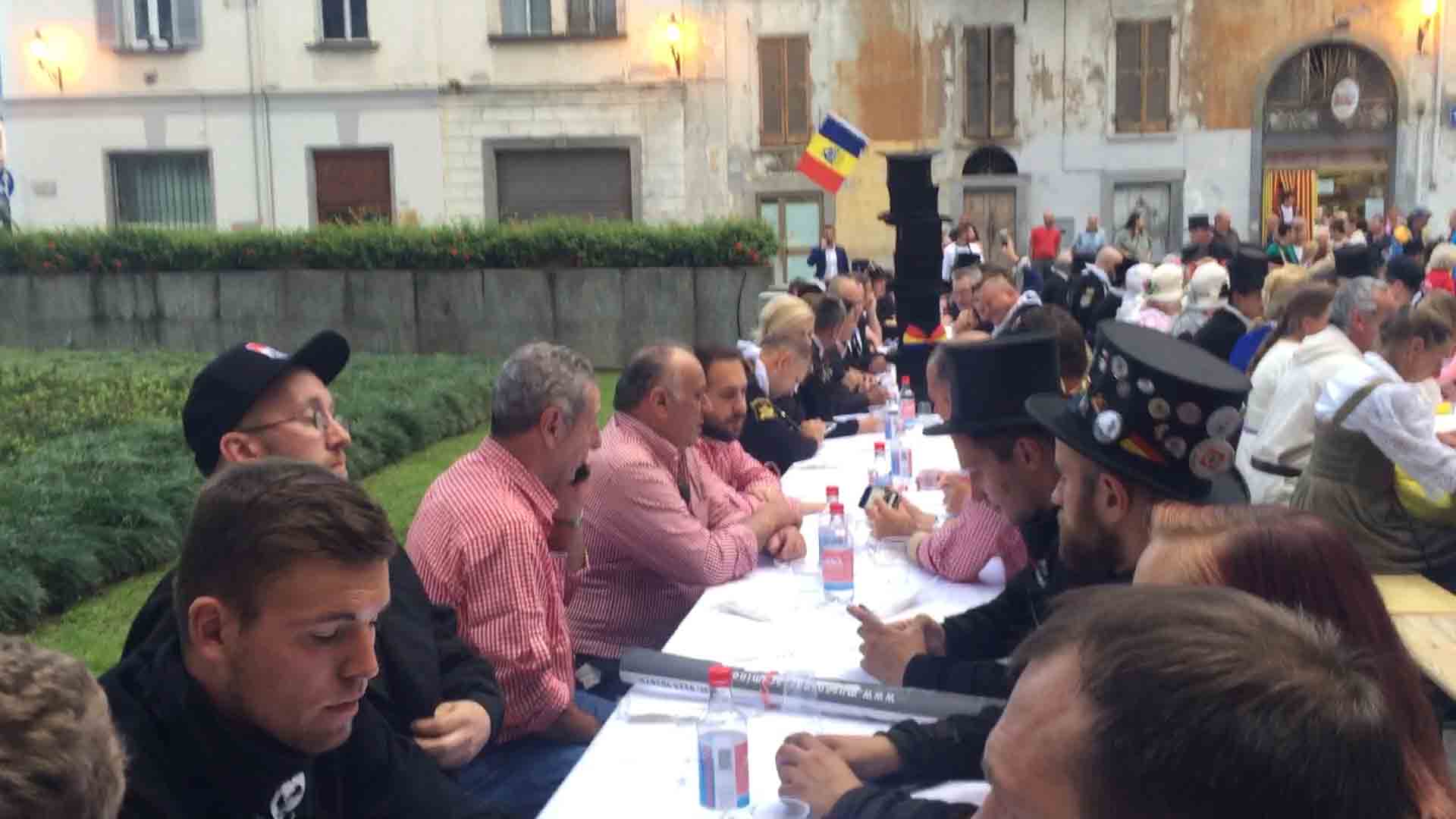 di festa, ma ancora carichi della consueta allegria, gli spazzacamini provenienti da tutto il mondo che hanno partecipato al raduno vigezzino di domenica hanno sfilato lunedì sera per le vie domesi, accolti da una Domodossola incuriosita e scesa in piazza per il contemporaneo evento di Tastem Insema. Gli spazzacamini, giunti con il trenino della Vigezzina, si sono radunati in piazza stazione ed hanno sfilato per la città salutando la folla e regalando caramelle ai bambini, marciando insieme al Civico Corpo Musicale ed alla Corte di Mattarella del Comitato Polenta e Sciurii. Dopo avere attraversato tra due ali di folla Piazza Mercato è stata l'ora della cena, con le cinque lunghe tavolate approntate dalla Pro Domo e dalle altre associazioni che collaboravano all'evento in piazza Rovereto. Gli uomini in nero, al consueto grido "Spazzacaminooo!", e sempre disponibili per una foto, hanno approfittato poi della festa in piazza, unendosi alle degustazioni, specie quelle di vino e birra.