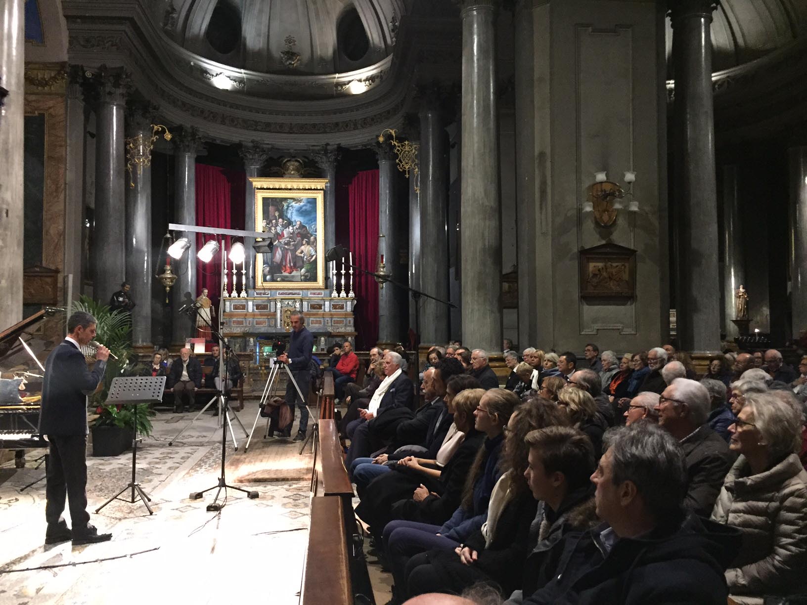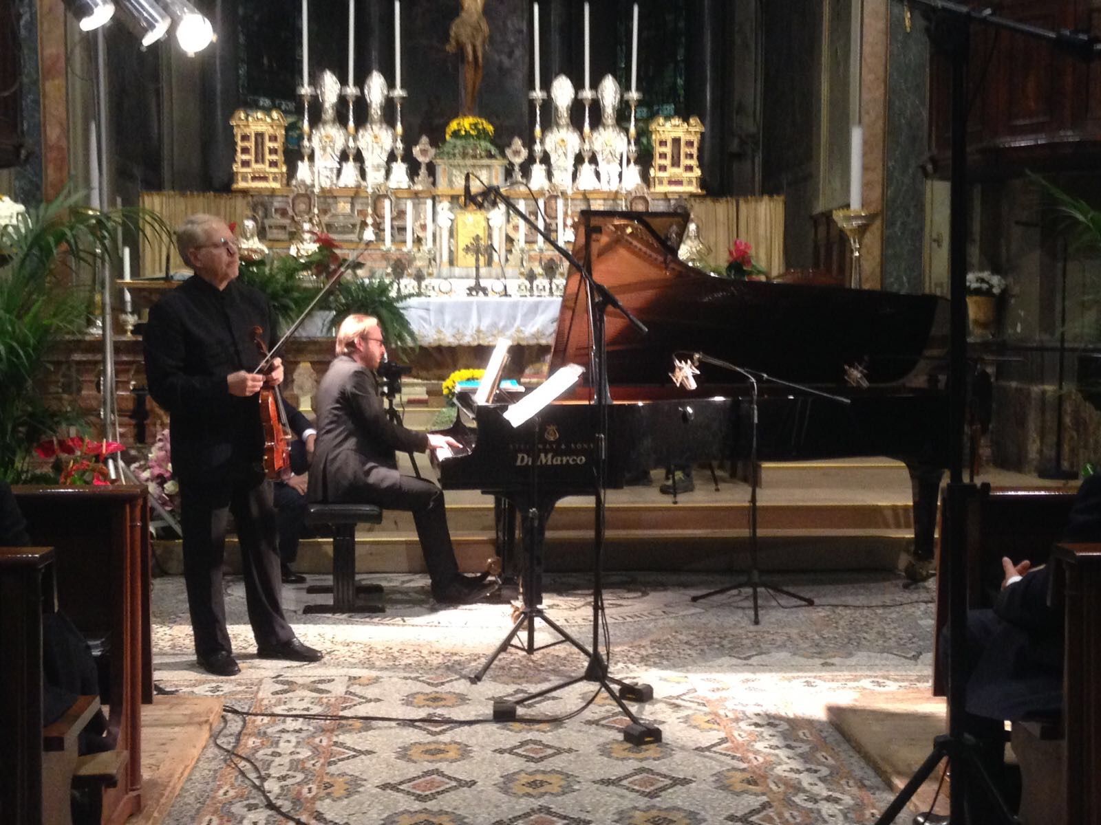 anche nelle navate laterali e le cappelle aperte, la chiesa Collegiata domese sabato sera per un evento di rilievo internazionale, ovvero il concerto proposto dall'Associazione Mario Ruminelli per festeggiare la nascita della Fondazione Paola Angela Ruminelli presieduta da Antonio Pagani. La serata ha visto insieme due musicisti famosi: Shlomo Mintz uno dei più grandi violinisti contemporanei che ha calcato come solista e come direttore il palcoscenico dei più celebri teatri del mondo, e Roberto Prosseda, famoso interprete del pianoforte romantico, in particolare di Chopin e di Mendelssohn, che ha raccolto riconoscimenti in tutto il mondo. Il concerto è stato introdotto dal neo presidente dell'associazione Massimo Gianoglio: “I due artisti – ha spiegato Gianoglio - da tempo avevano manifestato il desiderio di esibirsi insieme e l’occasione si è presentata proprio con il concerto inaugurale della Fondazione Ruminelli”. Prosseda ha raccontato di essere andato in Perù per preparare il concerto in quanto Mintz era impegnato Sud America in tournée. I due musicisti hanno incantato per due ore il numeroso pubblico con i pezzi di Felix Mendelssohn, Sonata MWV Q 12, in fa minore e Sonata MWV Q 26, in fa maggiore e di Cesar Franck, Sonata in la maggiore. Come brano conclusivo è stato eseguito un pezzo scritto da Shlomo Mintz, Sonata in do maggiore. L’Associazione Culturale “Mario Ruminelli” è stata fondata nel 2015 per volontà della professoressa Paola Angela Ruminelli, residente a Genova, morta nel 2016, discendente da una famiglia di musicisti fortemente legata a Domodossola. Giulio Ruminelli, nonno di Paola, era di Torre del Lago, amico di Giacomo Puccini, trasferitosi da giovane a Domodossola dove fu per decenni direttore del Civico Corpo Musicale, organista della Collegiata e creatore di una Scuola di Pianoforte nella sua casa in via Galletti. Suo figlio Mario, padre di Paola, divenne un insigne violinista, insegnando al Conservatorio di Brescia, dove nacque Paola, fino al trasferimento a Genova dove divenne primo violino al Teatro Carlo Felice. Paola è vissuta a Domodossola nel periodo bellico, frequentandovi le scuole elementari. L’Associazione si propone quindi di organizzare eventi in città e per lo più gratuiti, per aderire e rispettare la volontà della fondatrice e finanziatrice.