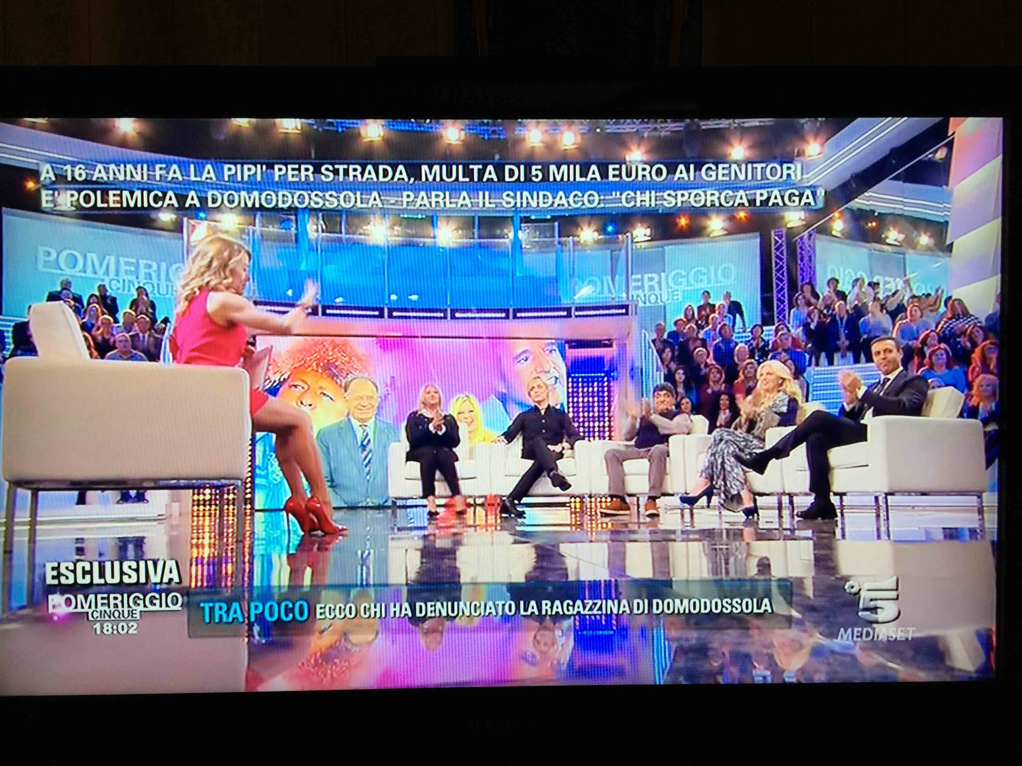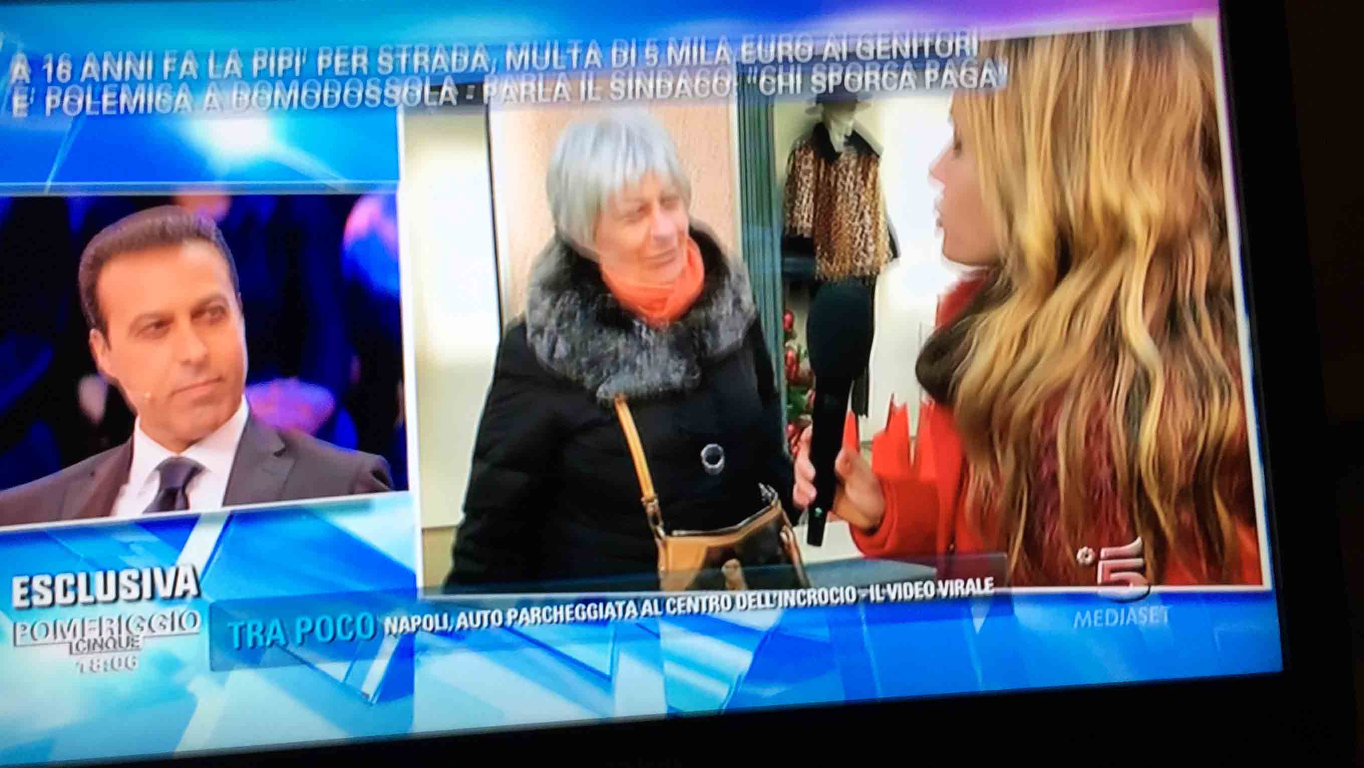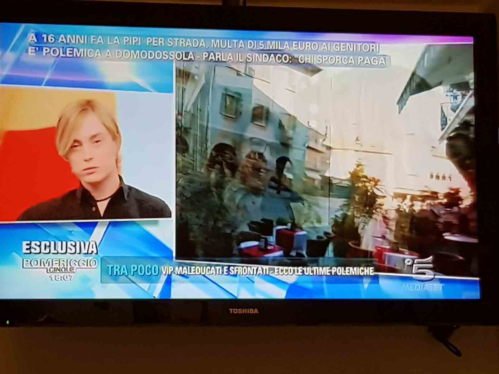 per il sindaco domese Lucio Pizzi, invitato da Barbara D'urso a Pomeriggio 5, popolare trasmissione sulla rete ammiraglia Mediaset, per parlare della multa di 5 mila euro inflitta ai genitori di una ragazzina sedicenne che ha fatto pipì in piazza Mercato. I giornalisti di Canale 5 hanno intervistato un barista di piazza Mercato, che ha spiegato che è stata la donna delle pulizie del suo bar a denunciare la giovane, ed in seguito alla denuncia la polizia locale ha effettuato le indagini, riconoscendo dai video delle telecamere di sicurezza i due amici che erano con la ragazzina, e quindi riuscendo poi ad identificarla e multarla. Il barista ha spiegato che la giovane si è messa tra i tavolini del bar a fare la pipì, intorno alle 4,30 di notte, e che la donna delle pulizia l'ha sgridata, a quel punto si sono intromessi i due amici della ragazzina, che avrebbero inveito contro la donna delle pulizie. In trasmissione molti opinionisti hanno animato la discussione, evidenziando la mancanza di bagni pubblici, la disparità di sanzione rispetto ai 400 euro inflitti alla donna che non aveva raccolto la deiezione del suo cane. In una serie di interviste effettuate ad alcuni passanti in centro a Domo in molti hanno confessato di avere fatto, almeno una volta nella vita, la pipì in strada. Pizzi ha spiegato che la sanzione è quella prevista per legge, ed ha fatto notare a chi obbiettava che era "pericoloso" venire a visitare Domo, che "basta rispettare la legge".