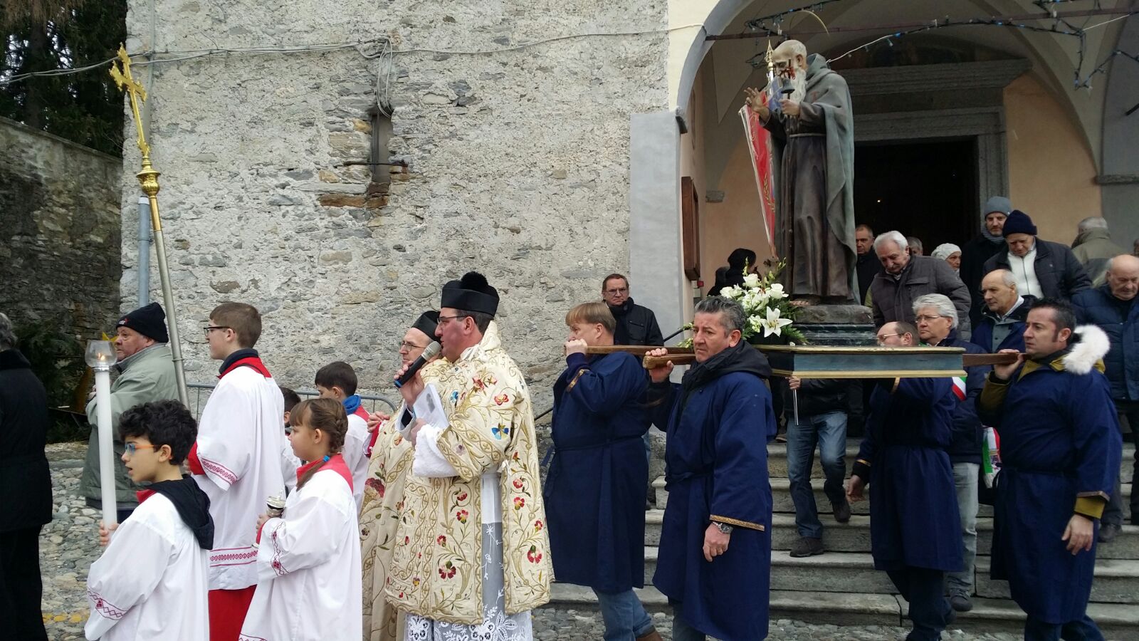 TOCENO- 17-01-2018- Toceno questa mattina ha celebrato il suo santo patrono, Sant'Antonio Abate con la tradizionale festa organizzata dall' Associazione Festeggiamenti Giochi Tocenesi in collaborazione con il comune del popoloso borgo vigezzino. Alla Santa Messa celebrata da don Gianluigi Cerutti e don Paolo Montagnini ha fatto seguito la processione per le vie del paese e la benedizione degli animali e del pane nero. Nonostante si trattasse di un giorno feriale, in tanti hanno preso parte alle celebrazioni, perché è una festa particolarmente sentita in paese, raccontano alcuni organizzatori: Marino Ferraris, vice presidente dell' Associazione Festeggiamenti Giochi Tocenesi, Flavio Zamboni, presidente Gruppo Alpini Toceno e Matteo Bona,presidente pro loco. Il pane nero benedetto oggi dal parroco è stato prodotto dalla panetteria Ielmoli, mentre da un'idea di Giuseppe Bergamaschi, i bambini della scuola materna e primaria del paese hanno realizzato lunedì mattina i " pupit": pane con la forma di un bambino. La manifestazione prosegue oggi pomeriggio con il vespro e l' incanto delle offerte presso la casa parrocchiale. Si conclude alle 21 con la serata danzante con l'orchestra " I Gemelli".