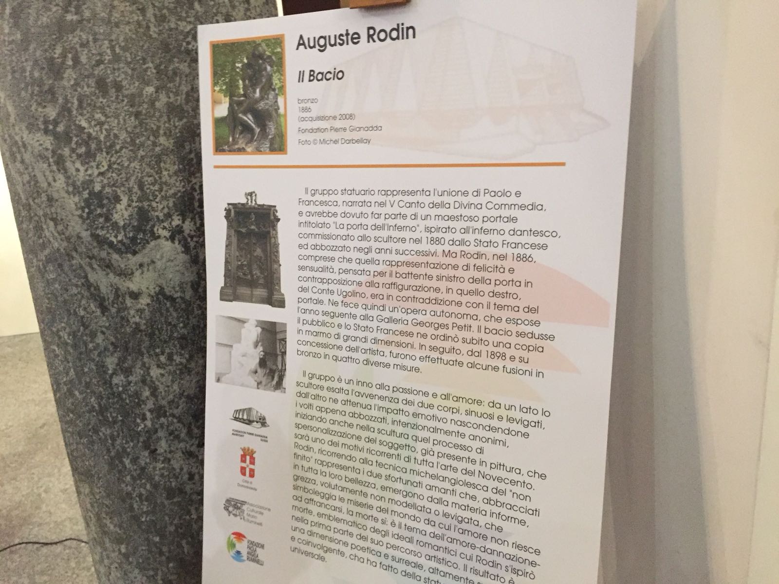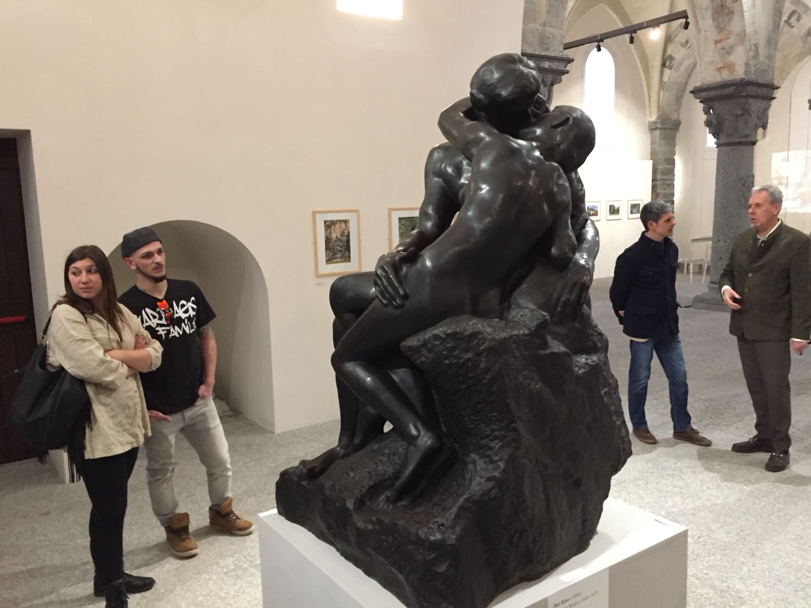 DOMODOSSOLA- 06-04-2018- È stata inaugurata oggi pomeriggio a Palazzo San Francesco la mostra organizzata dalle Fondazioni Ruminelli e Gianadda a cui hanno collaborato l'associazione Mario Ruminelli e il comune di Domodossola. Tra i cinque " baci " più famosi al mondo, l'opera esposta è una riproduzione in bronzo della scultura originale in marmo " Il bacio" di Auguste Rodin che fu autorizzata dallo stesso scultore francese, vissuto a cavallo tra Ottocento e Novecento. " Questa statua trasmette il significato universale dell'amore. Se c'è qualcosa di cui abbiamo bisogno in quest' epoca sono le emozioni " ha detto Antonio Pagani, presidente della Fondazione Paola Angela Ruminelli. " Grazie a Gianadda oggi abbiamo la fortuna di avere il bacio di Rodin, una cosa inimmaginabile per la città di Domodossola" ha dichiarato l'assessore alla cultura Daniele Folino. " Il parco della fondazione Gianadda si può dire che si trasferisce per 40 giorni a Domodossola " ha aggiunto la curatrice della mostra, Sophia Cantinotti.