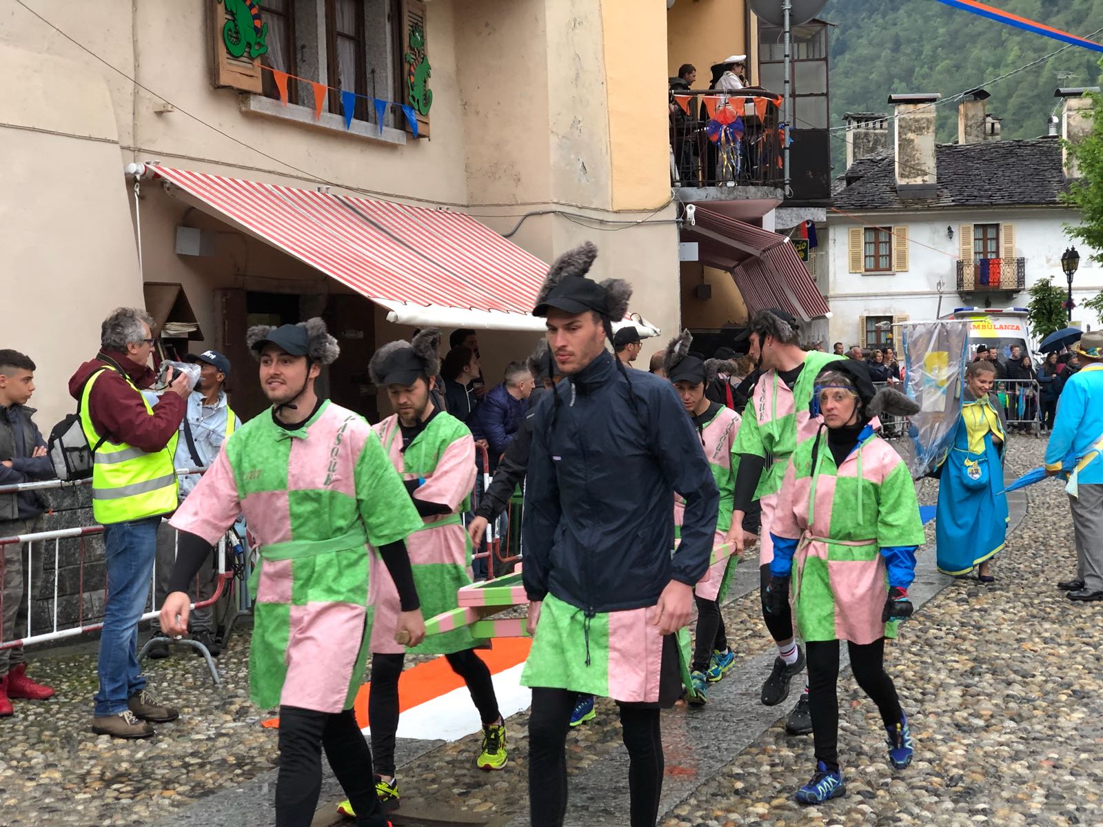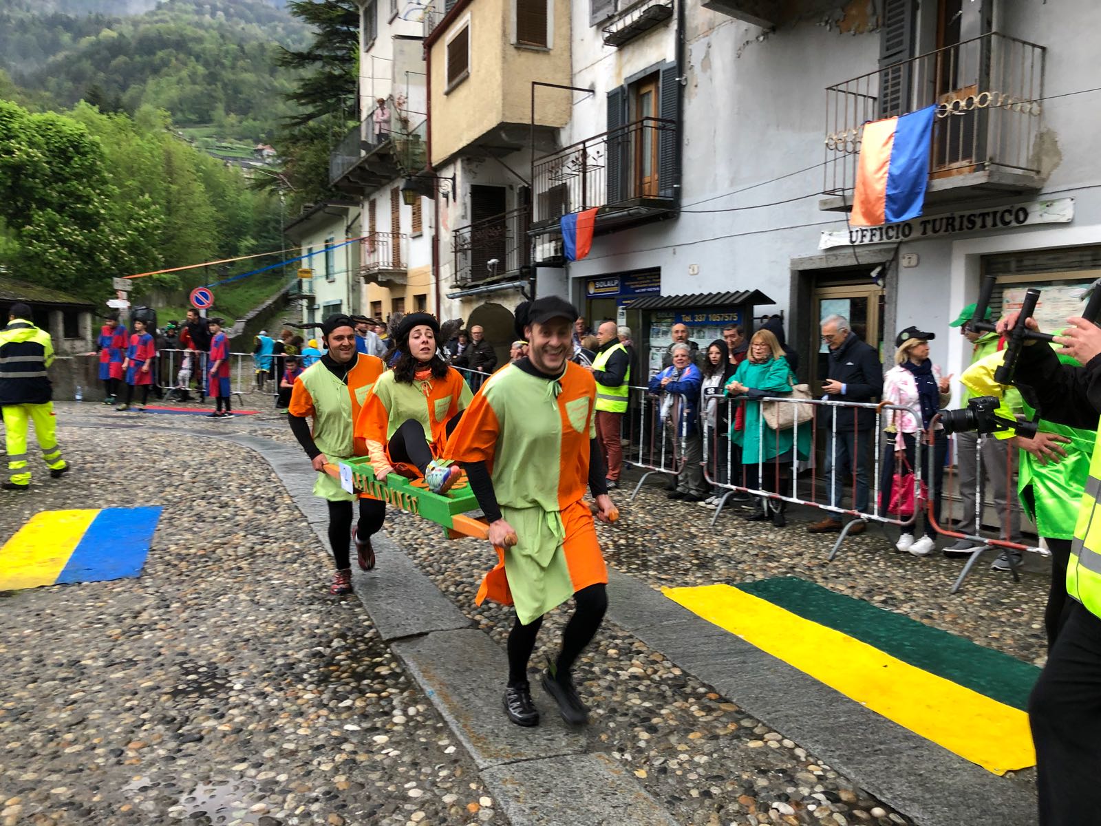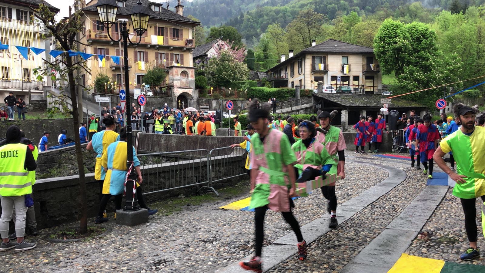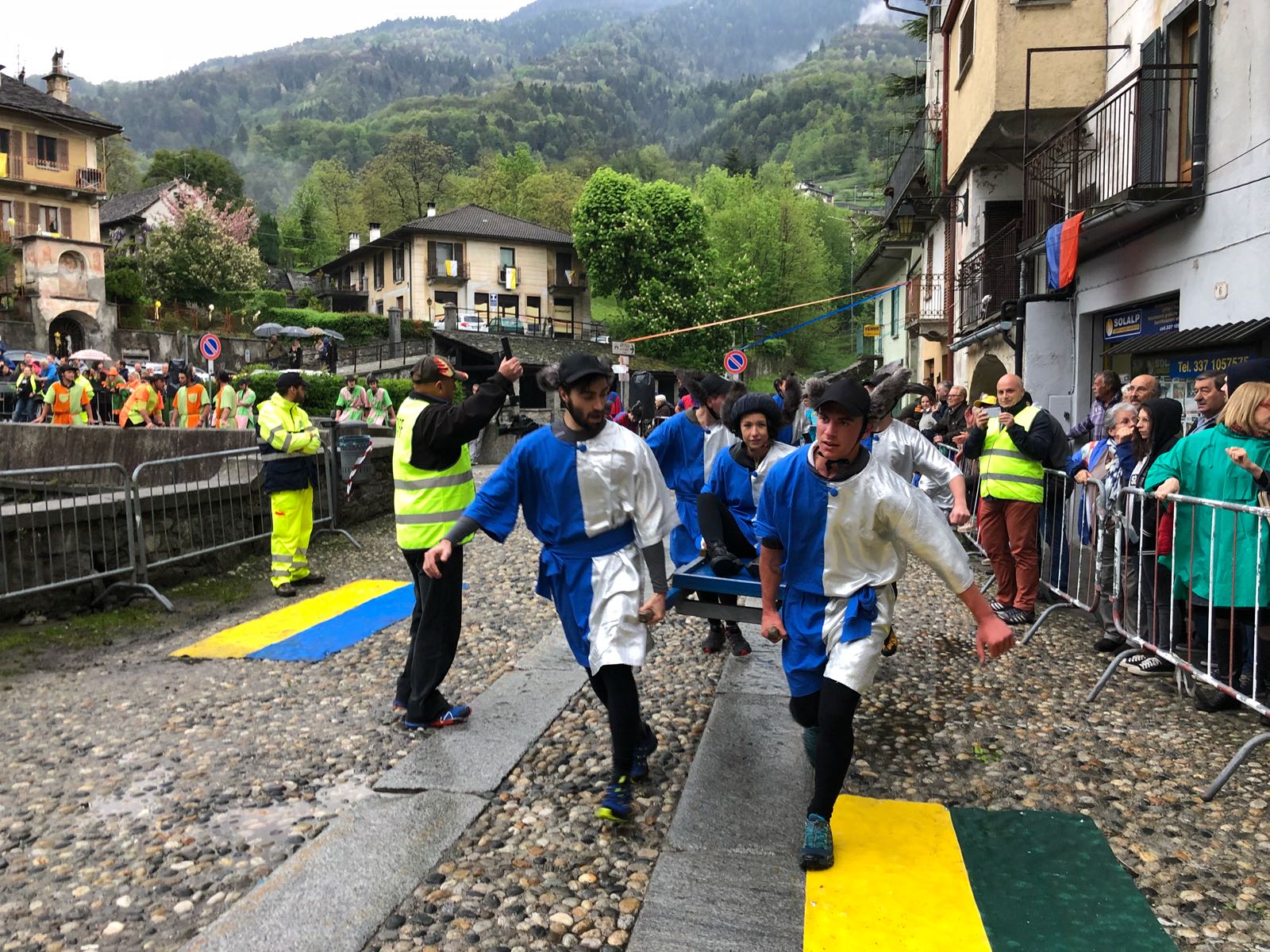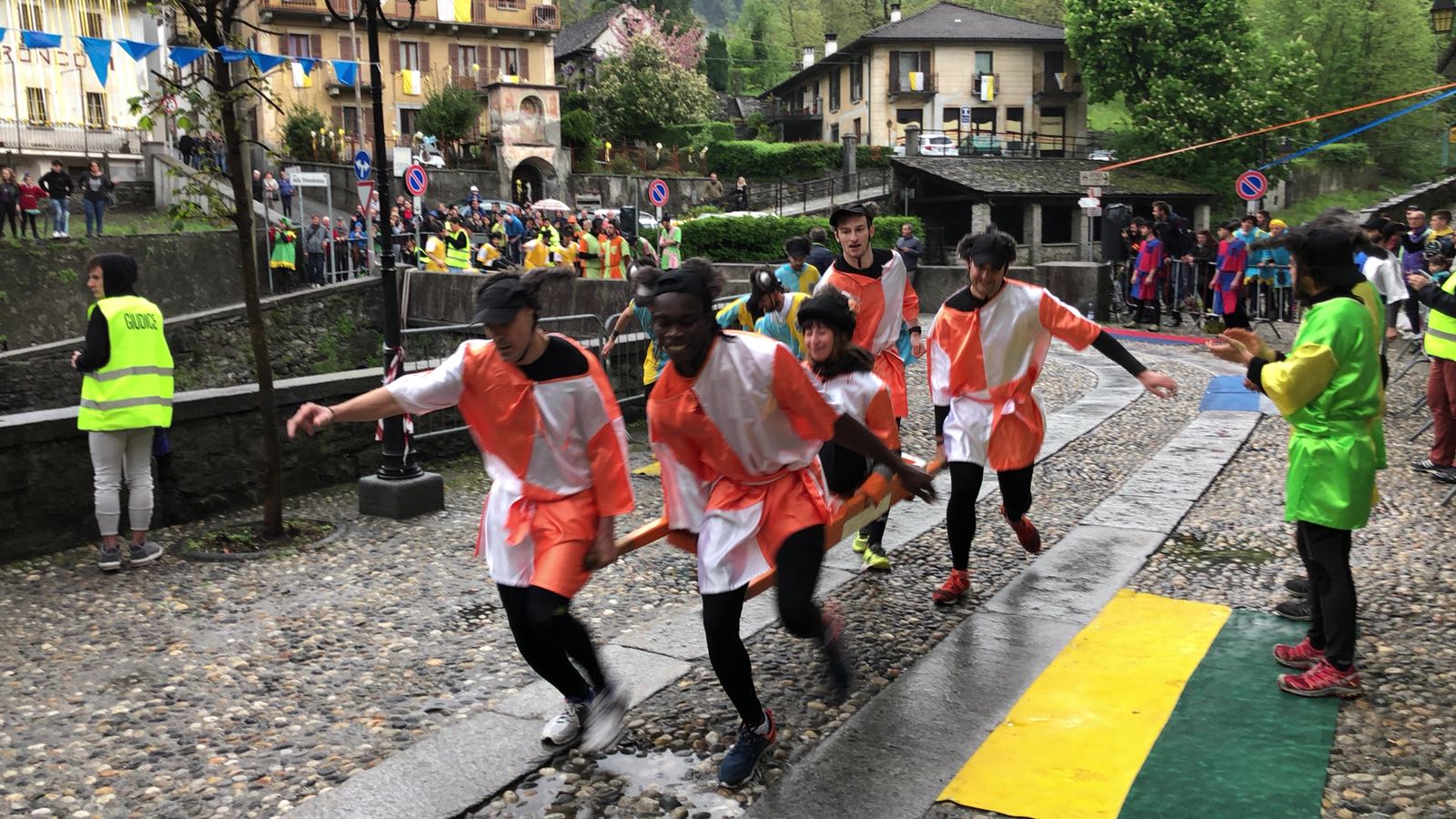VARZO-30-04-2018-Ancora due super serate all’ Aprile Varzese 2018, stasera il tributo ai Litfiba con la miglior tribute band d’Italia 2018, i Santiago, e domani con l’orchestra spettacolo di Matteo Tarantino. In una giornata piovosa si è svolta domenica a Varzo la dodicesima edizione del Palio degli Asini, Palio ormai famoso per il fatto che non sono gli animali a correre, ma le persone, appunto gli Asini di Varzo. Numerosa la presenza di pubblico che ha sfidato il maltempo per assistere ad un Palio unico nel suo genere. Il programma della giornata ha visto la presentazione delle squadre sotto il tendone, dato che il maltempo non ha consentito la sfilata delle frazioni, seguita dall’ esibizione del gruppo bergamasco “Baghet Band”, del Corpo Musicale Varzese e dal minipalio dei bambini, che ha visto ben 40 “asinelli” sfidarsi in una replica del Palio dei grandi, ma senza una classifica ufficiale. Infine il Palio degli Asini. La gara è stata vinta dalla frazione Colla, che dopo il durissimo tratto in salita, ha dato vita ad una rimonta entusiasmante nei tre giri ricavati nel centro del paese. Seconda si è classificata Alneda e terzi i detentori del Palio di Bertonio. Con questo successo la Colla raggiunge Bertonio con quattro palii vinti. Questi i corridori della Colla: Andrea Alberto, Galbiati Giovanni, Comazzi Walter, Ramoni Denis, Ramoni Simone e Sanna Matteo, sulla portantina Fontana Emanuela. La giornata è poi proseguita con la posa della bandiera dei vincitori sull Torre Medioevale, la premiazione delle squadre e la consegna del Palio. In serata la cena delle frazioni con canti, balli e tanta festa con lo spettacolo di Paolo Drigo, ospite ormai fisso del Palio.
