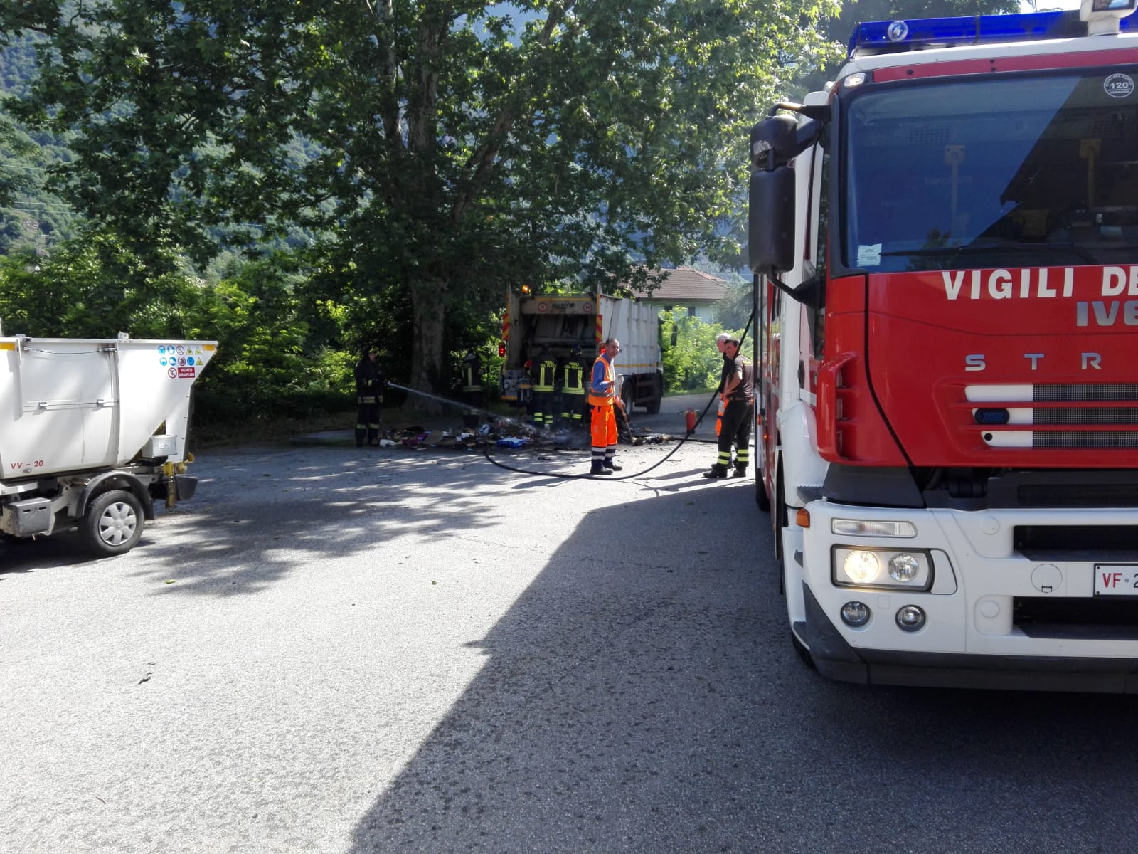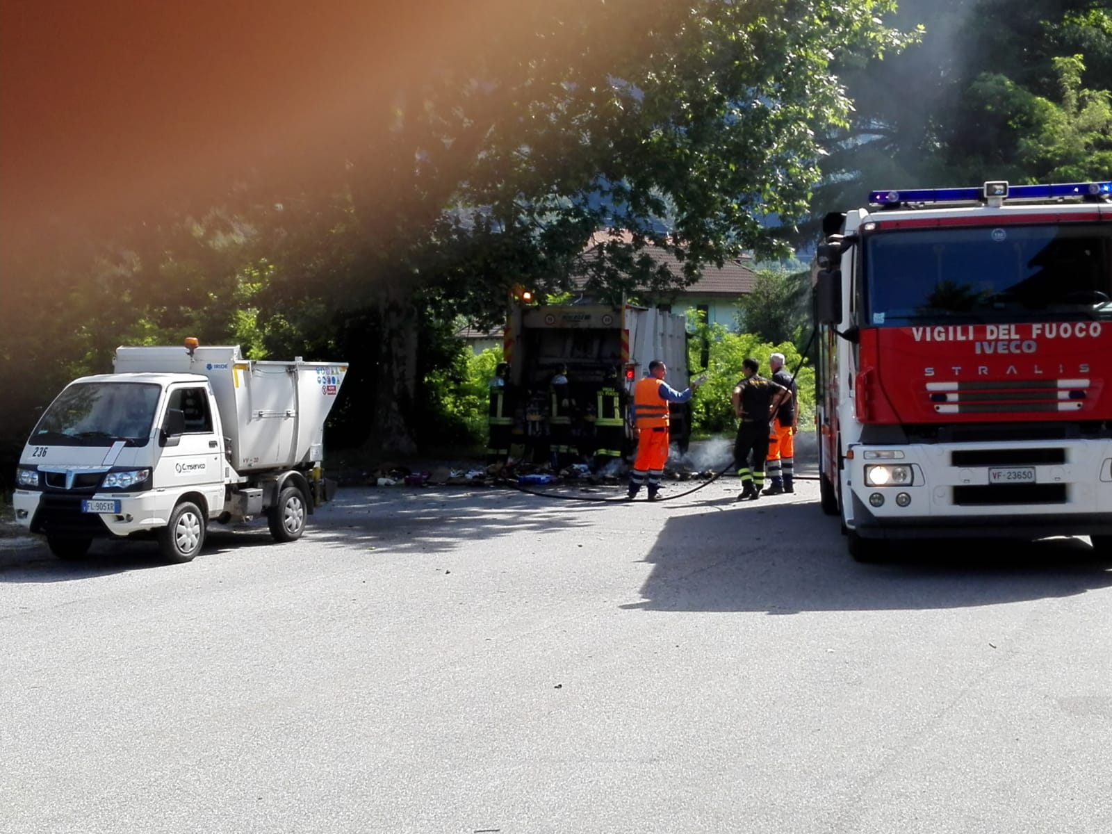 dei rifiuti stamane davanti alal stazioen di Cuzzego. Suk posto i vigili del fuoco che hanno subito spento le fiamme e salvato l'automezzo. Non ci sono feriti. Probabilmente qualcuno aveva buttato un mozzicone di ssigaretta senza spegnerlo nel cestino, che poi è stato svuotato dagli operatori ecologici e buttato insieme agli altri rifiuti.