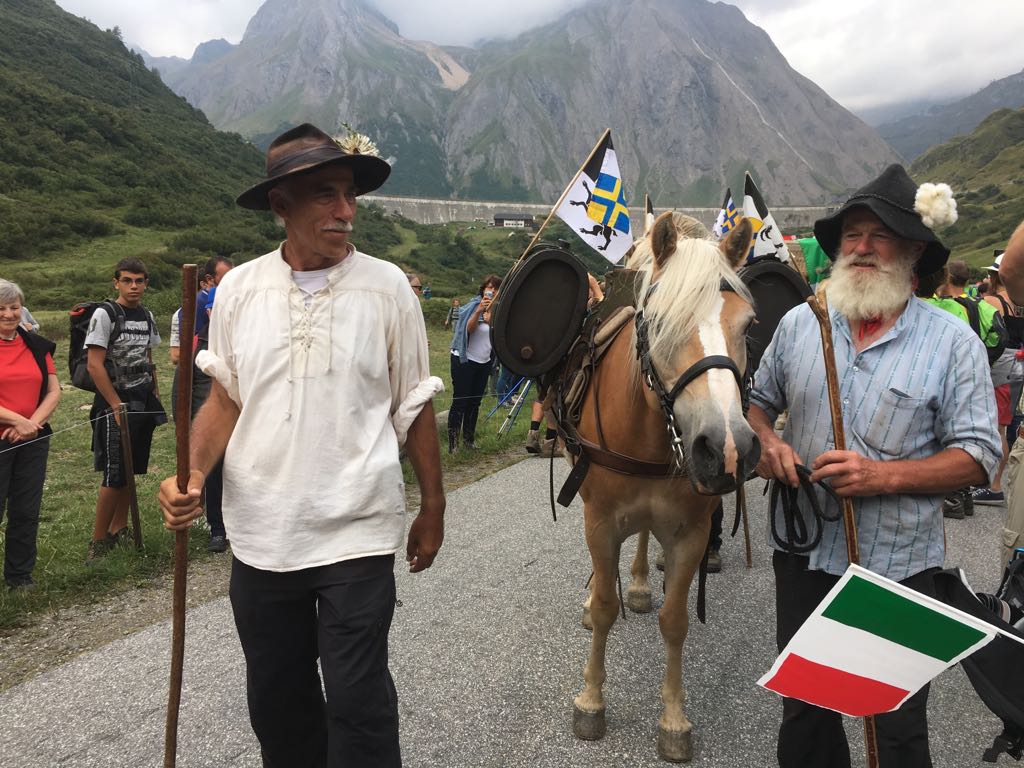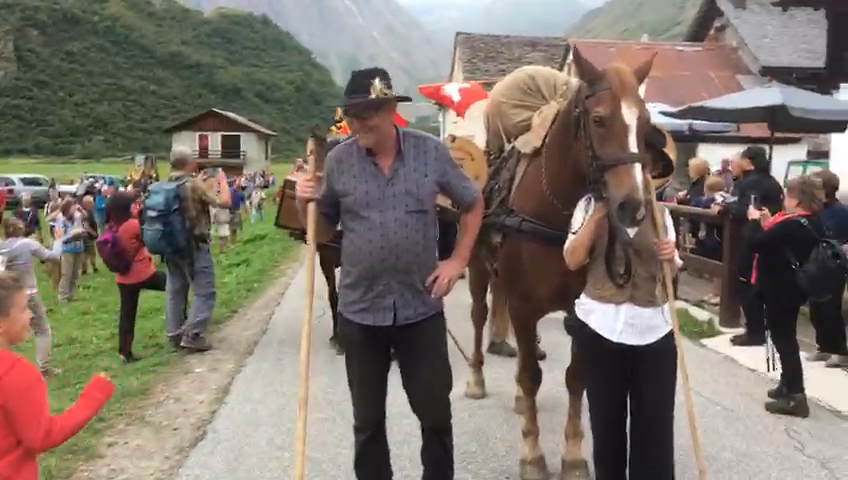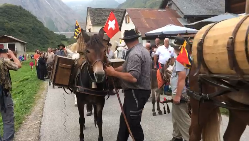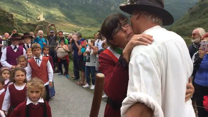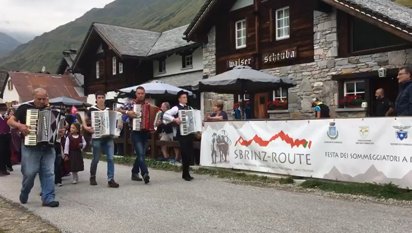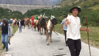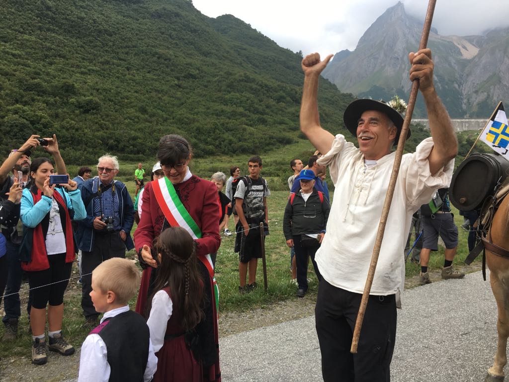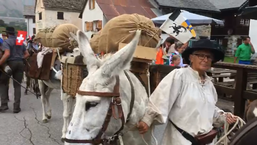 FORMAZZA- 23-08-2018- Il legame antico delle genti alpine e dei loro commerci è stato ancora una volta rinsaldato quest'oggi a Formazza, dove sono arrivati i someggiatori della Sbrinz Route 2018, carovana partita domenica da Lucerna ed attesa sabato a Domodossola col suo carico di formaggi trasportati da asini e cavalli. Bambini e donne in costume walser, le fisarmoniche, il sindaco Bruna Papa con fascia tricolore, tanti turisti, hanno accolto i circa cinquanta partecipanti, poi il consueto saluto ufficiale e lo scambio dei doni, quest'anno due libri dedicati alla valle ed il sempre apprezzato genepy locale. Ora la festa sino a tardi ed il meritato breve riposo in vista della partenza di domattina per Premia.