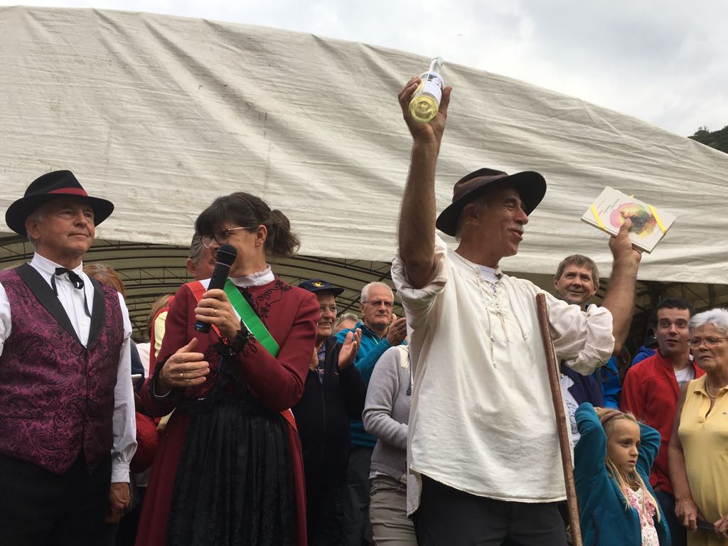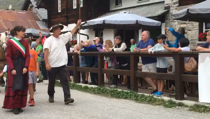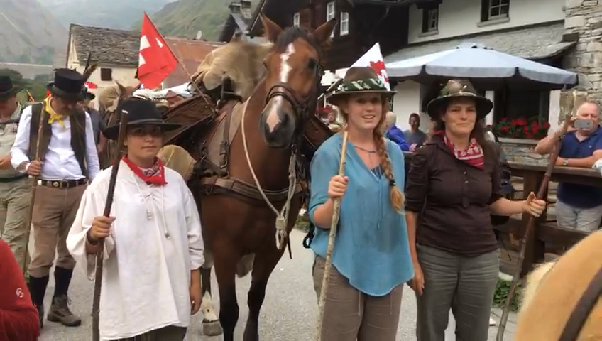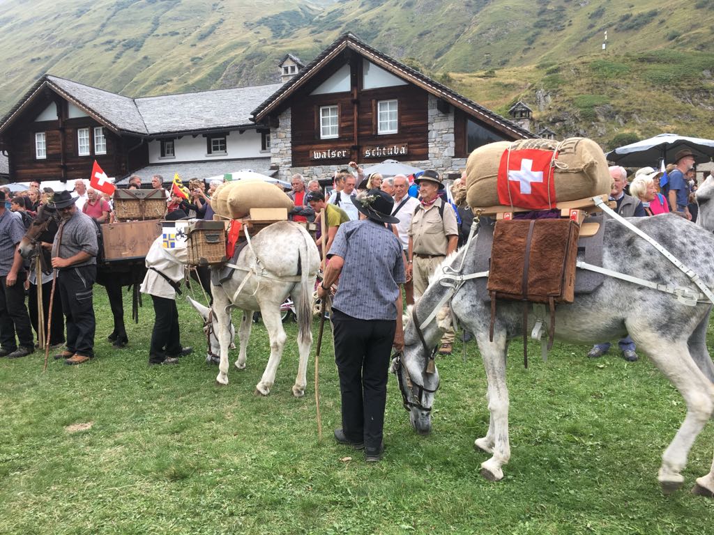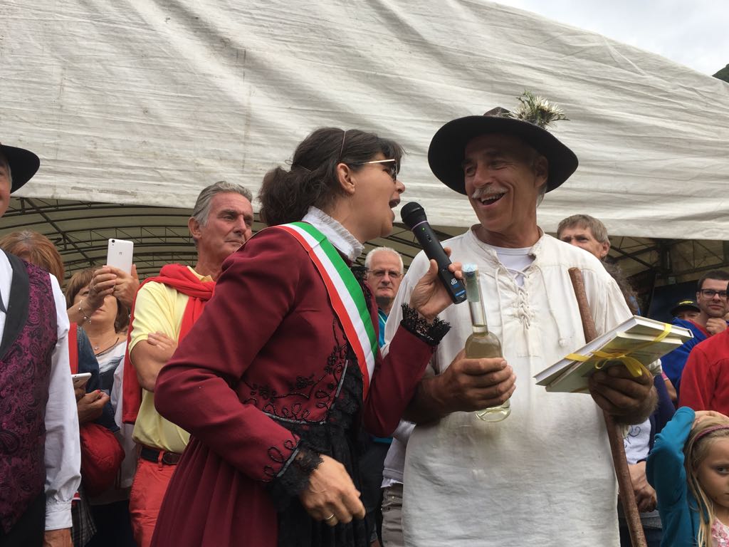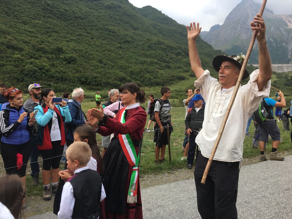 FORMAZZA- 23-08-2018- Il legame antico delle genti alpine e dei loro commerci è stato ancora una volta rinsaldato quest'oggi a Formazza, dove sono arrivati i someggiatori della Sbrinz Route 2018, carovana partita domenica da Lucerna ed attesa sabato a Domodossola col suo carico di formaggi trasportati da asini e cavalli. Bambini e donne in costume walser, le fisarmoniche, il sindaco Bruna Papa con fascia tricolore, tanti turisti, hanno accolto i circa cinquanta partecipanti, poi il consueto saluto ufficiale e lo scambio dei doni, quest'anno due libri dedicati alla valle ed il sempre apprezzato genepy locale. Ora la festa sino a tardi ed il meritato breve riposo in vista della partenza di domattina per Premia.