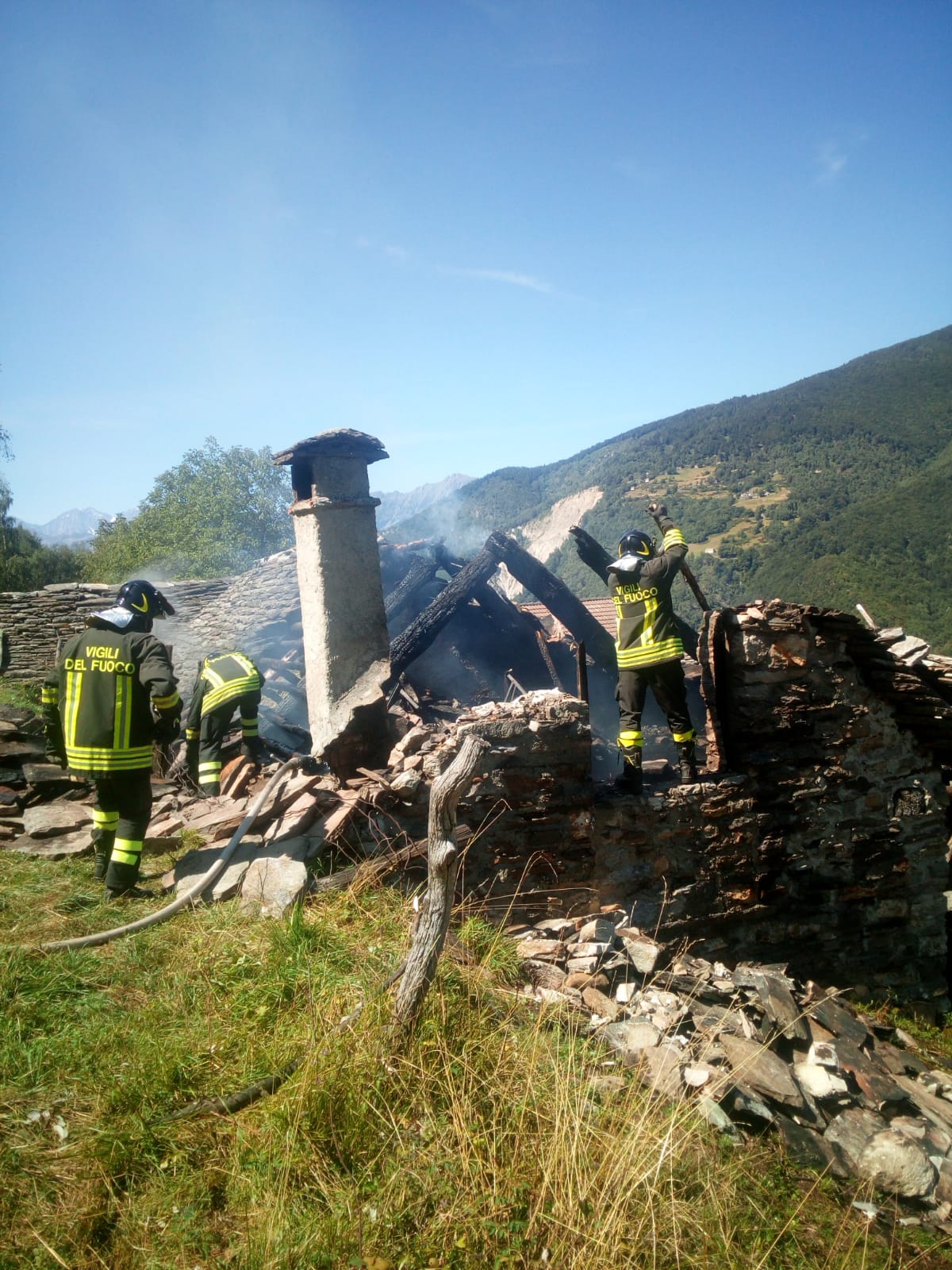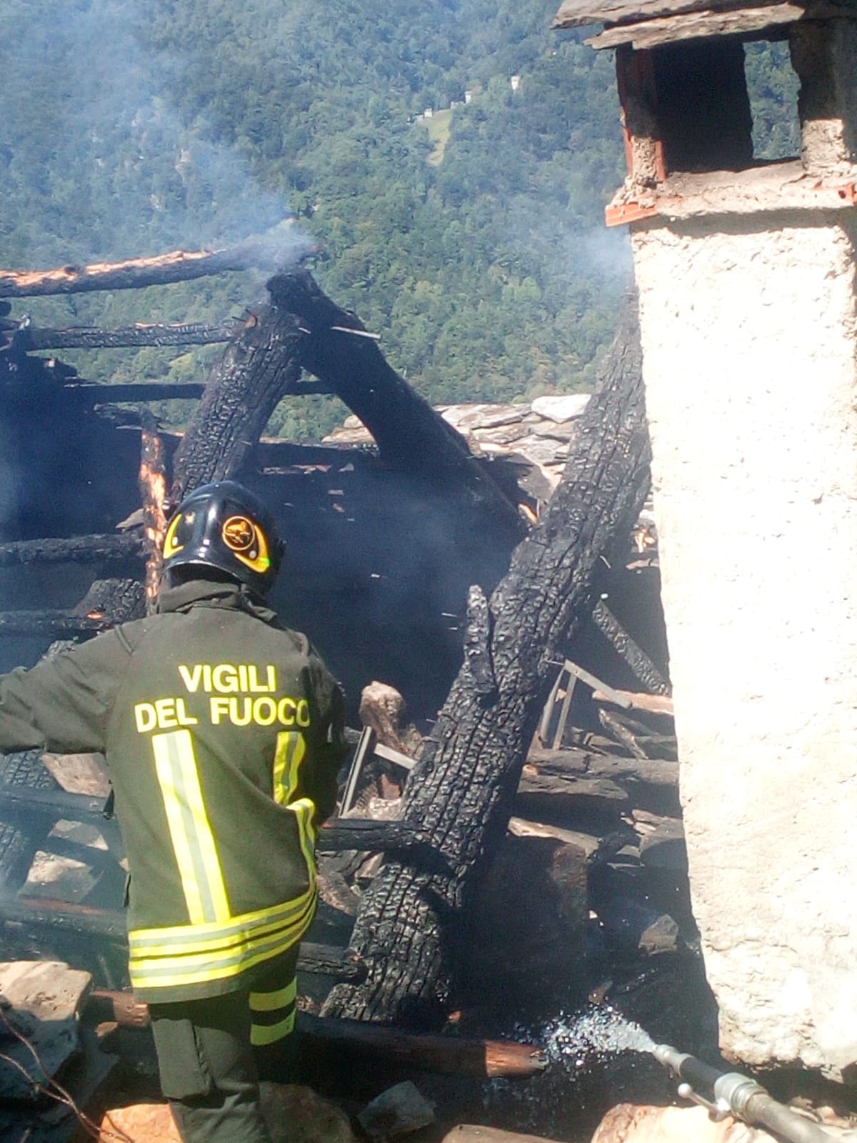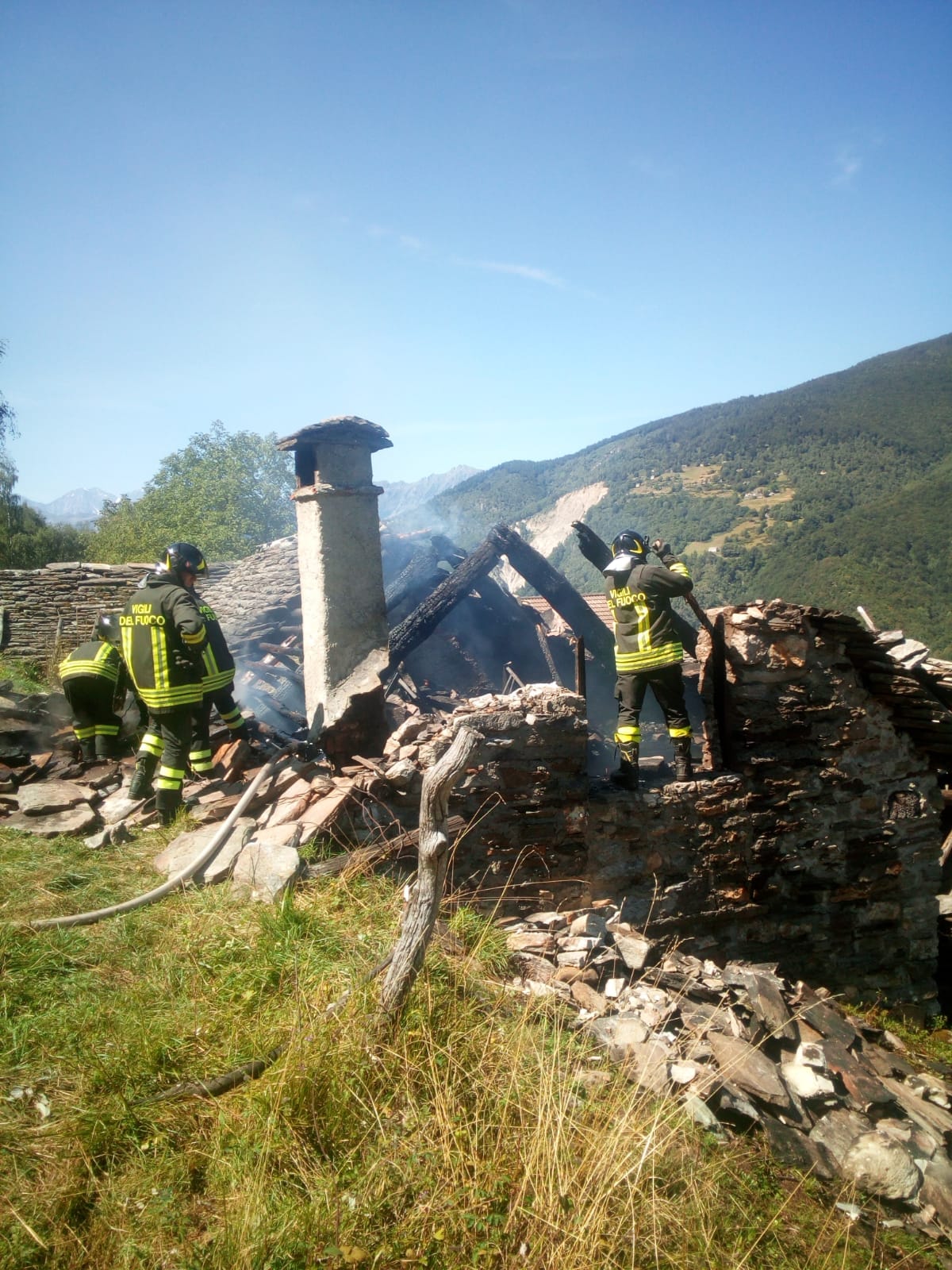 DRUOGNO- 26-08-2018- E' stato un problema alla canna fumaria a causare l'incendio sviluppatosi nel pomeriggio in una baita a Dalovio, alpeggio di Coimo di Druogno, che ha completamente distrutto il tetto. L'intervento per spegnere le fiamme e mettere in sicurezza l'area è durato diverse ore, sul posto, oltre ai carabinieri Forestali, i Vigili del fuoco di Santa Maria Maggiore e Domo e le squadre Aib.