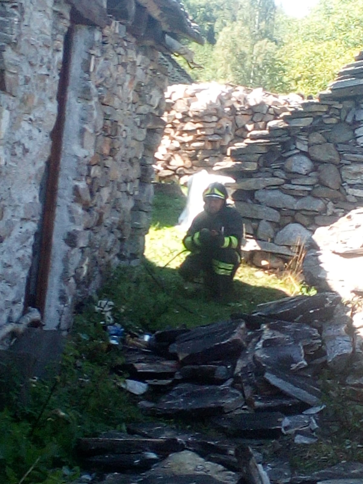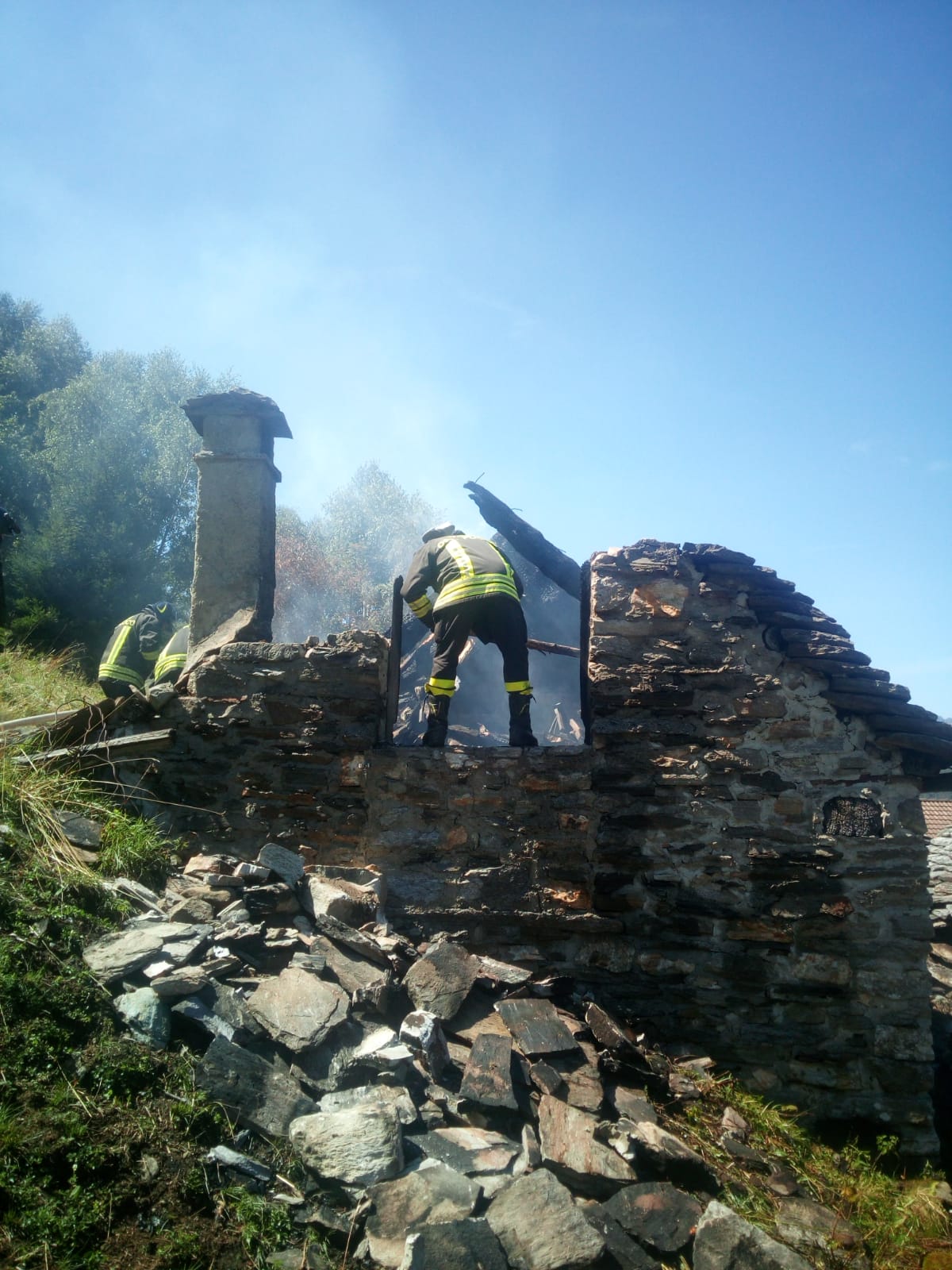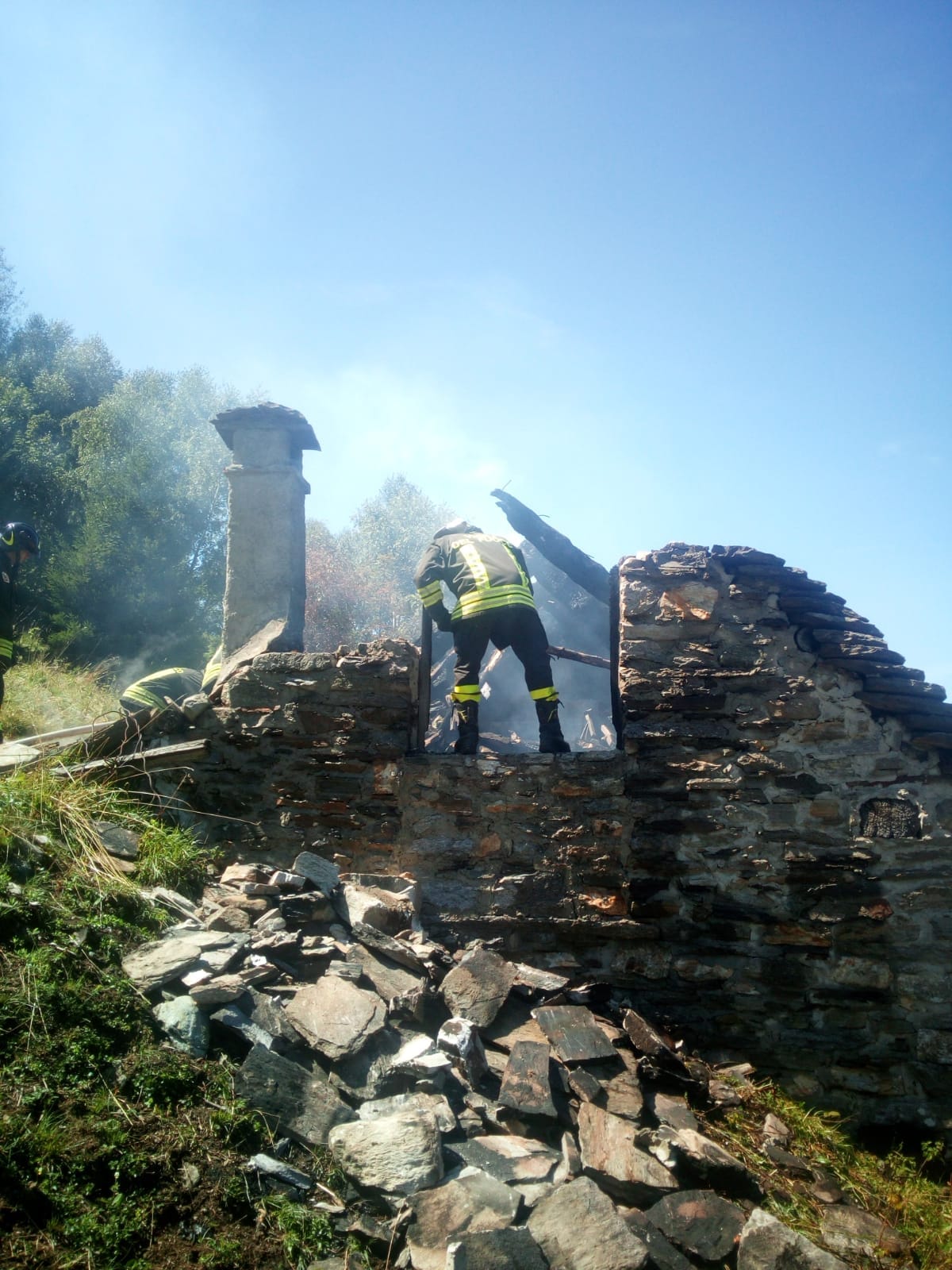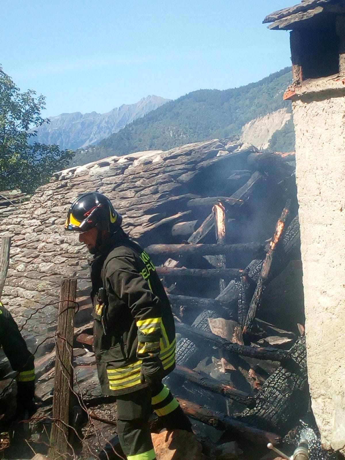 DRUOGNO- 26-08-2018- E' stato un problema alla canna fumaria a causare l'incendio sviluppatosi nel pomeriggio in una baita a Dalovio, alpeggio di Coimo di Druogno, che ha completamente distrutto il tetto. L'intervento per spegnere le fiamme e mettere in sicurezza l'area è durato diverse ore, sul posto, oltre ai carabinieri Forestali, i Vigili del fuoco di Santa Maria Maggiore e Domo e le squadre Aib.