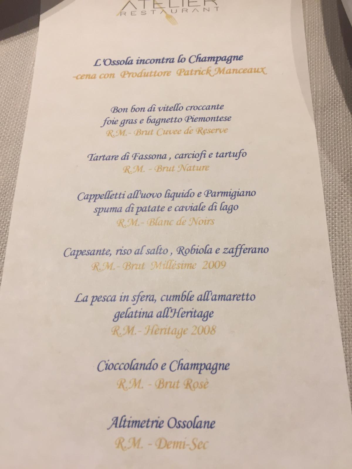 DOMODOSSOLA- 11-11-2018- La ristorazione ossolana negli ultimi anni ha fatto un grande salto, valorizzando l'offerta con nuovi locali che esaltano i prodotti tipici che hanno ottenuto importanti riconoscimenti, dalla Dop dei formaggi alla Doc dei vini. Ora si intravede il passo successivo, l'approdo ad un livello più alto, come dimostra la serata “L'Ossola incontra lo Champagne” presso il ristorante domese Atelier, all'interno dell'albergo Eurossola in piazza Stazione. La serata è stata organizzata da un intraprendente domese, Massimiliano Ferrari, che da un paio d'anni, con la sua “Le mie bolle”, ha avviato una promettente attività di importazione e commercializzazione nel nord Italia di Champagne direttamente dai piccoli produttori di Reims. A spiegare la sua produzione, la differenza tra i vari vini e l'abbinamento con i piatti stellari proposti dallo chef Giorgio Bartolucci è stato direttamente il nipote del fondatore della casa Roger Manceaux, che ha affiancato Massimiliano Ferrari soddisfando ogni curiosità dei presenti.