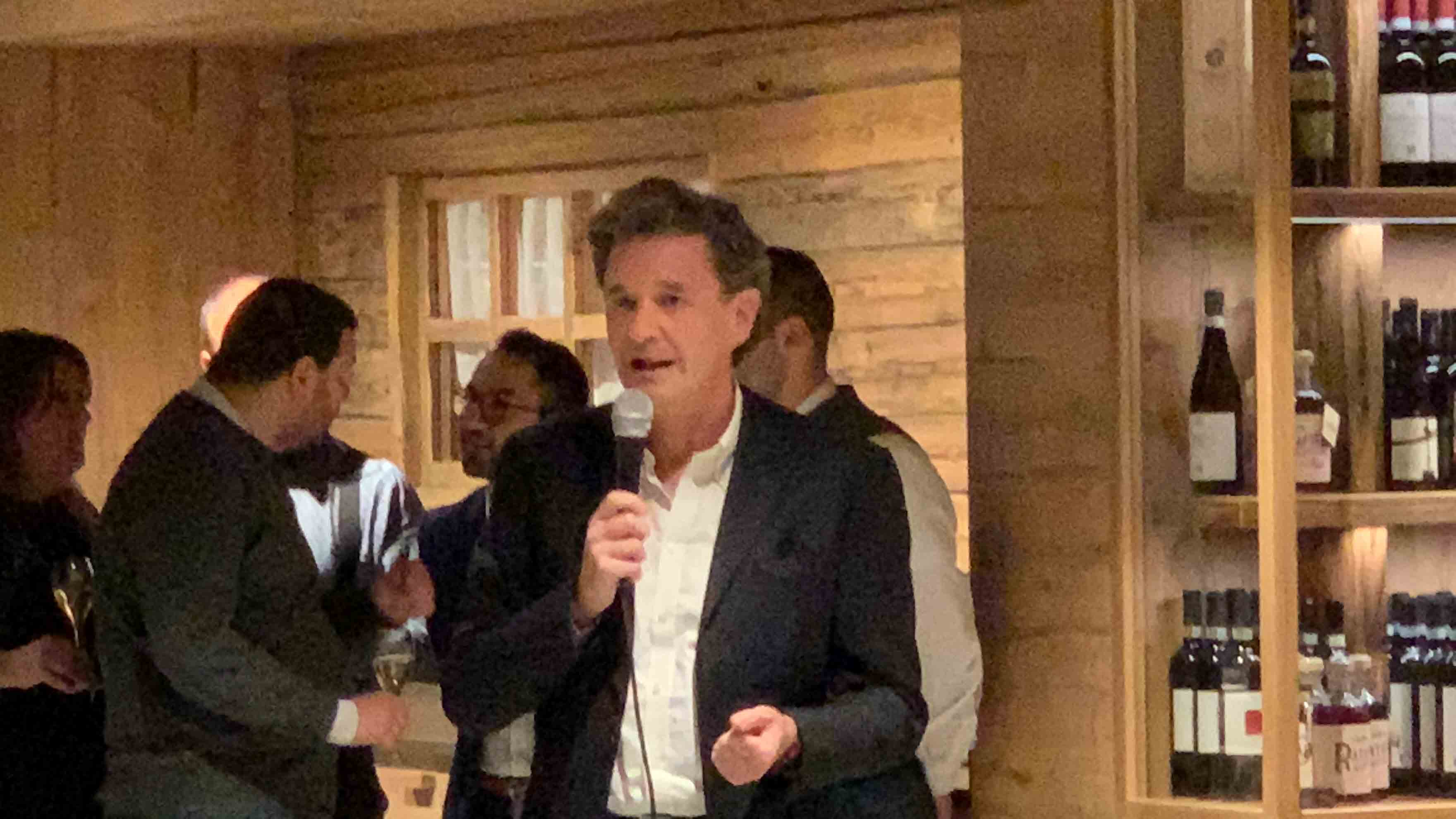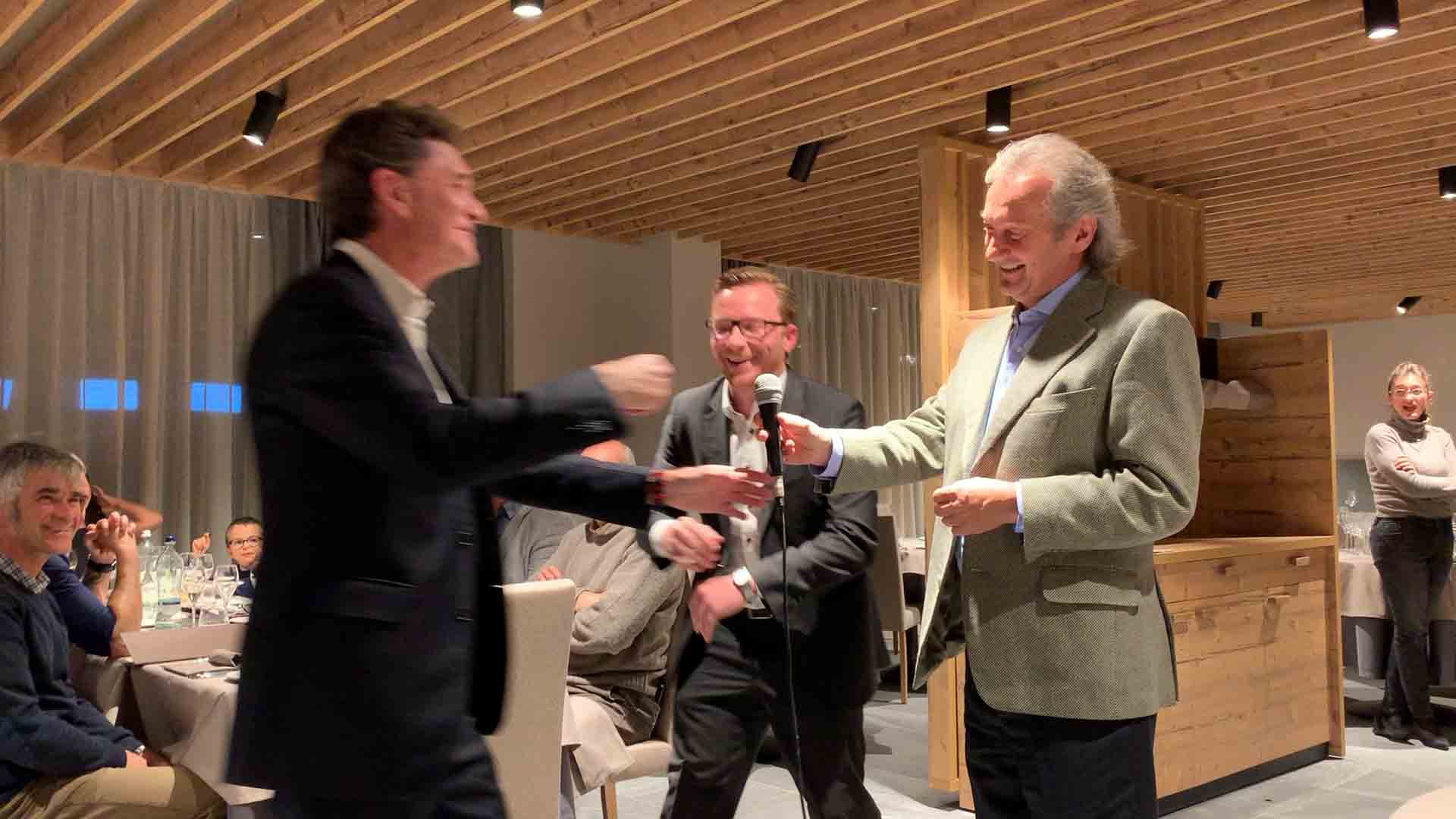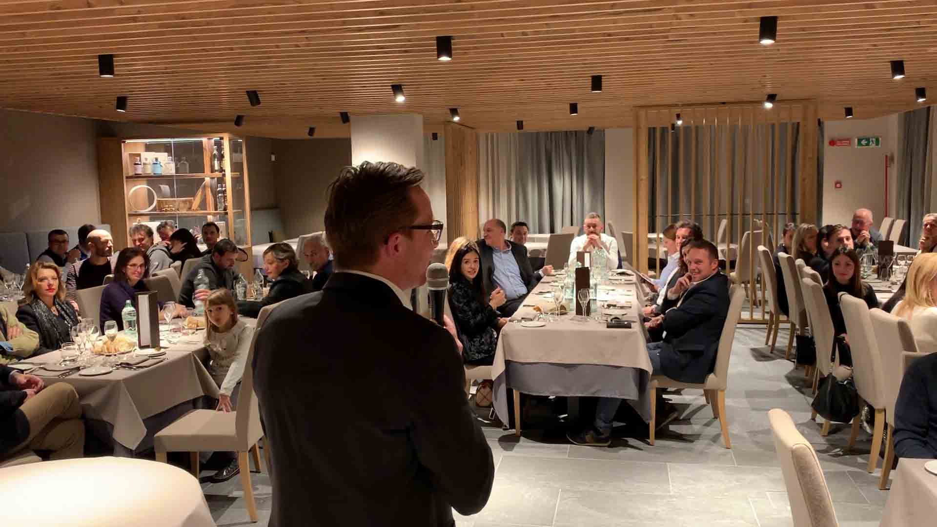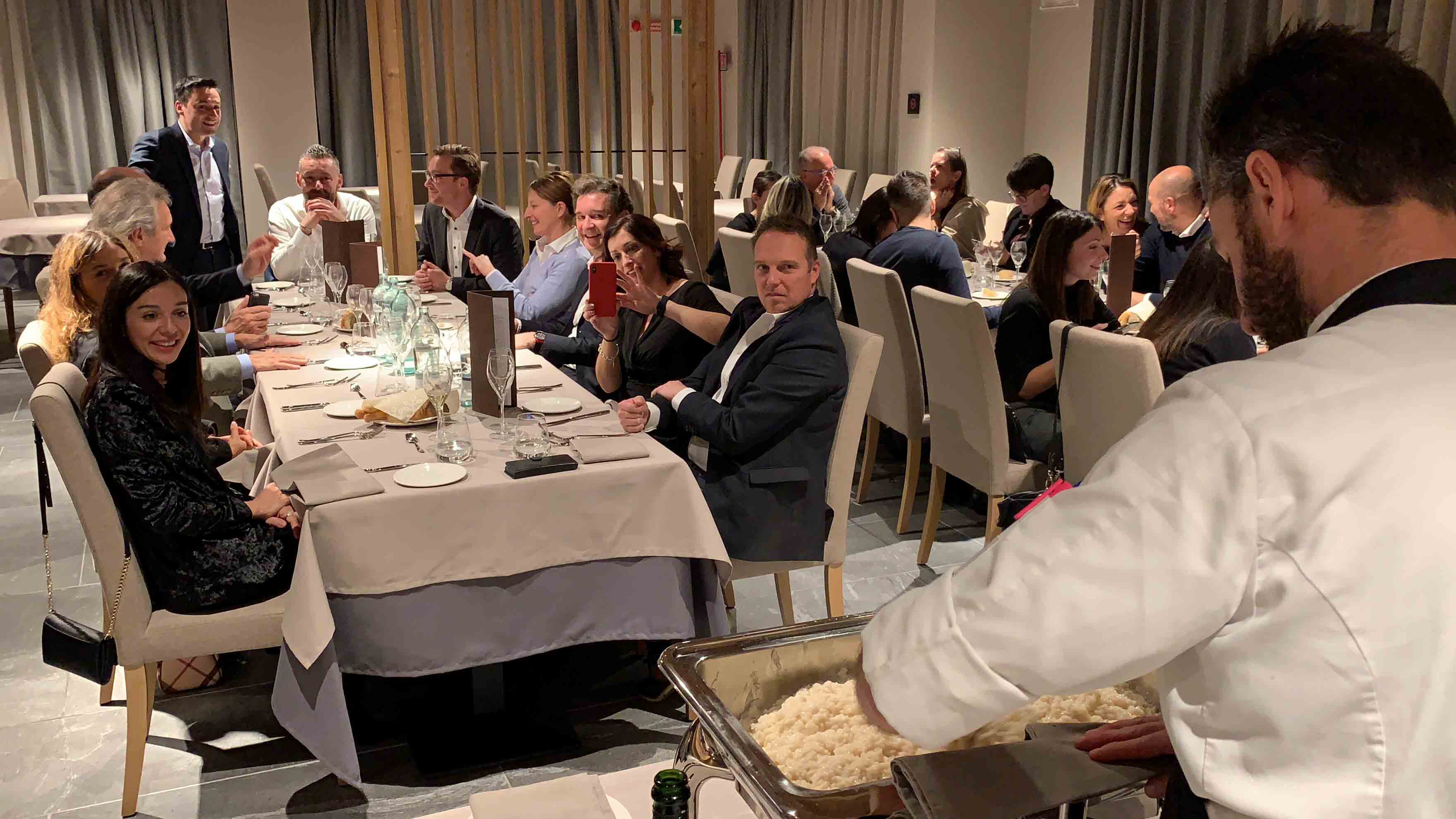 SAN DOMENICO-23-12-2018- Serata vip, la scorsa settimana, all'hotel la Vetta, il gioiello a quattro stelle da 77 camere della Mira Hotels & Resorts appena inaugurato a San Domenico, che ha ricevuto un importante riconoscimento direttamente dalle mani del Barone Philippe Sereys de Rothschild, della pluricentenaria famiglia di banchieri, rinomato produttore di champagne, che ha voluto concedere alla famiglia Malagoni ed alla loro nuova struttura la targa di “ambasciatori” del suo prestigioso vino, primi al mondo a riceverla. La targa è stata consegnata alla presenza di Alessandro Francoli, presidente delle omonime Distillerie famose in tutta Italia, che distribuirà lo champagne Rothschild nel Bel Paese, e di Daniela Righi, amministratore delegato degli Hotels Mira davanti ai giornalisti delle principali testate italiane di turismo ed a vari tour operator. Per tutti poi una cena stellata abbinata ai tre tipi di Champagne della maison Rothschild. Il Barone ha soggiornato una notte a San Domenico, prima di partire in elicottero ha ringraziato il personale della struttura per la professionalità e l'ospitalità. Per il turismo ossolano si intravede una possibilità di sviluppo, e di qualità, fino a qualche anno fa davvero impensabile.