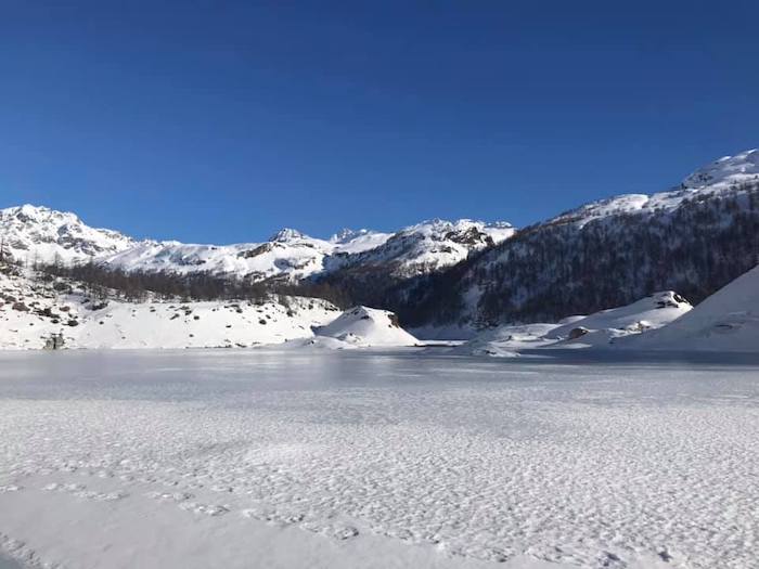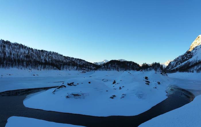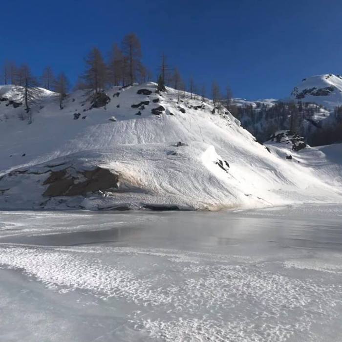 BACENO - 02-12-2019 - Il lago gelato di Codelago s'è ripreso il suo spazio, per l'ammirazione dei tanti escursionisti che in questi giorni di festa si sono recati al Devero. Ma dall'ente di gestione delle Aree Protette dell'Ossola giunge un avviso importante, poiché lo strato di ghiaccio è sottile in molti punti, una condizione anomala per la stagione. "La traversata del lago gelato di Codelago all’alpe Devero è un itinerario molto frequentato che attira ogni inverno escursionisti e ciaspolatori. Quest’anno il lago, essendo in corso interventi di manutenzione delle dighe, è stato svuotato ed è tornato alle dimensioni originarie di inizio Novecento, prima degli interventi di utilizzo idroelettrico. Una condizione straordinaria che permette di vedere il lago come era un secolo fa. Le condizioni ambientali tuttavia sconsigliano fermamente l’attraversamento del lago in quanto le forti escursioni termiche hanno impedito il formarsi di un consistente strato di ghiaccio".