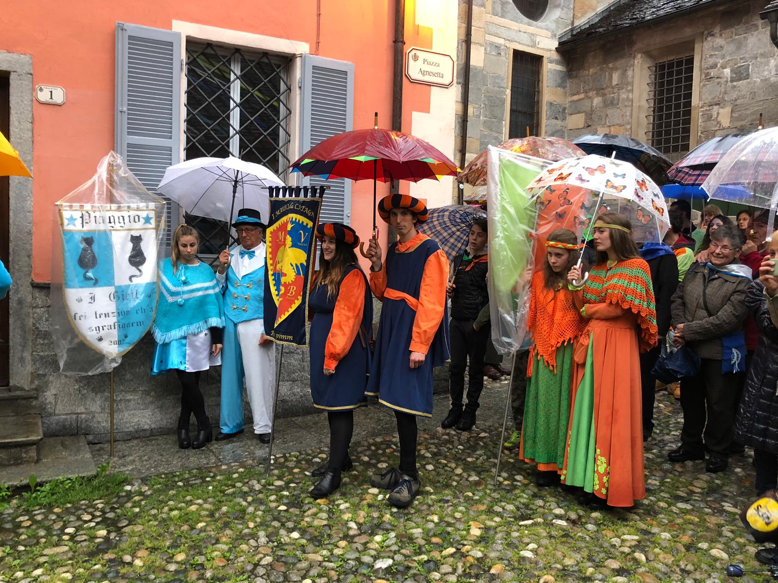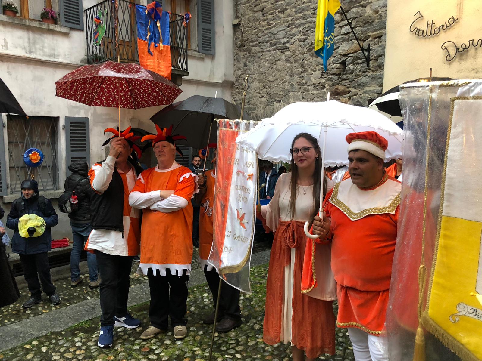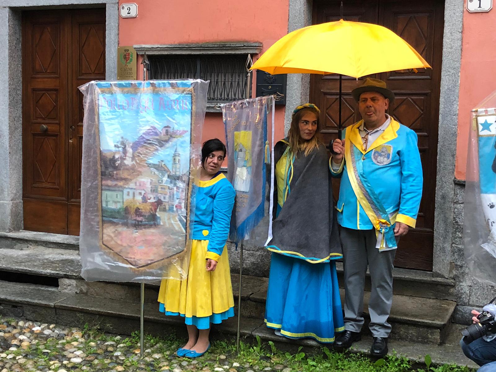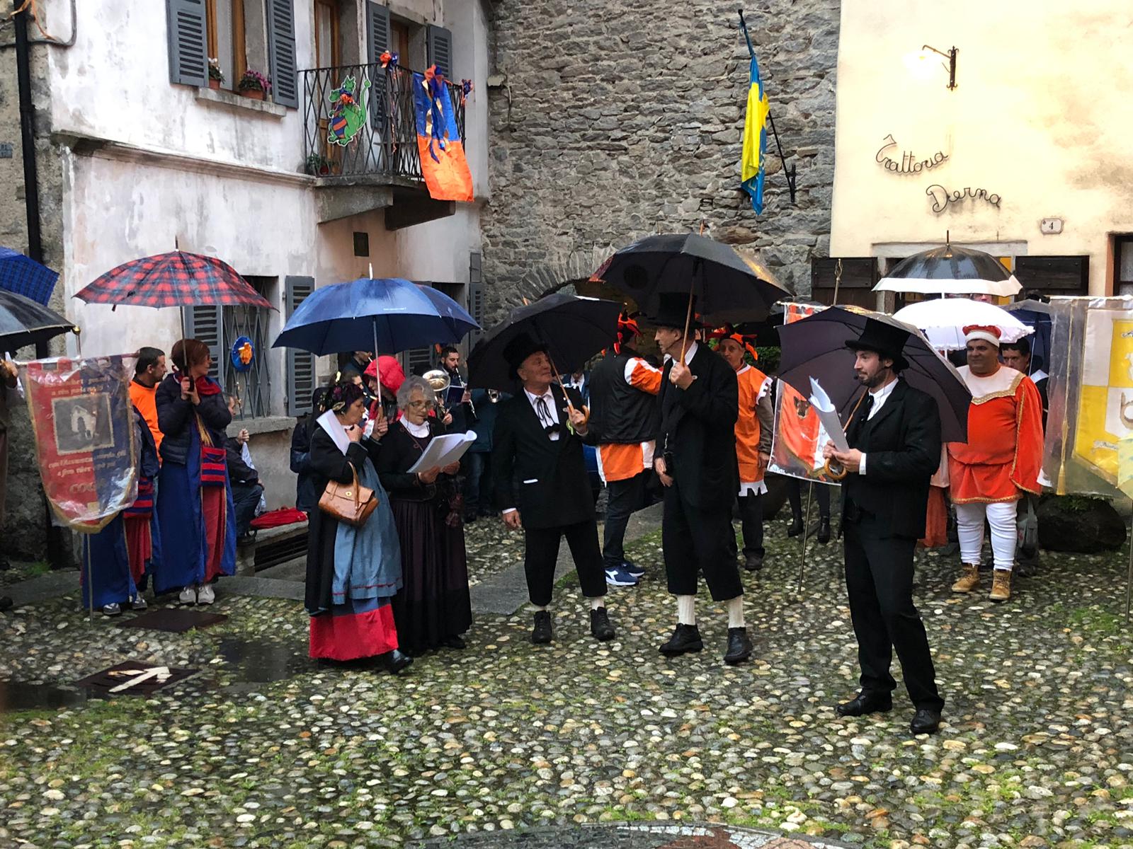 Sotto una fitta pioggia, ma per domenica San Giorgio ha garantito il bel tempo, il neo presidente Gianluca Gaule seguito dalle dieci frazioni e dai quattro personaggi storici di Varzo ha prima ottenuto la benedizione di don Marco e poi l’autorizzazione del sindaco per la disputa del Palio.