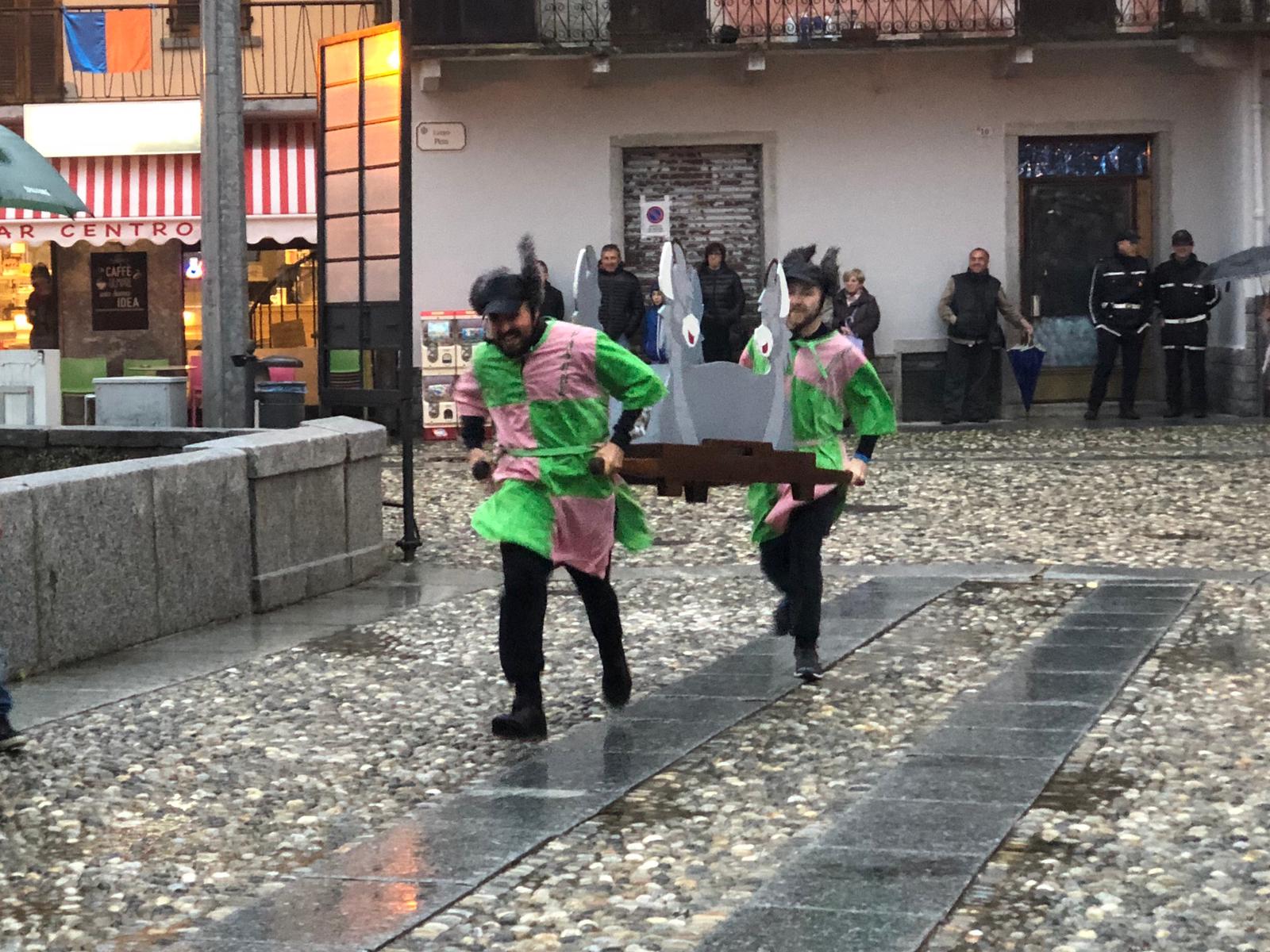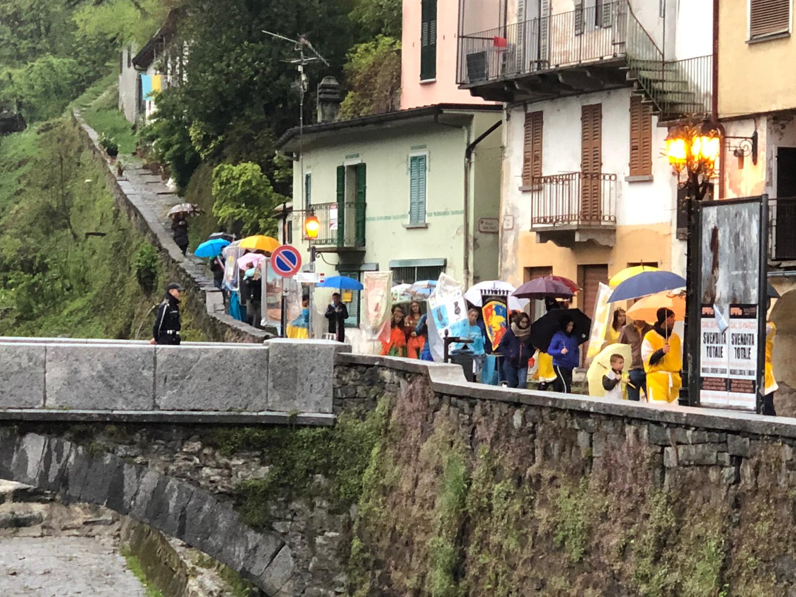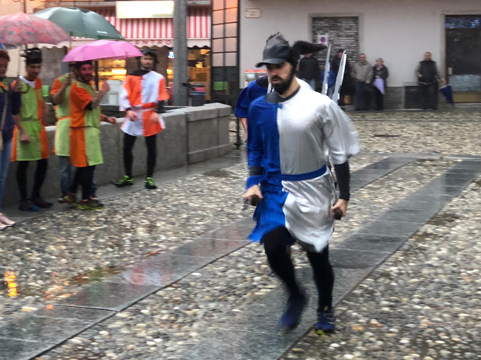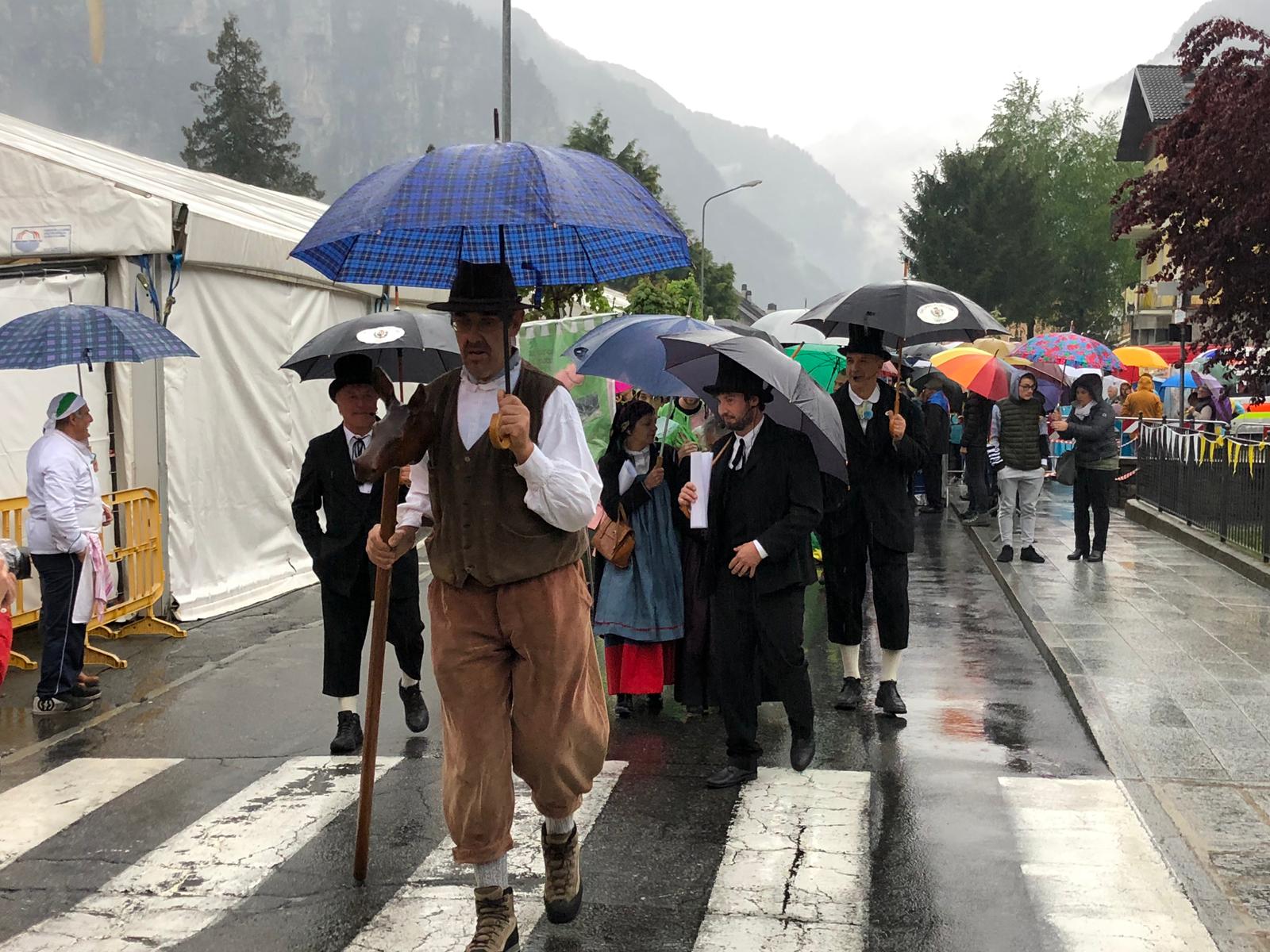 Sotto una fitta pioggia, ma per domenica San Giorgio ha garantito il bel tempo, il neo presidente Gianluca Gaule seguito dalle dieci frazioni e dai quattro personaggi storici di Varzo ha prima ottenuto la benedizione di don Marco e poi l’autorizzazione del sindaco per la disputa del Palio.