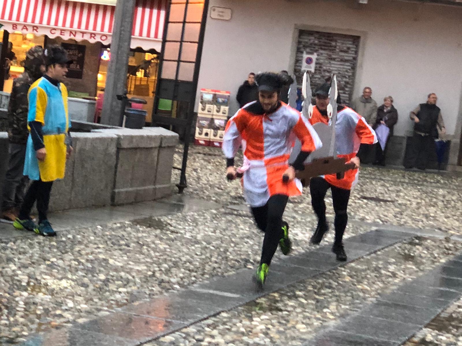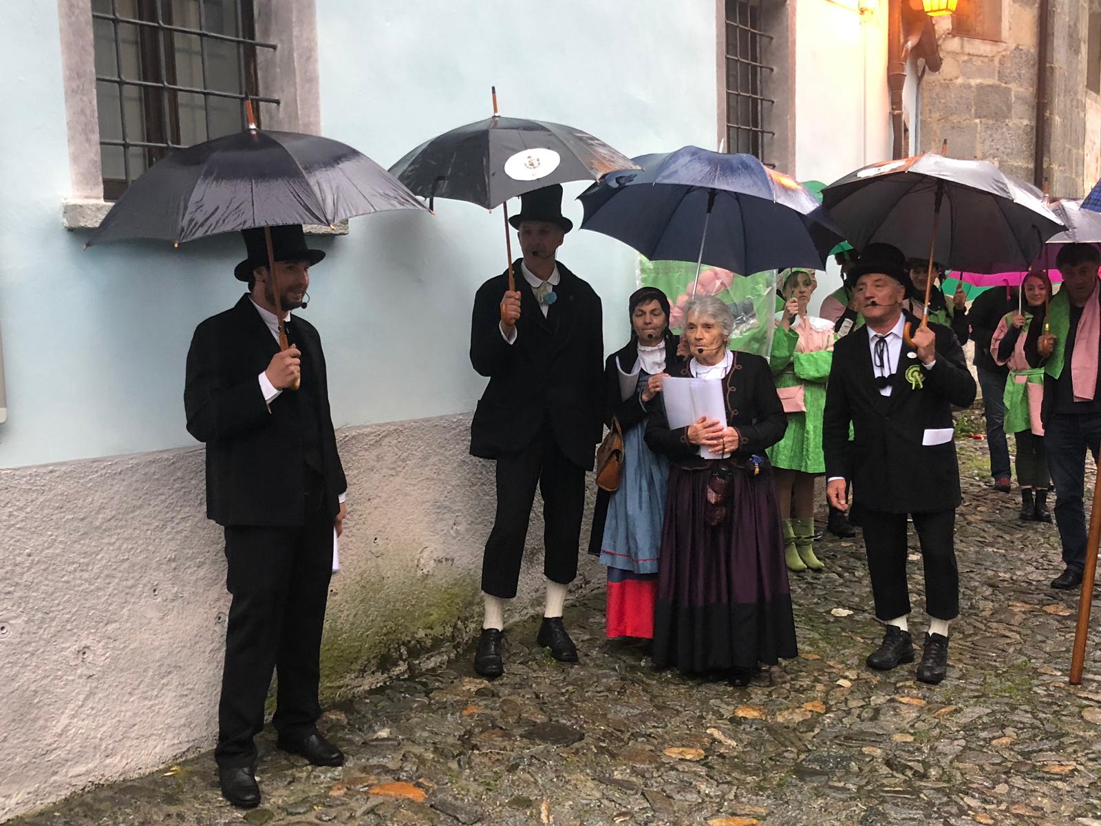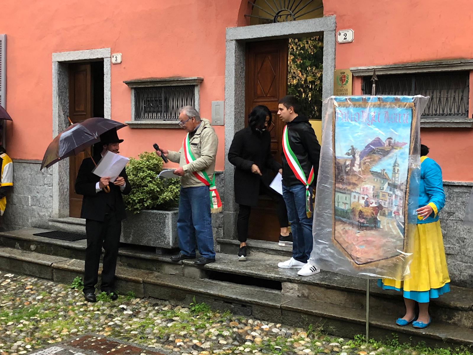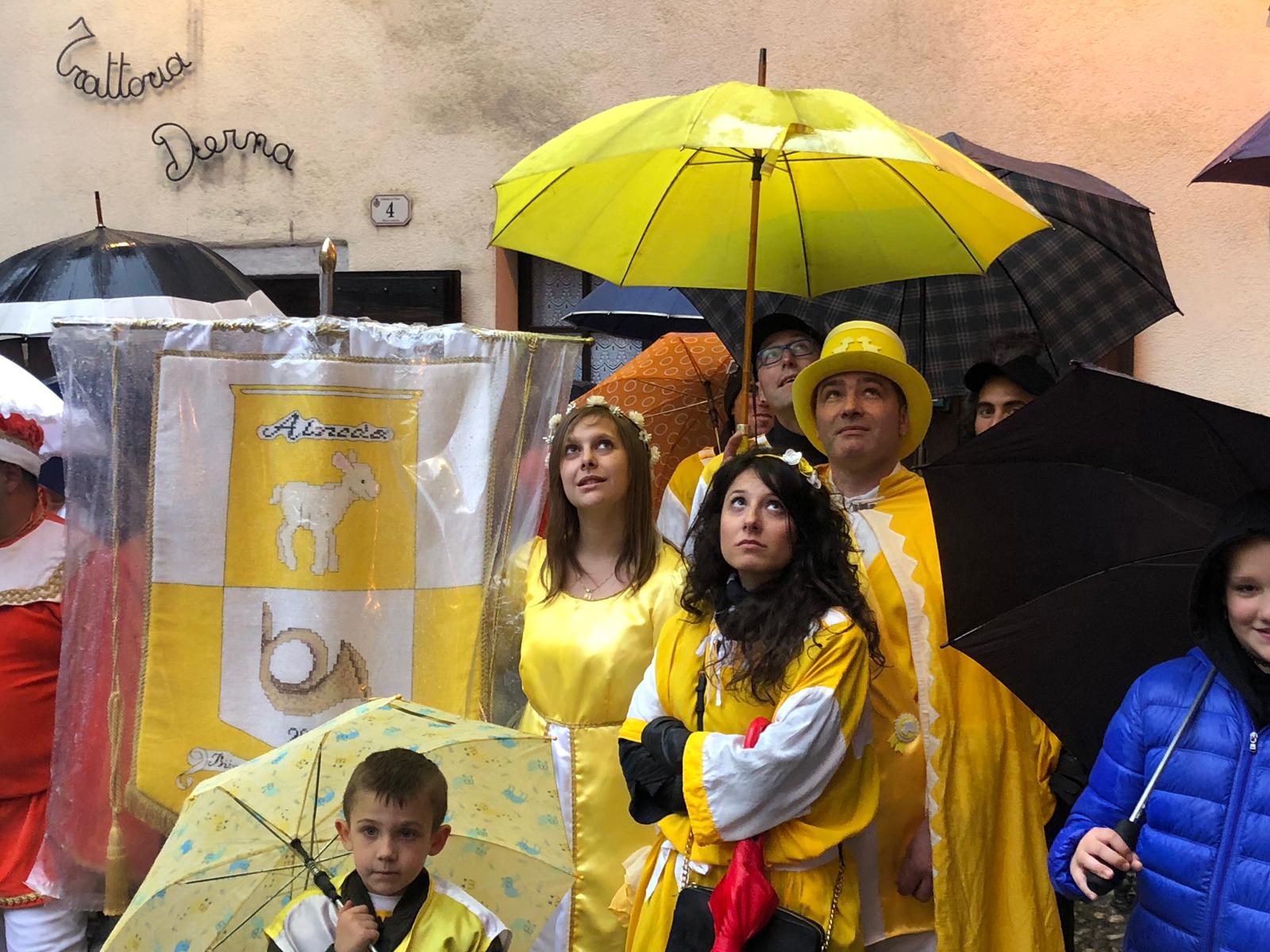 Sotto una fitta pioggia, ma per domenica San Giorgio ha garantito il bel tempo, il neo presidente Gianluca Gaule seguito dalle dieci frazioni e dai quattro personaggi storici di Varzo ha prima ottenuto la benedizione di don Marco e poi l’autorizzazione del sindaco per la disputa del Palio.