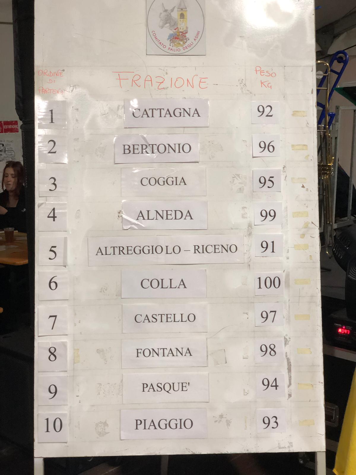 La sorte ha attribuito alla Colla i temuti 100 chili mentre i più fortunati sono stati gli abitanti di Altreggiolo-Riceno che domenica correranno con “soli” 91 chilogrammi.