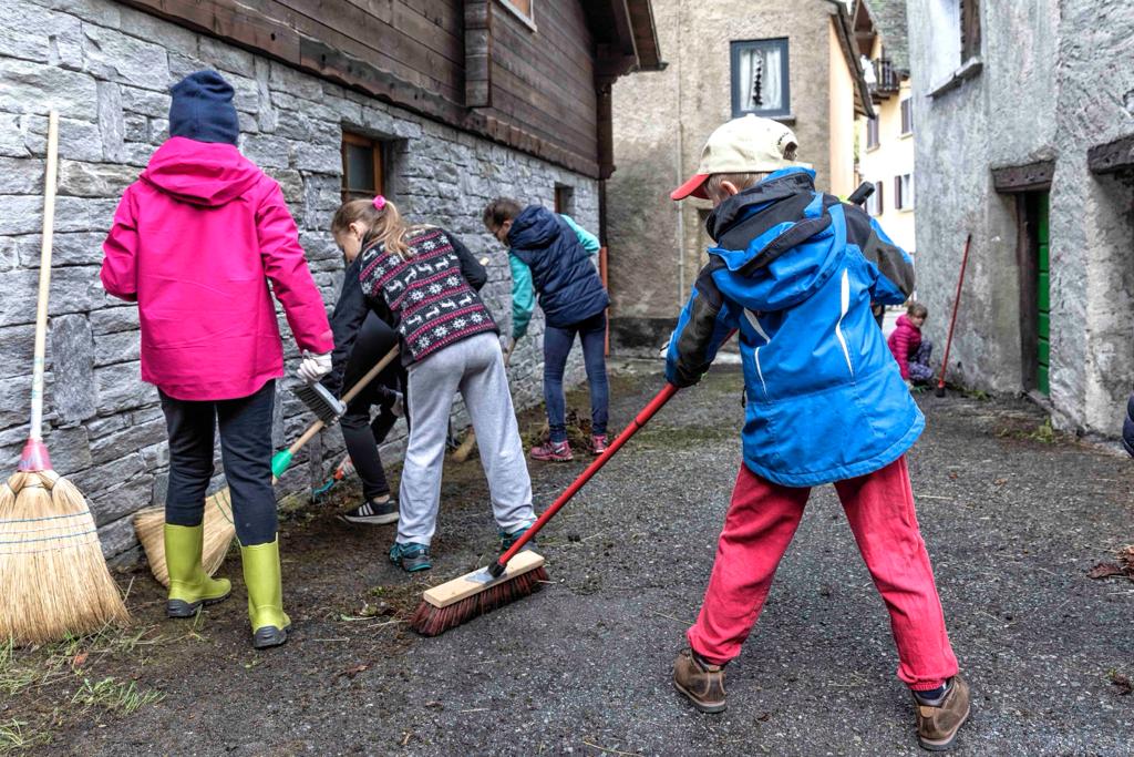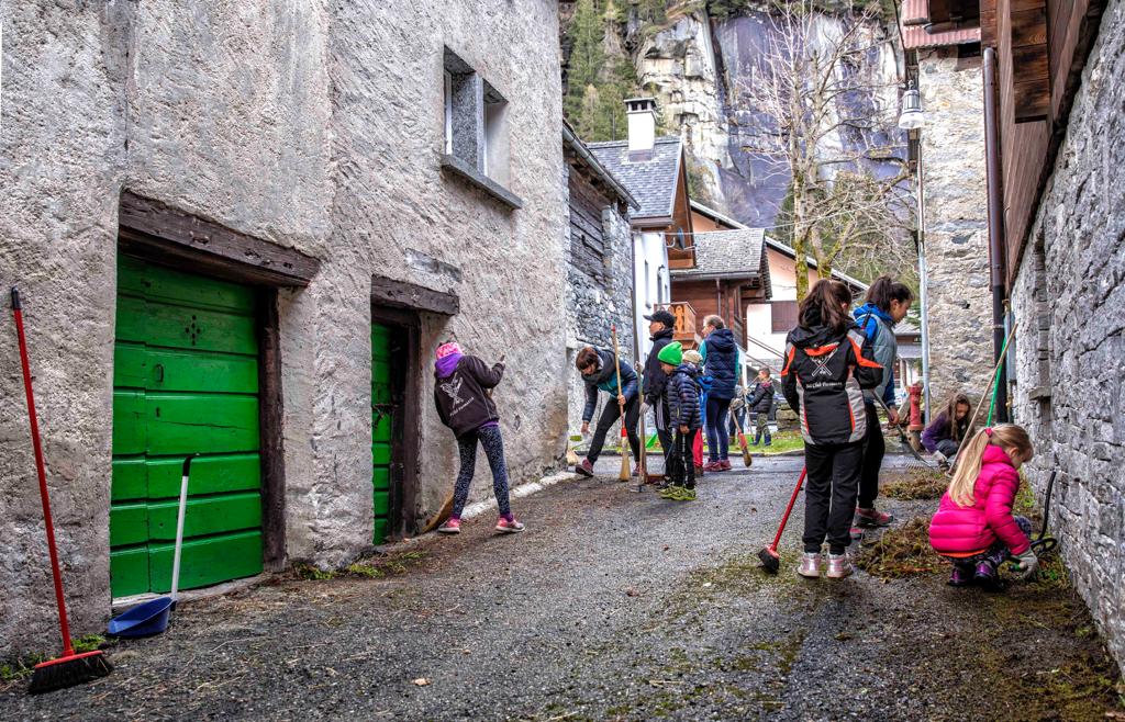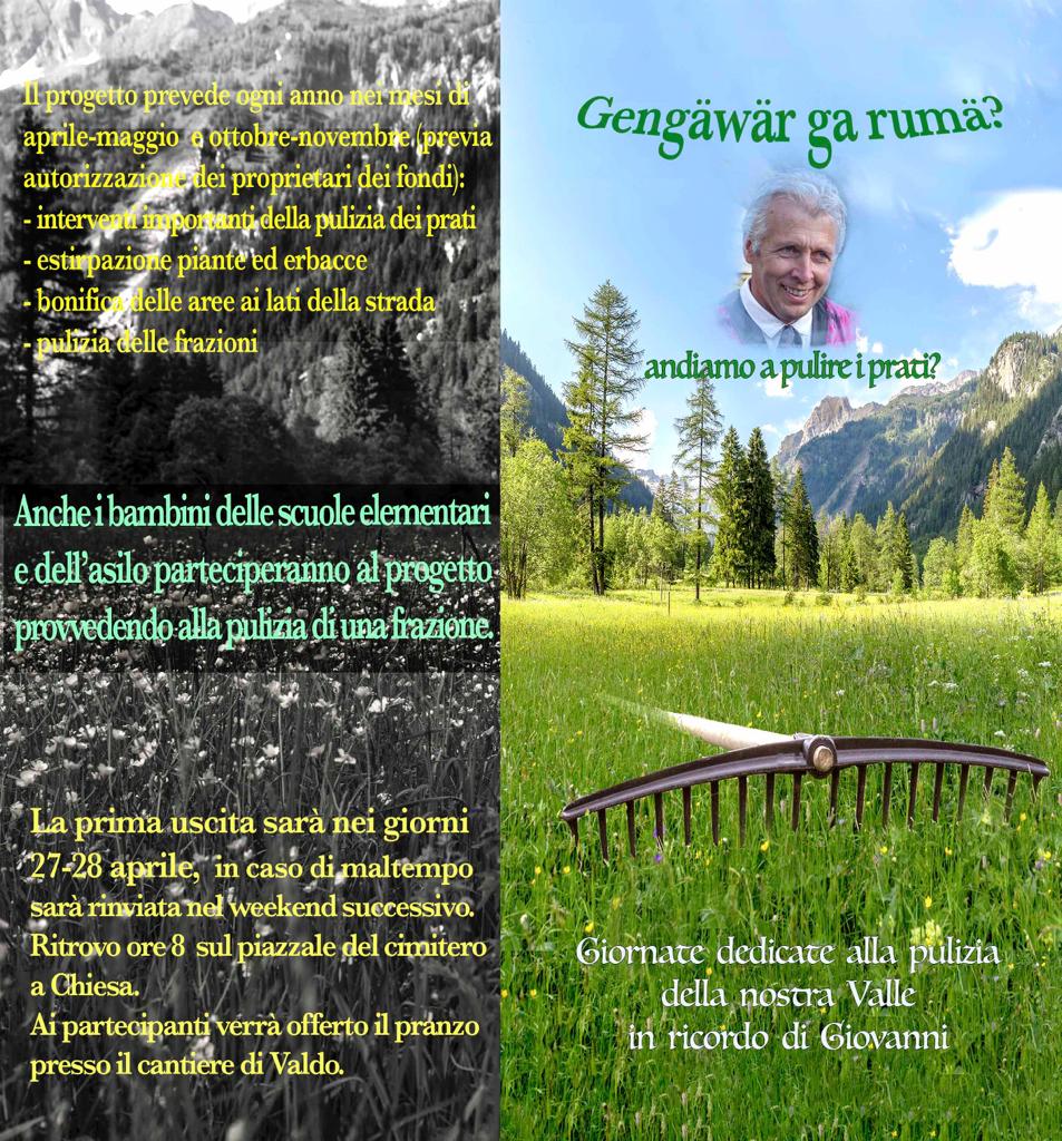 FORMAZZA- 27-04-2019- Tutta Formazza stamane si è ritrovata alle ore 8 per "Gengawar ga ruma?", prima delle due giornate (oggi e domani) che in italiano significano "Andiamo a pulire i prati'" dedicate al prematuramente scomparso Giovanni Della Ferrera: "I partecipanti, armati di rastrelli, motoseghe, scope e quant'altro si sono ritrovati nel piazzale antistante la chiesa parrocchiale e il cimitero dove riposa Giovanni Della Ferrera che ha guidato spiritualmente questo gruppo di volontari (uomini, donne, ragazzi e bambini) armati degli attrezzi necessari e, soprattutto dalla volontà di riprendere una usanza comunitaria che vedeva i valligiani, i Walser fare gruppo per uno scopo comune: il mantenimento del proprio territorio così faticosamente reso vivibile grazie al lavoro e alla tenacia dei primi colonizzatori intorno all’anno 1200 vivendo varie differenze meteorologiche. Sotto la regia di Roberto e Renato sono stati formati vari gruppi che hanno preso ciascuno l’appezzamento assegnato in frazione Chiesa, a questi se ne aggiungevano altri man mano che i minuti passavano. Malcontati almeno 60 persone tra adulti e ragazzi. Invece in frazione Fondovalle un nutrito gruppo di bambini di età scolare, coadiuvati da alcune mamme, hanno ripulito le vie (dette anche “strecce”, in titsch gasse) della località. Potendo guardare dall’alto si potrebbe vedere una miriade di colori che si muovono sui prati, tra boschi, tra arbusti, insomma, come laboriose formiche stanno omaggiando Giovanni che da lassù sarà contento e darà a queste persone la linfa necessaria!".