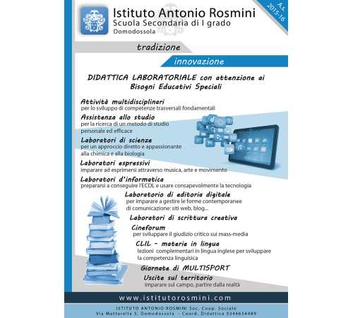 per le scuole medie Rosmini di Domo l'anno scolastico. Il primo giorno le lezioni inizieranno alle ore 9 e termineranno alle ore 12. L'orario della prima settimana è incentrato a presentare le novità e i laboratori didattici, in particolare il laboratorio di scienze, quelli espressivi, quello d'informatica, di editoria digitale, di scrittura creativa. In programma subito un cineforum ed un'uscita sul territorio. Per info: www.istitutorosmini.com