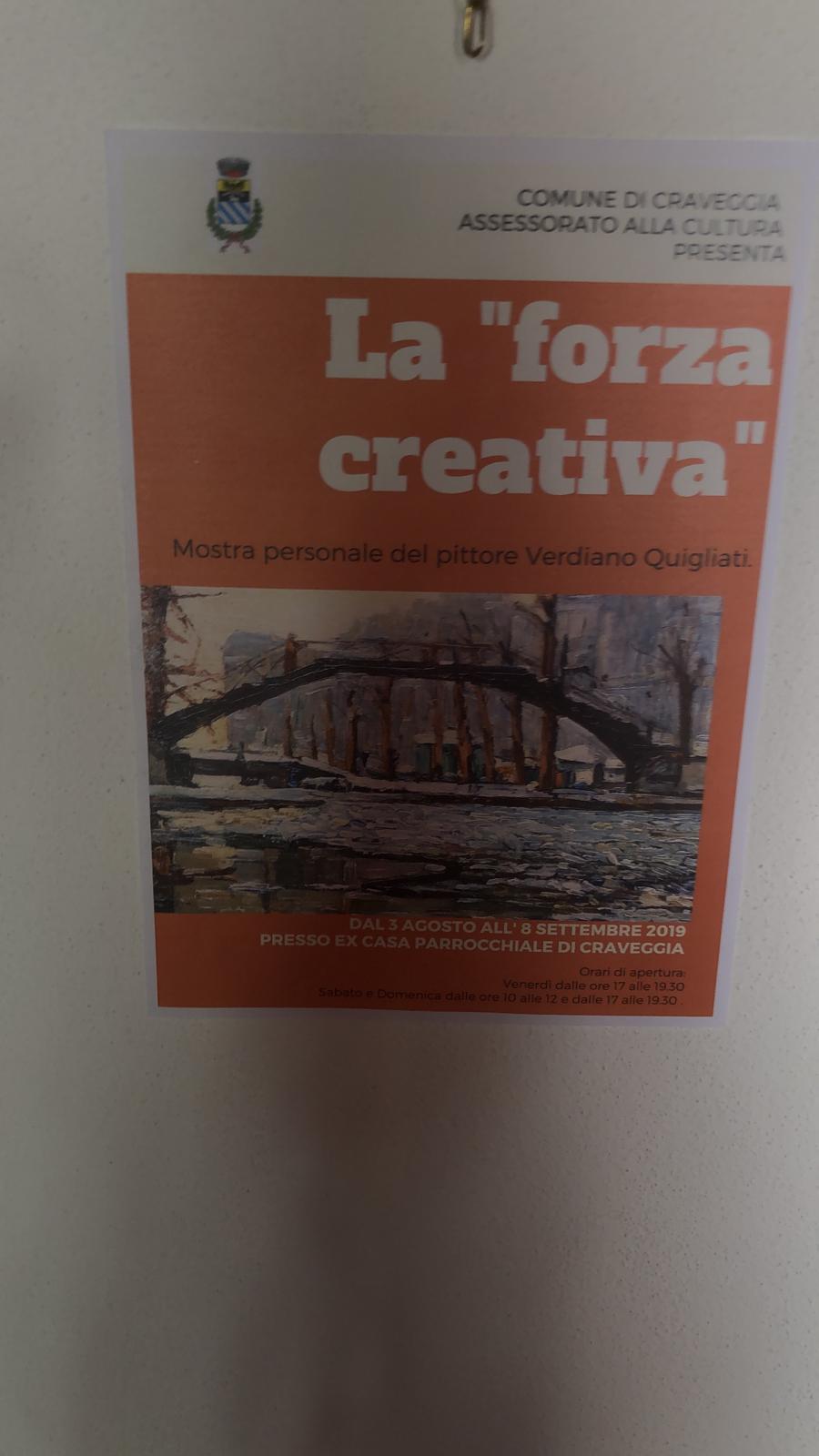 viene inaugurata la mostra retrospettiva dedicata al pittore Verdiano Quigliati,la mostra raccoglie opere di collezionisti,organizzata dall assessore alla cultura Stefano Ramponi con l’aiuto del sindaco di Craveggia Paolo Giovanola rendono omaggio a Quigliati nato a Novara ma trasferitosi in Valle Vigezzo per incontrare il maestro Carlo Fornara,la mostra viene chiamata Forza Creativa termine usato in uno scambio di lettere tra il pittore e il maestro,viene accompagnata da un catalogo cui vengono redatte tutte le opere del maestro e la prefazione è stata redatta dal giornalista Paolo del Debbio,la mostra rimane aperta fino all 8 settembre.