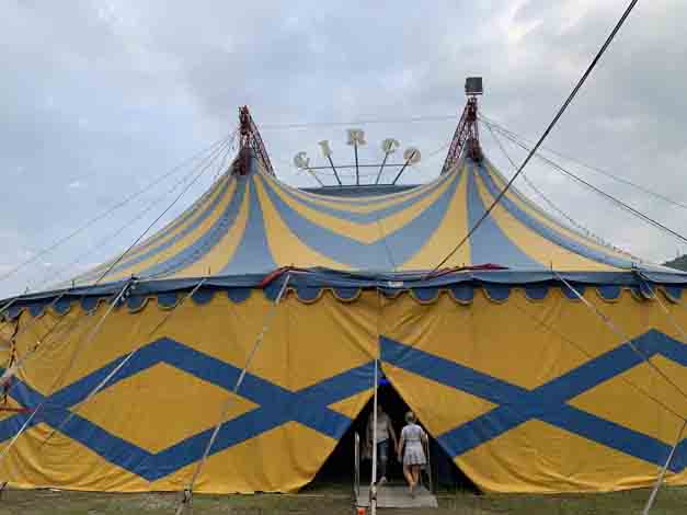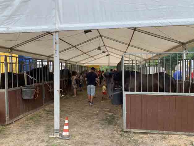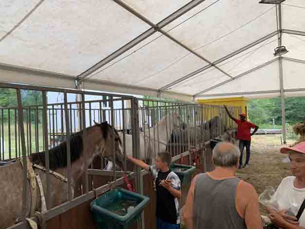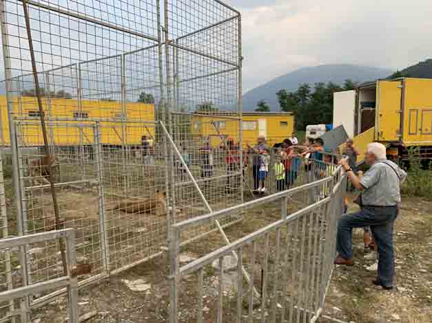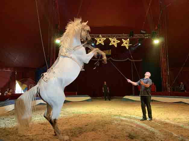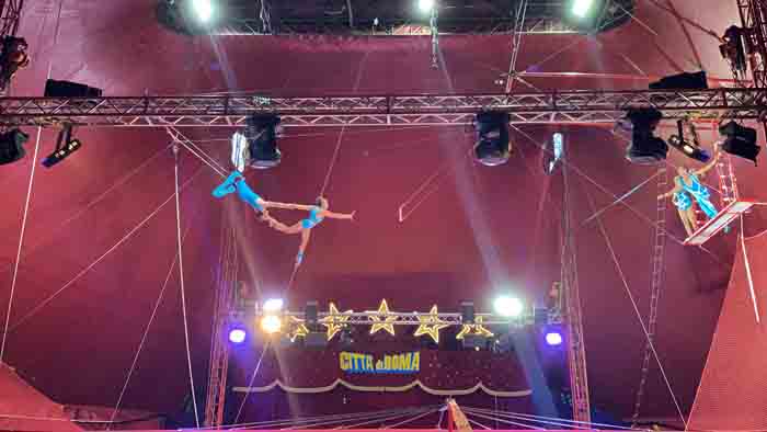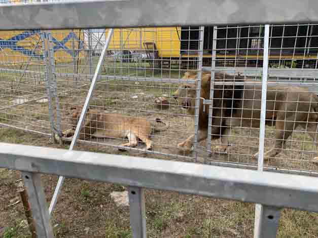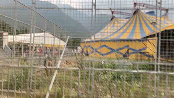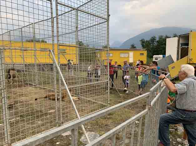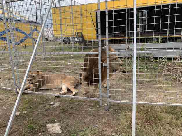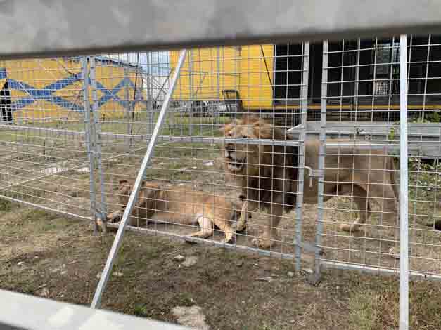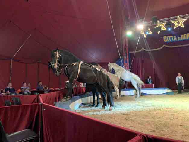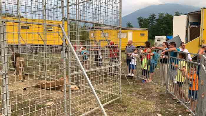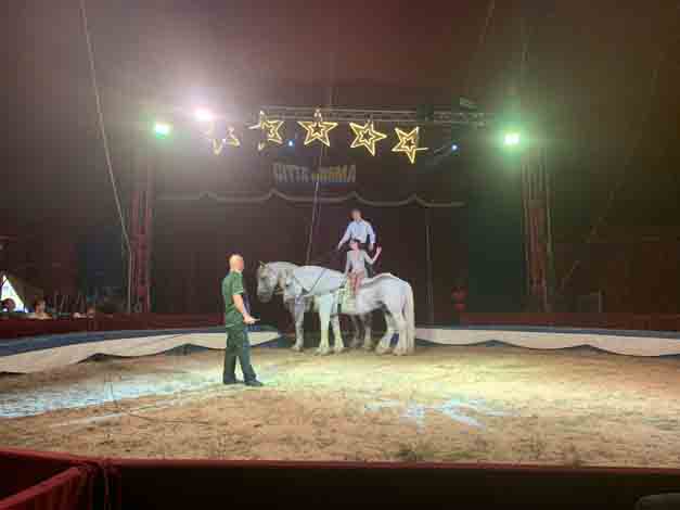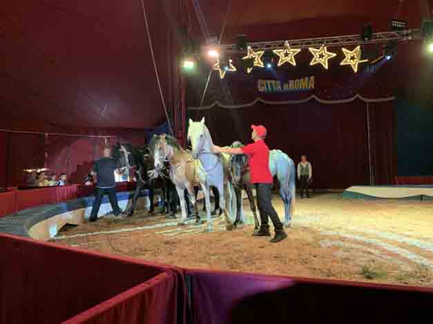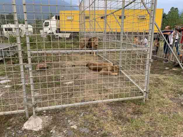 Durante l'intervallo (lo spettacolo dura più di un paio d'ore) si può visitare l'area dove sono tenuti gli animali. Un lungo capannone adibito a stalla ospita i cavalli, separati gli uni dagli altri, e poi c'è il recinto con i leoni, che non sono impiegati, almeno qui, nello show. Il recinto, con vasca per l'acqua, è adiacente al camion con la gabbia che trasporta i due leoni, maschio e femmina, ed è ovviamente il più gettonato dai visitatori. Per il resto dello spettacolo non ci sono animali, ma uomini e donne che si esibiscono un po' in tutto il repertorio classico di un circo: pagliacci, giocolieri,ballerine, e nel finale bravissimi trapezisti.
