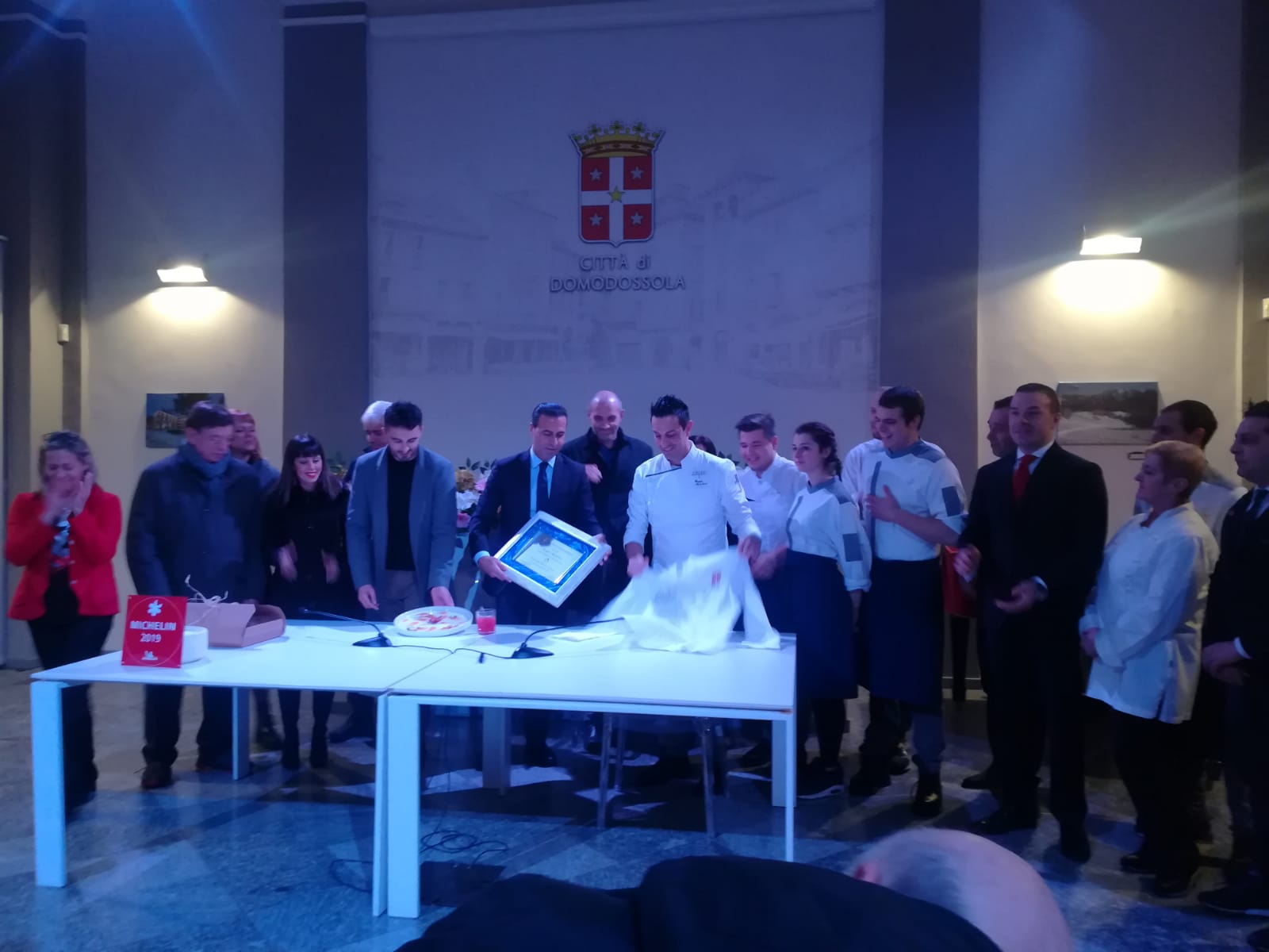 di Domodossola ha celebrato questa sera in Cappella Mellerio la prima stella Michelin ossolana: lo chef Giorgio Bartolucci, titolare del ristorante Atelier a Domodossola. "É il coronamento di un percorso importante a cui si arriva con impegno e professionalitá" ha detto il sindaco Lucio Pizzi che ha omaggiato Bartolucci con una speciale targa e una giacca da chef con il logo della cittá di Domodossola. "Ringrazio in particolare la mia famiglia che é alla base di quello che ho costruito e i miei collaboratori" ha detto lo chef stellato. La serata é proseguita con un ottimo buffet cocktail con le specialità firmate dallo chef stellato.