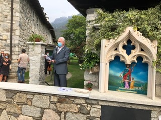 MERGOZZO - 20-09-2020--Con una toccante cerimonia, ricca di commozione e devozione, è stata inaugurata sabato mattina in via Borrette una cappella votiva a Santa Sofia, protettrice dei tumori e delle malattie infettive. Una bella opera, dipinta da Giorgio Baroni, e realizzata dalla famiglia Tancredi particolarmente devota a questa santa.