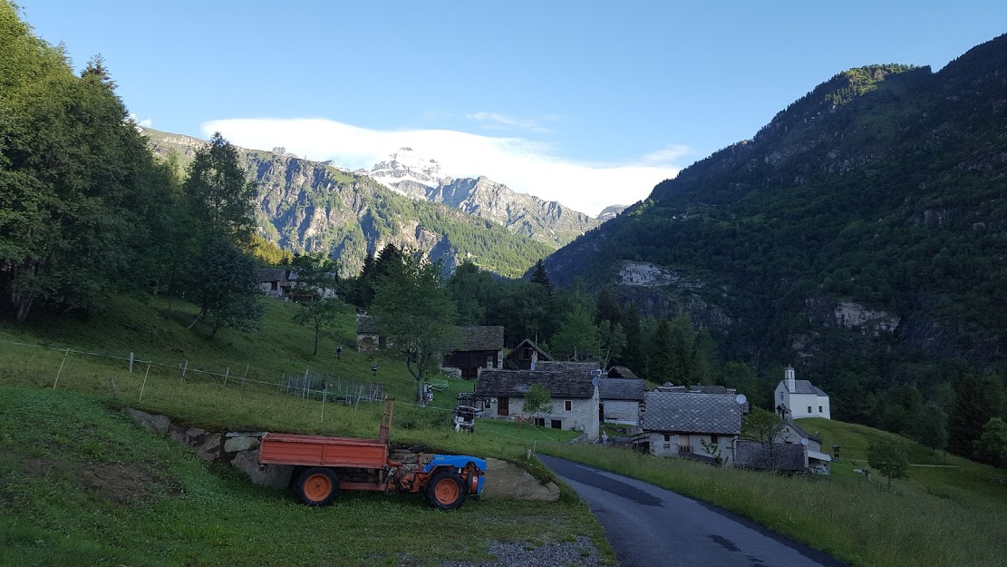 Dopo il caffè a Baceno passiamo Croveo e, appena superato il ponte sul torrente Devero, parcheggiamo in prossimità della sbarra chiusa che regola l’accesso a Esigo lungo la strada, sicuramente costruita al 100% con fondi privati. Se no, perché sarebbe chiusa per i contribuenti italiani? Siamo a quota 1000. Seguendo la strada ed un ultimo tratto di sentiero, raggiungiamo in venti minuti l’Oratorio di San Rocco, oltre il quale si apre davanti a noi il vasto altopiano di Esigo. Ci troviamo nell’ampio versante fra i contrafforti di Diei e Cistella a sud ovest e la Valle Devero a nord est. Continuiamo lungo la strada passando da I Pontigioli e ad un bivio proseguiamo fino all’Alpe Agarù,1368. Teniamo la destra, direzione Brumei.