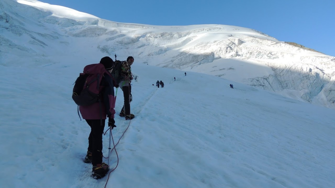 Conviene rimettersi in cammino. In meno di un’ora scendono 30 cm di neve e finalmente capisco, innalzando lodi a Giuliacci ed ai meteorologi della Confederazione, a cosa servano le famose piastre anti-zoccolo, di cui i miei ramponi non sono dotati, a differenza degli amici professionisti. Per fortuna a metà discesa smette di nevicare, torna il buonumore ed una cordata trova anche il tempo di fare un’esercitazione di sicurezza su ghiaccio nel “punto chiave”. Al campo base ci rimettiamo in sesto, tutti allegri e felici.