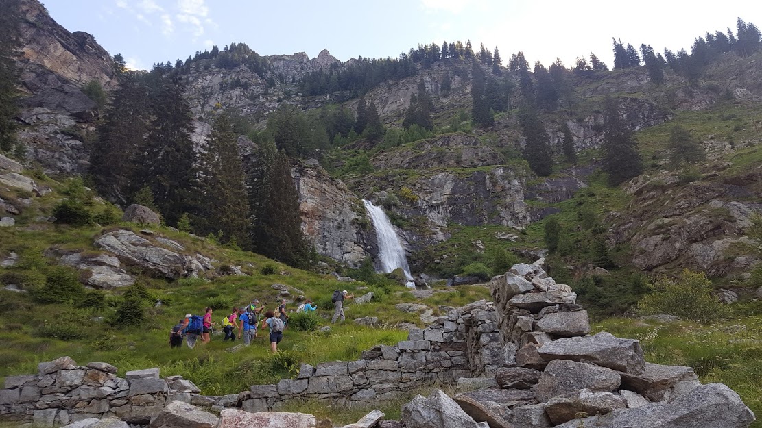 Siamo in dodici con due esperte signore e due forti fanciulle. Oggi, per un’escursione di un certo impegno, è presente il meglio del gruppo in fatto di tecnica ed esperienza. Manca soltanto una vecchia roccia walser, sostituito più o meno bene dal fantasma di un ex alpinista. Previa accurata informazione, saliamo in auto ai parcheggi di Campliccioli, 1352. La giornata è splendida e già sul muraglione della diga si impongono le prime foto panoramiche e di gruppo. Oltre la diga svoltiamo a sinistra, attraversiamo la galleria e procediamo in piano fino ad attraversare il rio Banella. Poco oltre inizia a salire il sentiero C34, abbastanza faticoso, con qualche strappo taglia – gambe e con qualche gradino per giocatori di basket N.B.A.. Sulla nostra destra la bella cascata del rio Banella.