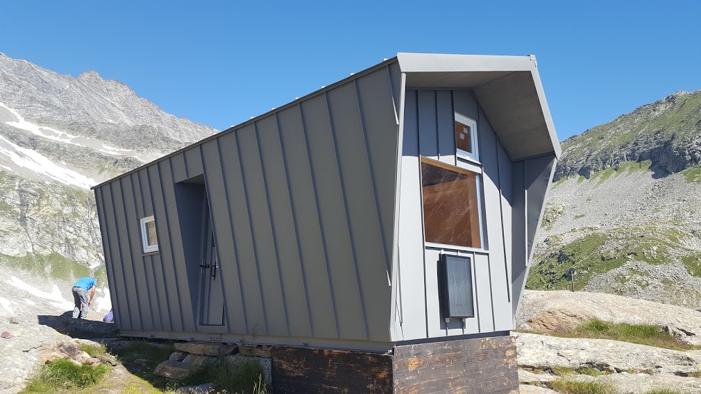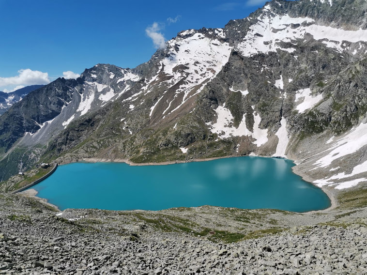 Più in alto la pendenza si addolcisce e, dopo un’ora e mezza dalla diga, siamo all’Alpe Banella, 1807. Poco prima un veniale errore di percorso dell’ex alpinista, distratto come sempre dalla presenza di quattro belle ragazze, gli procura i primi improperi della sua lunga giornata. Dopo una breve pausa comincia il bello. Chi si lamentava del sentiero fin qui percorso non può immaginare che, non più all’ombra ma ben arrostiti dal sole di un luglio molto caldo, dobbiamo ora affrontare pendii ancora più cattivi, ad iniziare dal cosiddetto “Scalone”. Non sono in giornata e soffro più degli altri. Passando dall’Alpe Scarone, 2031, dove incrociamo la funivia dell’ENEL, arranco in fondo al gruppo fino alla diga di Camposecco, 2325. Camminiamo da tre ore. Ammiriamo subito il nuovo bivacco delle Aree Protette dell’Ossola, gemello di quelli già incontrati al Passo d’Antigine, alle Caldaie di Veglia e nell’alta Val Quarazza. Qui il sentiero C34 incrocia il C99 della GTA, proveniente dalla Valle di Saas via Antigine e Cingino, che prosegue verso l’alta Valle del Loranco e il Rifugio Andolla attraverso il Passo delle Coronette. Percorriamo il colossale muro della diga e seguiamo il C99, ben segnato.