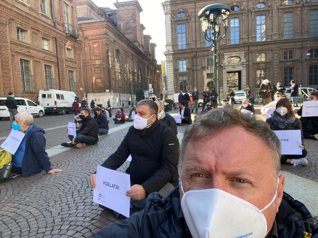 Fipe del Vco, guidata dal presidente AscomVco e vicepresidente di Confcommercio Alto Piemonte Massimo Sartoretti, in piazza a Torino mercoledì mattina per manifestare contro le limitazioni del Dpcm che colpiscono duramente varie categorie, tra cui i ristoratori. La protesta li ha portati ad”apparecchiare” simbolicamente la piazza.