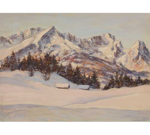 DOMODOSSOLA - 13-2-2023 -- La montagna di Garmisch-Partenkirchen nella tela a olio di Fritz Osswald (1878 – 1966), protagonista della mostra del martedì da Sali&Pistacchi a Domodossola (piazza Mercato). L'esposizione è curata da Museo Immaginario – L'École des Italiens, M.me Webb Editore. L'artista elvetico Fritz Osswald, attivo in un periodo di grandi sconvolgimenti nel mondo dell'arte (e non solo) seppe mantenere una rara coerenza di stili e temi, privilegiando il racconto poetico della montagna.