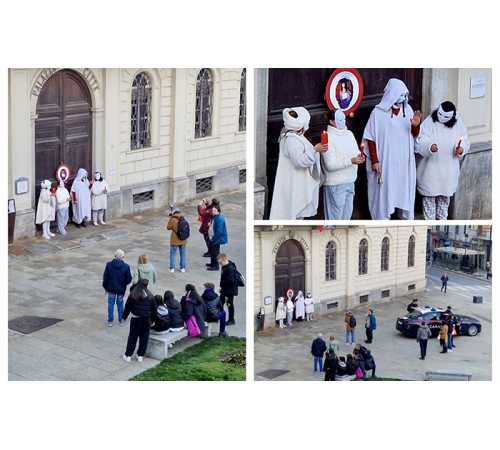 DOMODOSSOLA – 17-2-2024 La pittrice Bruno Margherita Andrea, in arte Grafffio (sì con tre f), ha organizzato una sfilata silenziosa e pacifica con i partecipanti vestiti di bianco con una maschera dello stesso colore, una candela rossa accesa e un cartello con la scritta “Vietato calpestare i sogni” lasciato all’entrata di Palazzo di città.