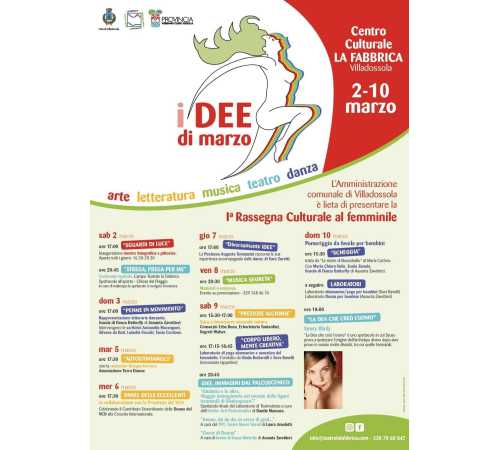 Il programma prevede: sabato 2 marzo “Sguardi di Luce”; annullato per maltempo (doveva svolgersi all'aperto), lo spettacolo teatrale “Strega, prega per me”; domenica 3 “Penne un movimento”; martedì 5 “Autostimiamoci”; mercoledì 6 “Panel delle Eccellenti”; giovedì 7 “Diversamente iDEE”; venerdì 8 ”Musica segreta”; sabato 9 “Preziose Alchimie” e “Corpo libero, Mente creativa” e “IDEE, Immagini dal Palcoscenico”; domenica 10 “Scheggia”, “Laboratori” e “La Dea che creò l'Uomo”.