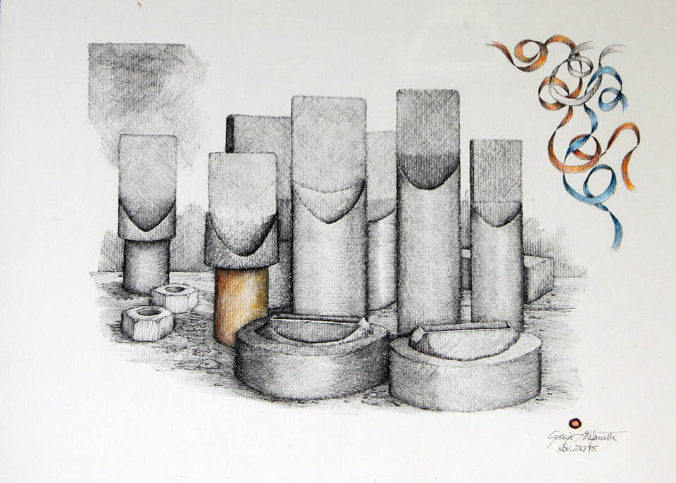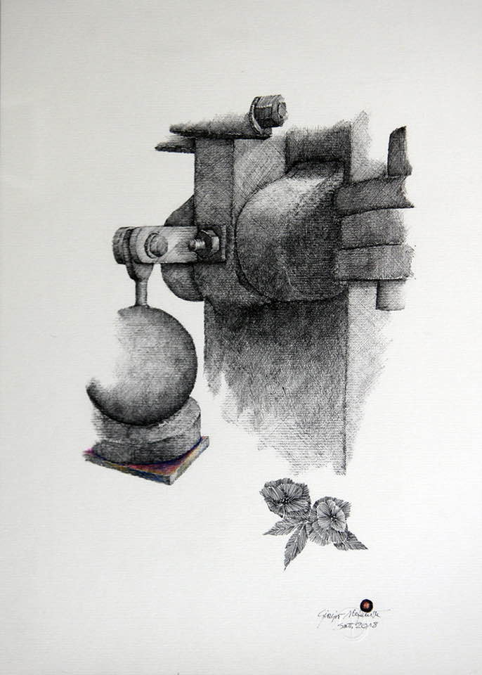 Sono in esposizione 35 opere a china di Giorgio Stefanetta, impreziosite da qualche tocco di pastello, che ritraggono dettagli di macchinari: ingranaggi, bulloni, pulegge, bilancieri, caviglie, chiavarde e altre attrezzature provenienti dalla storica “Bolloneria A. Morino & C.” di Vogogna. Questa fabbrica, purtroppo chiusa da alcuni anni, è stata per tutto il secolo scorso la realtà economica e trainante non solo per uno dei più incantevoli borghi d’Italia, ma anche per l’Ossola.