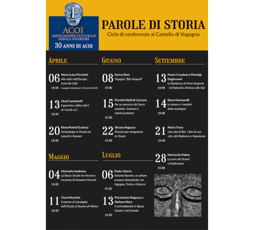 VOGOGNA - 20-3-2024 -- Un ciclo di incontri e conferenze dedicati alla storia locale. L'associazione culturale Ossola Inferiore (Acoi) festeggerà con "Parole di Storia" i 30 anni dalla fondazione. Da aprile a settembre nel castello Visconteo di Vogogna, relatori e personalità d'eccezione offriranno una visione suggestiva della storia "Non quella che siamo soliti conoscere - affermano gli organizzatori-, ma quella fatta di approfondimenti, curiosità, riflessioni, ipotesi e resoconti".