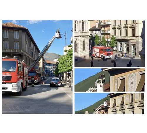 DOMODOSSOLA- 24-04-2024-- Intervento dei Vigili del fuoco domesi nel centralissimo corso Fratelli Di Dio a Domodossola nel tardo pomeriggio di mercoledì. Grazie all'intervento dell'autoscala è stato messoin sicurezza il cornicione di un edificio dal quale si erano staccati dei calcinacci.
