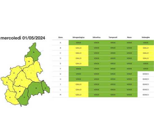 PIEMONTE -30-04-2024-- Allerta gialla mercoledì 1° maggio sulle pianure e sulle zone alpine e prealpine occidentali e nordoccidentali. Lo prevede il bollettino emesso da Arpa Piemonte. Le condizioni meteorologiche sono previste in peggioramento con piogge diffuse, anche a carattere di rovescio, moderate sulla parte orientale nella serata di martedì 30 aprile.