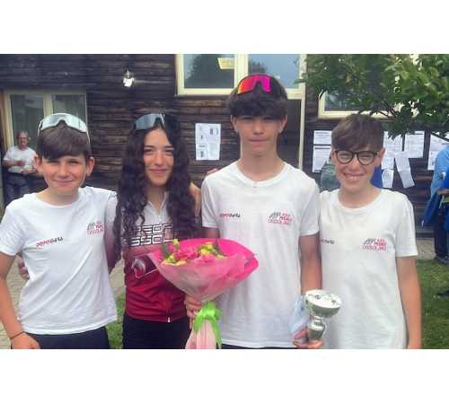 BIELLA – 10-6-2024 -- A Gaglianico, in provincia di Biella, ieri domenica 9 giugno si è disputata l’ottava edizione del Trofeo Ilario Ormezzano Sai per esordienti dove nei 2° anno Sergio Globo è salito sul 3° gradino del podio nella gara vinta da Mirco Mazzoni (Esperia Piasco) che ha chiuso i 46 km del percorso, un circuito cittadino in falsopiano da ripetere 10 volte, in 1h18’23” alla media di oltre 35,2 km/h. Appena fuori dalla top ten, 11mo, il compagno di squadra Vittorio La Fata.