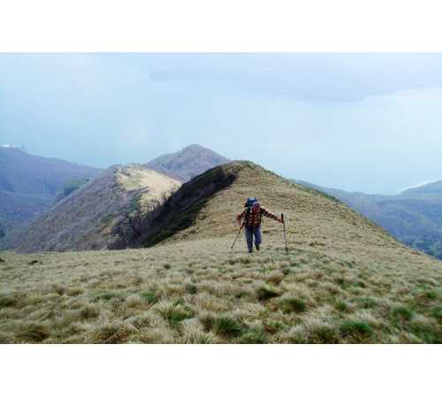 Da L'Agher alla cima si devono inserire le ridotte, la pendenza è inclemente. Dopo una “ripida” ora finisce anche il bosco e ci troviamo sulla dorsale est - ovest che porta in vetta. Fortunatamente non picchia il sole e il fresco allevia le nostre sofferenze. Una bella vipera si fa trovare in mezzo al sentiero, semi addormentata dopo il lungo letargo e priva di intenzioni bellicose. Ci limitiamo a spostarla delicatamente. Uccidere le vipere non serve a niente. Se non tenti di accarezzarle a mani nude o se non le calpesti a piedi scalzi, si fanno i fatti loro e svolgono la loro utile funzione nella catena biologica.