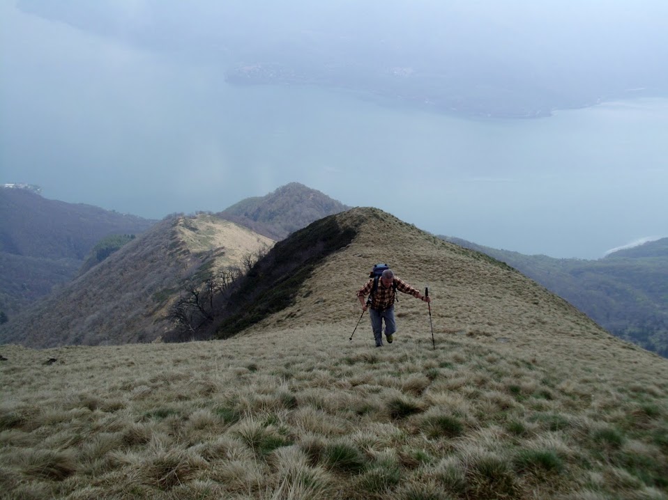 Ancora tre quarti d'ora, aiutati anche da qualche catena, utile ma non indispensabile, e siamo in vetta, 1715. C'è ancora qualche piccola chiazza di neve sul versante occidentale, verso la Valle Cannobina. La dura salita ha fatto una certa selezione, ma ci ricompattiamo rapidamente. Qualche foto di gruppo e alla parte di panorama che le nuvole vaganti ci concedono ed inizia la discesa in direzione sud, su traccia, sentiero e strada sterrata nell'ultimo tratto. Siamo sul versante occidentale della lunga dorsale che dal Monte Giove sale verso nord, al Faierone ed al Limidario.