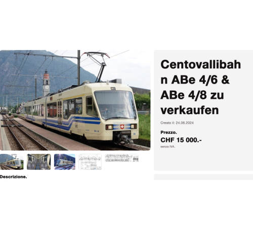 Adesso l'offerta si amplia e sul sito sbbresale.ch, portale sul quale viene venduto materiale ferroviario di seconda mano, in vetrina ci sono sette convogli della Centovallina attualmente in servizio. Hanno una trentina d'anni e sono offerti a 15.000 franchi l'uno.