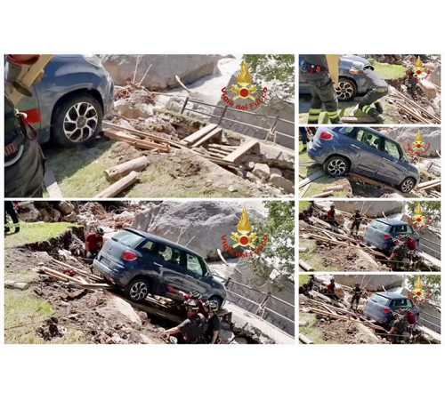 MACUGNAGA- 02-07-2024-- Sono continuati per tutta la giornata da parte dei vigili del fuoco gli interventi di rimozione detriti e recupero beni nell'area interessata dall'alluvione che ha colpito Macugnaga la notte del 29 giugno. Predisposto ed effettuato da squadre specialistiche dei vigili del fuoco il recupero in sicurezza dell'automobile che era rimasta in bilico sull'argine eroso dalle acque in piena del fiume Anza.