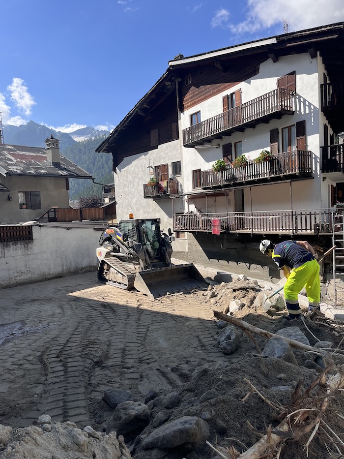 MACUGNAGA - 6-7-2024 -- Canticchiano gli alpini con i badili in mano. Le schiene ricurve movimentano le pietre, la ghiaia e la fanghiglia che ha invaso le strade e gli scantinati di Macugnaga tra il 29 e il 30 giugno scorsi. Dall’alto, la parete est del Monte Rosa, coi suoi ghiacci perenni, vigila immobile sul lavoro delle decine di volontari di Protezione Civile accorsi in aiuto della popolazione locale.