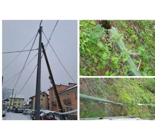 Con le nevicate di Marzo, lungo la Via Marconi a Baceno un palo si è spezzato, come da immagine qui allegata ed ancora oggi, nonostante le richieste di intervento da parte del sottoscritto, il palo risulta divelto ed appeso al cavo che dovrebbe sorreggere.